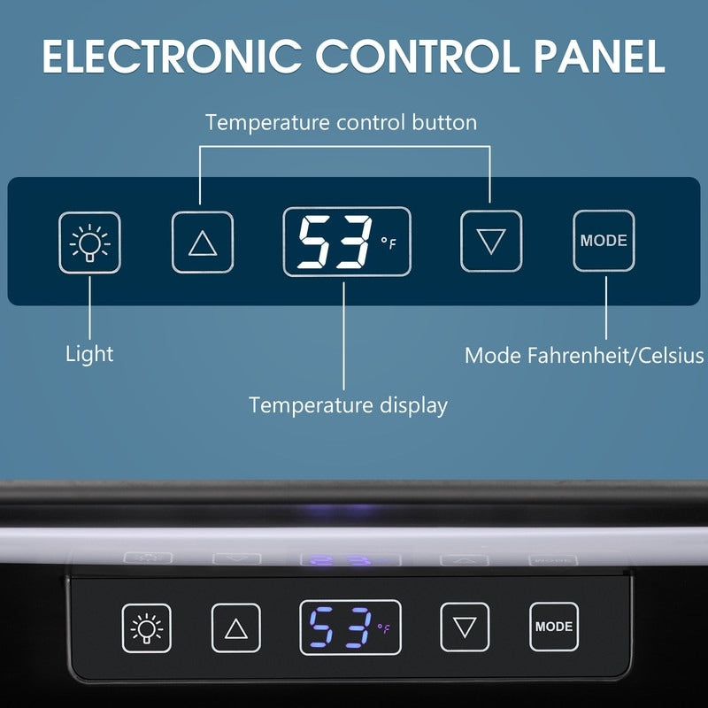 - POWERFUL COOLING EFFECT: The temperature of the refrigerator is controled by an electronic touch control. This mini wine cooler has an operating temperature range of 40°F-61°F and is equipped with a rotary thermostat for self-adjustment (55°F is generally considered the optimal temperature). Heat is the number one enemy of wine and drinks. It allows you to store your wine and beverages in optimal conditions for long-term aging. This built-in beverage cooler will be a great addition to your kitchen, bar, office and restaurant!