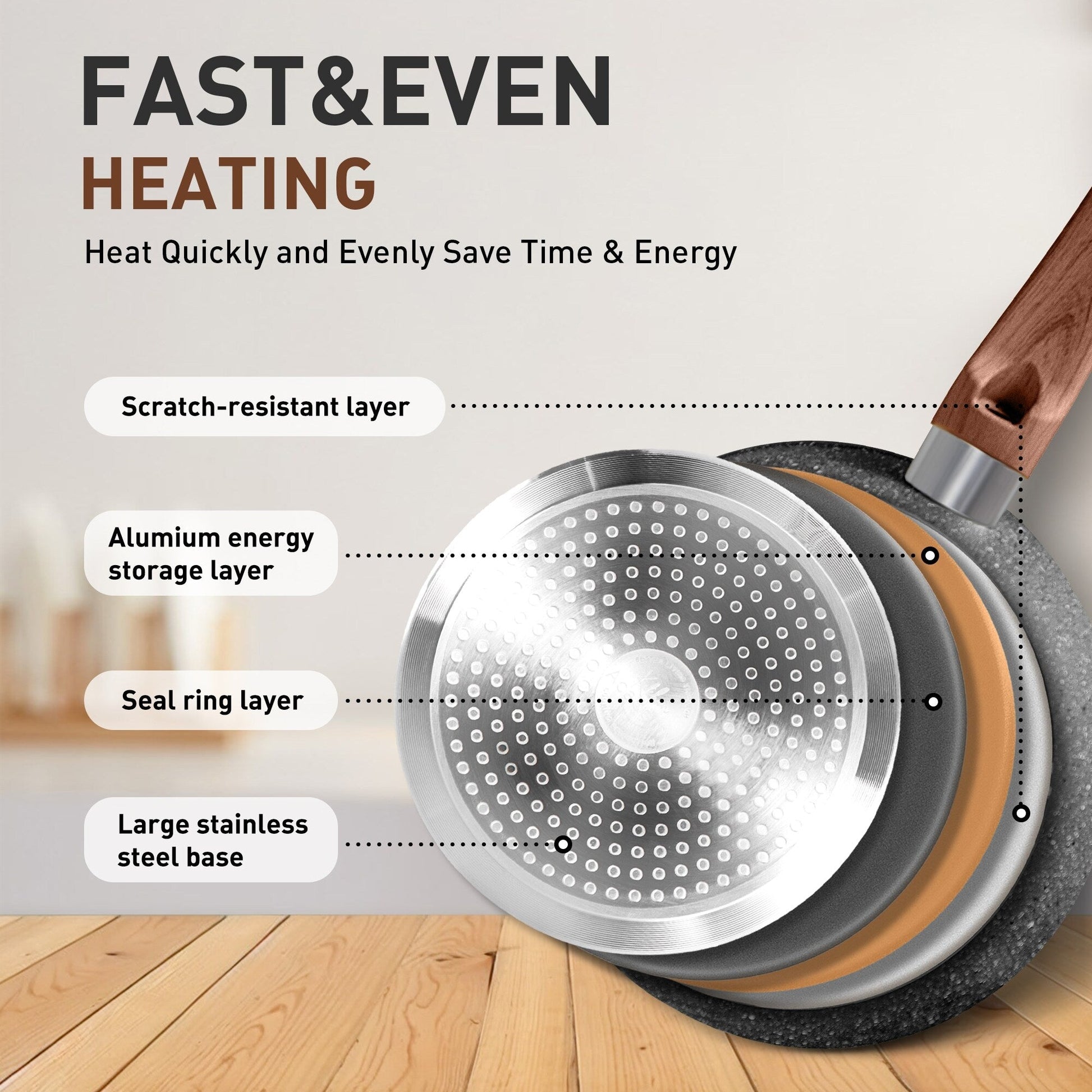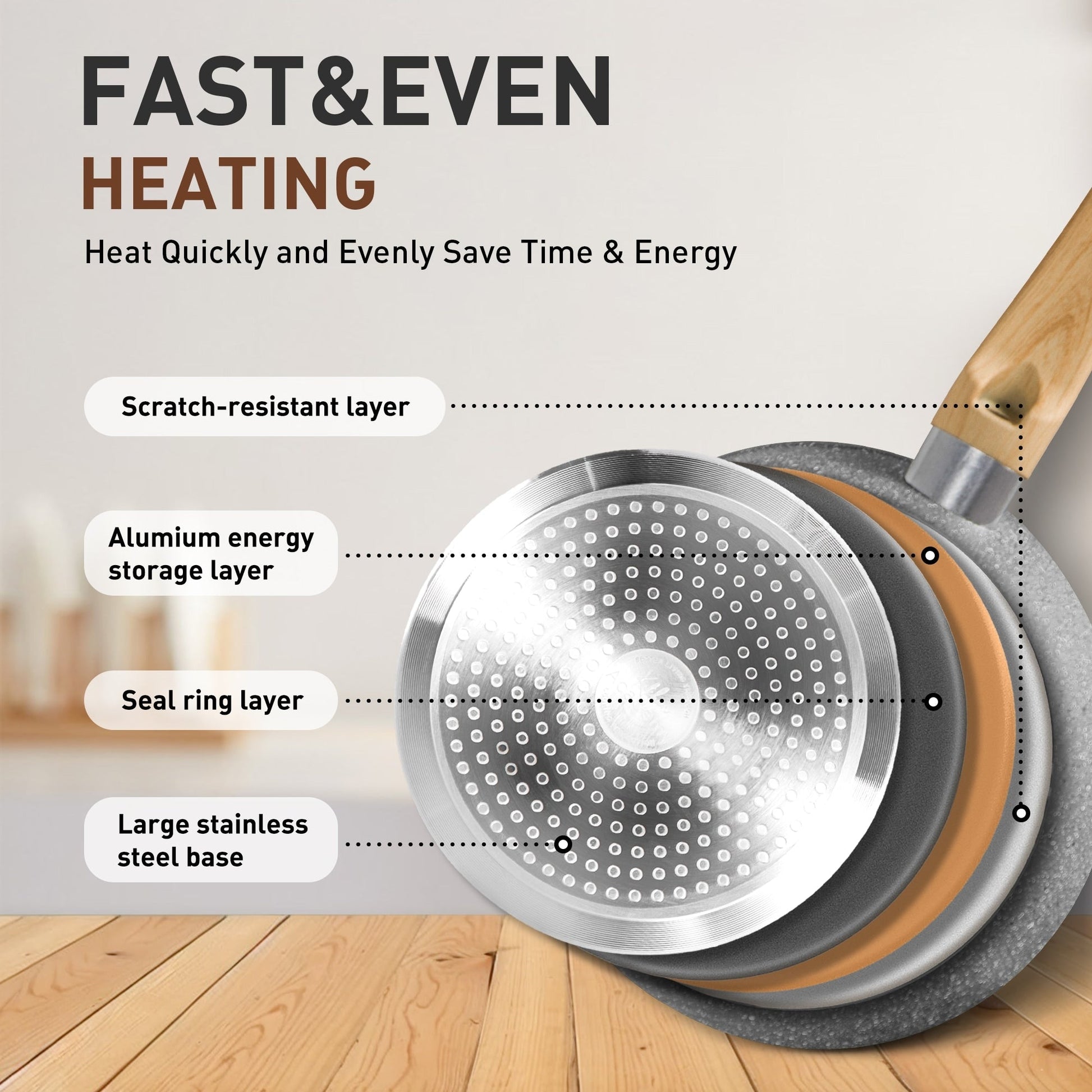 Induction Kitchen Cookware: When it comes to the interior, this cookware uses an aluminum core. The result is that the pan heats up quickly, and more importantly, distributes heat evenly. The cookware set works on all major types of cooktops. A larger high magnetic conductive stainless steel base ensures Induction compatibility, Gas stove compatibility, Electric stove compatibility, and especially glass stove Compatibility.