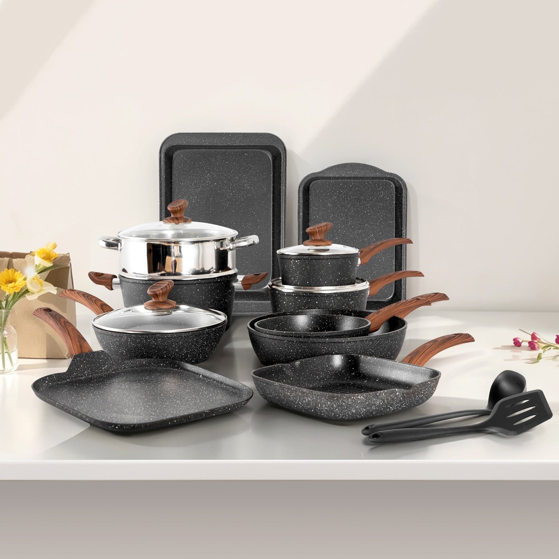 17-Piece Kitchen Granite Cookware Set, Non-stick Cooking Pots and Pans Set