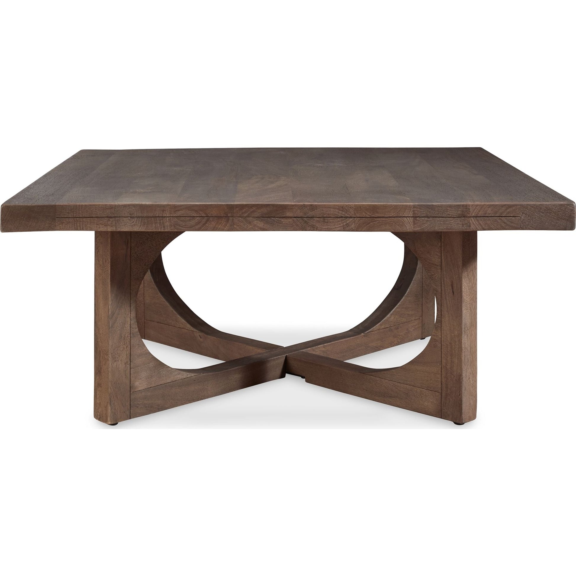 Pique your visual interest with this coffee table. In a medium brown finish, this sculptural piece is part art form, part everyday function. The chunky “X” base with circular cutouts wows with geometric style, supporting family photos, decorative books or everyday essentials with forward-thinking flair.