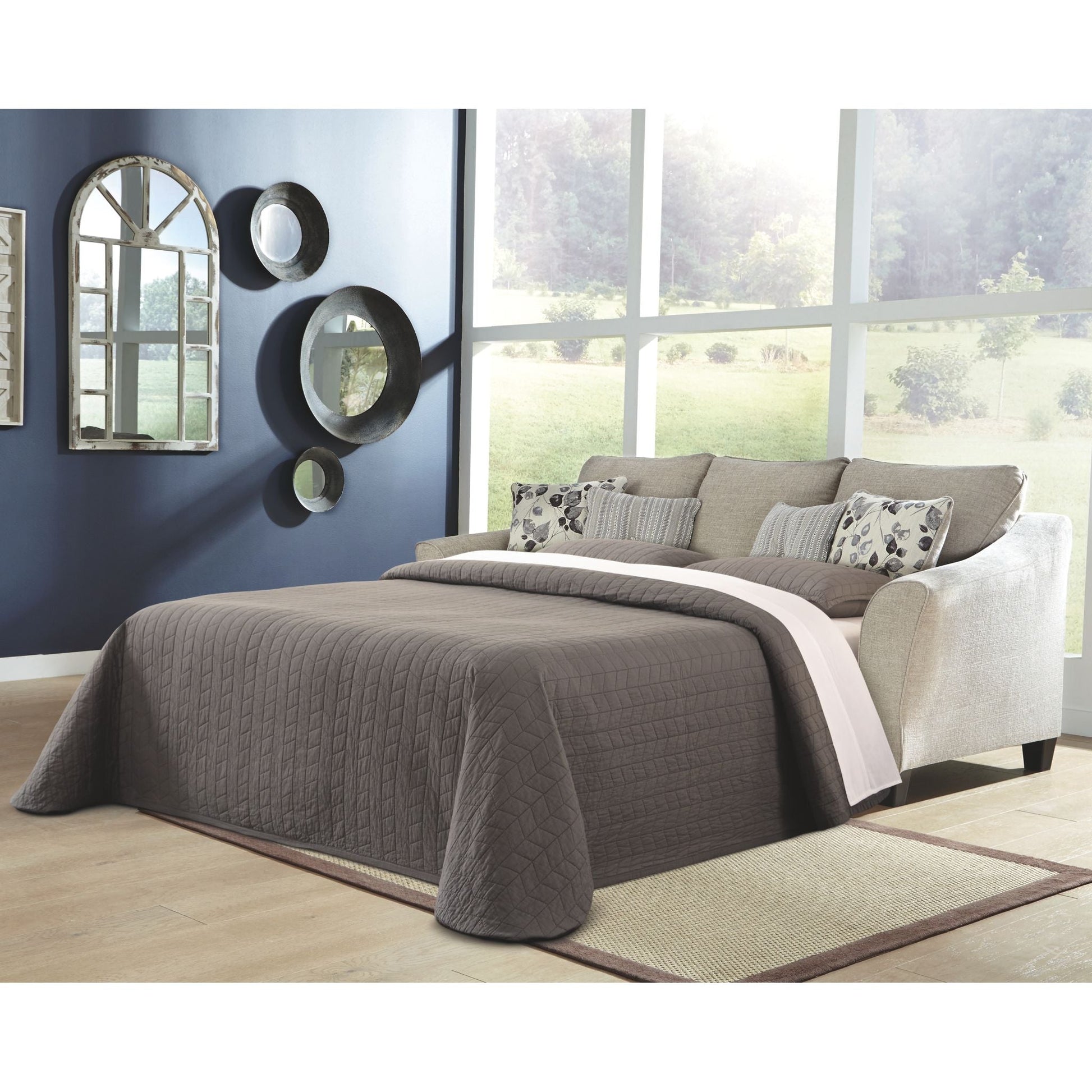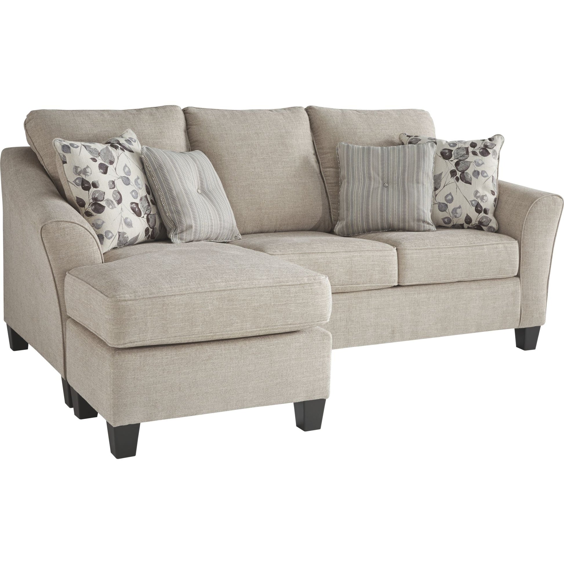 Raising understatement into an art form, this sofa chaise sleeper impresses with a tailored silhouette. Designed in a warm neutral color perfect in any contemporary home, this sofa chaise sleeper is wonderfully versatile with loose seat cushions that allow you to flip the chaise from left to right. Coordinating toss pillows complete this look for a style that feels right at home. Crafted of quality memory foam, a queen pull-out mattress comfortably accommodates overnight guests.