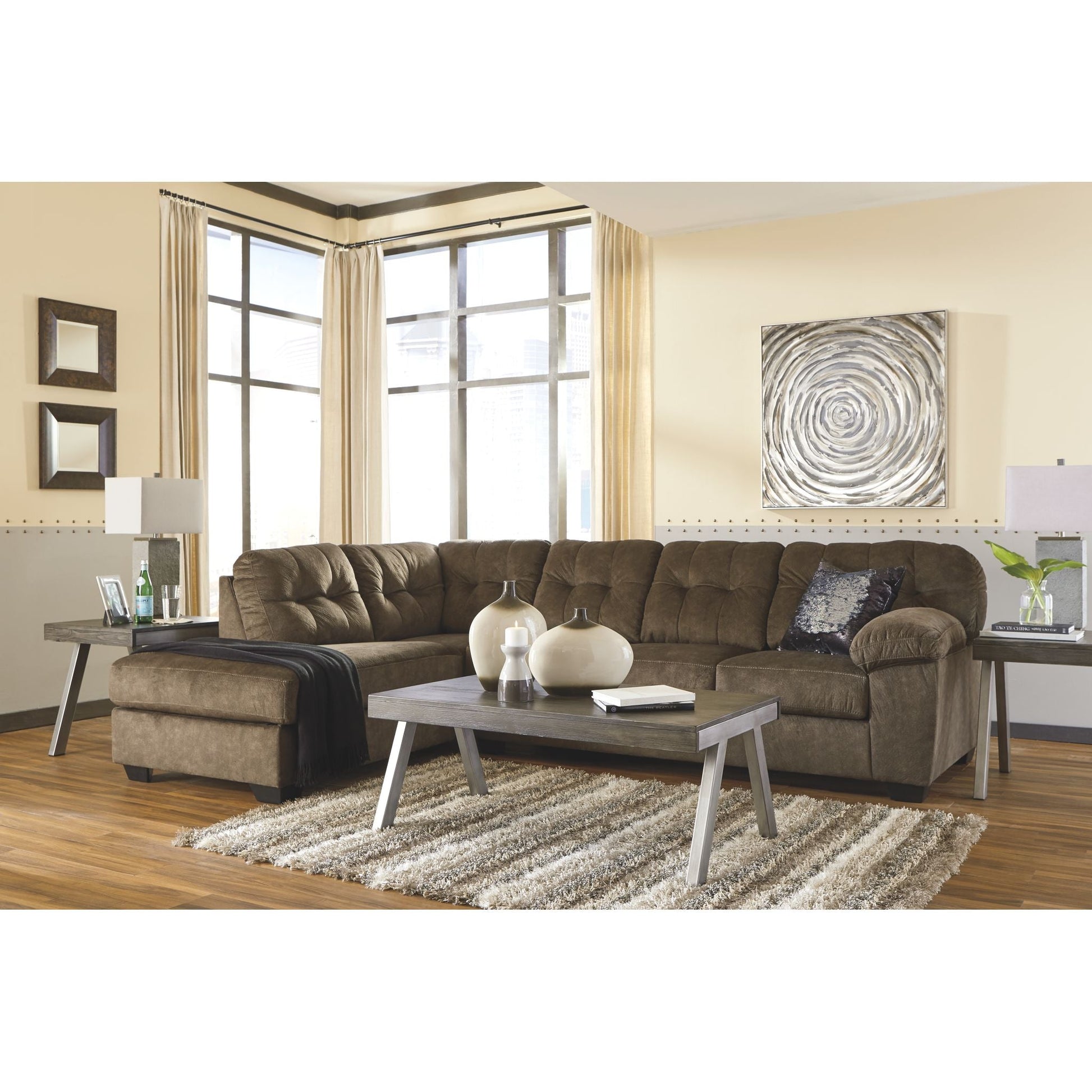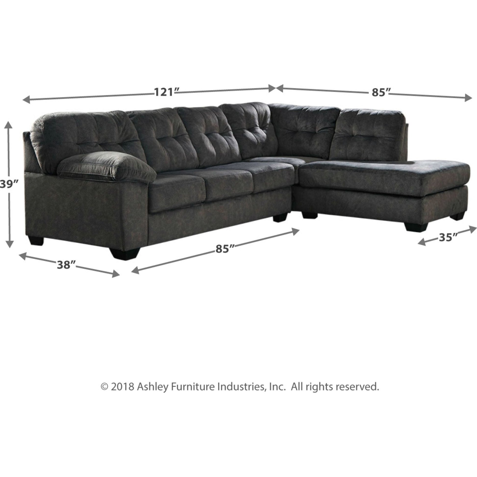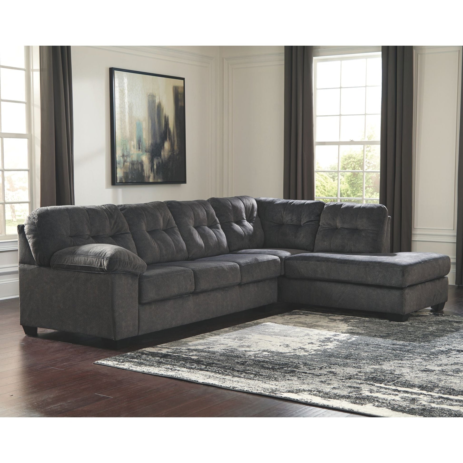 Looking for the perfect blend of decadent comfort and contemporary flair? Feast your eyes on this sectional. Tufted box cushioning and thick pillow top armrests brilliantly merge style and a sumptuous feel. Wonderfully plush to the touch, the sectional’s granite gray fabric is the ultimate choice for a chic, trendy look.