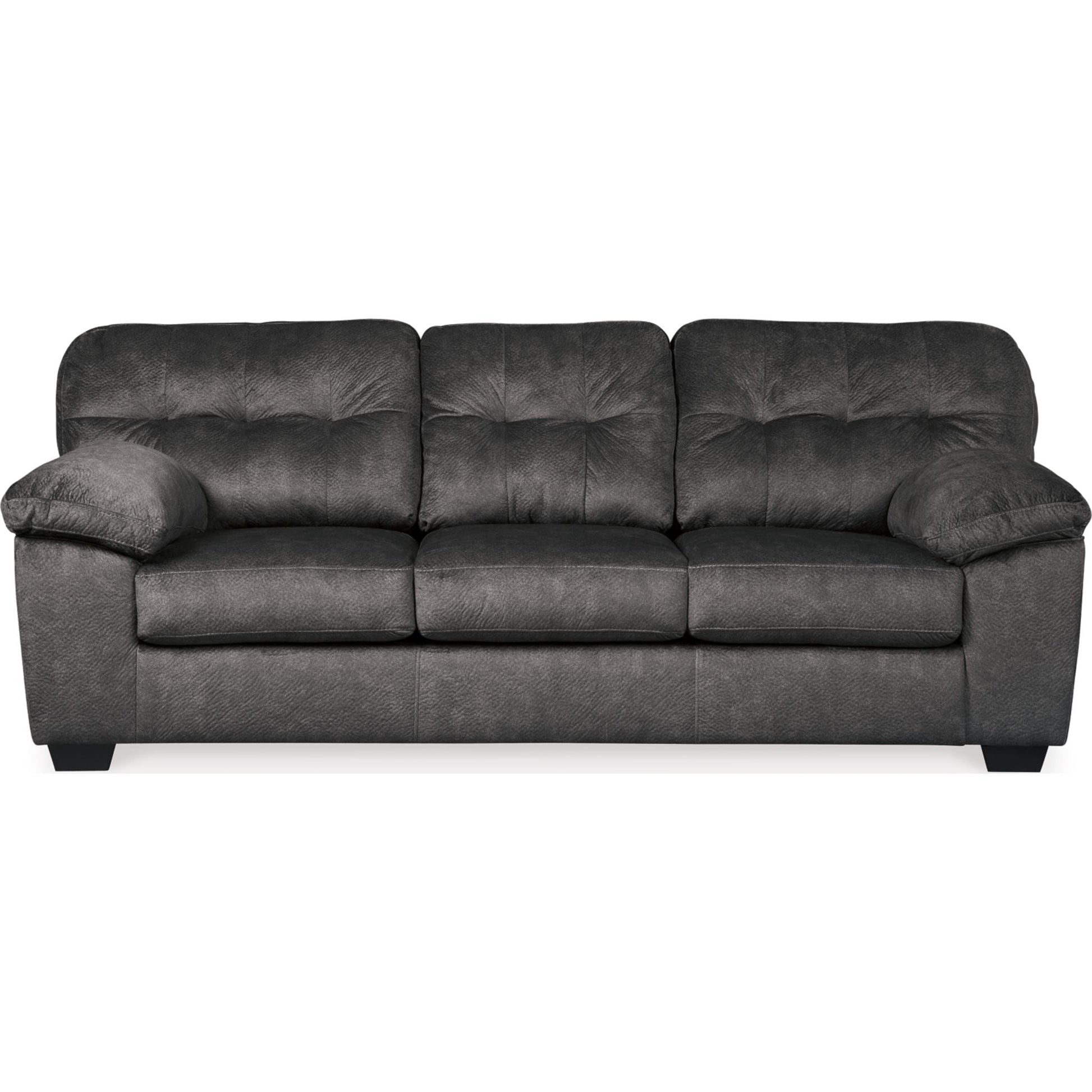 Looking for the perfect blend of decadent comfort and contemporary flair? Feast your eyes on this sensational sofa. Tufted box cushioning and thick pillow top armrests brilliantly merge style and a sumptuous feel. Wonderfully plush to the touch, the sofa's granite gray fabric is the ultimate choice for a chic, trendy look.