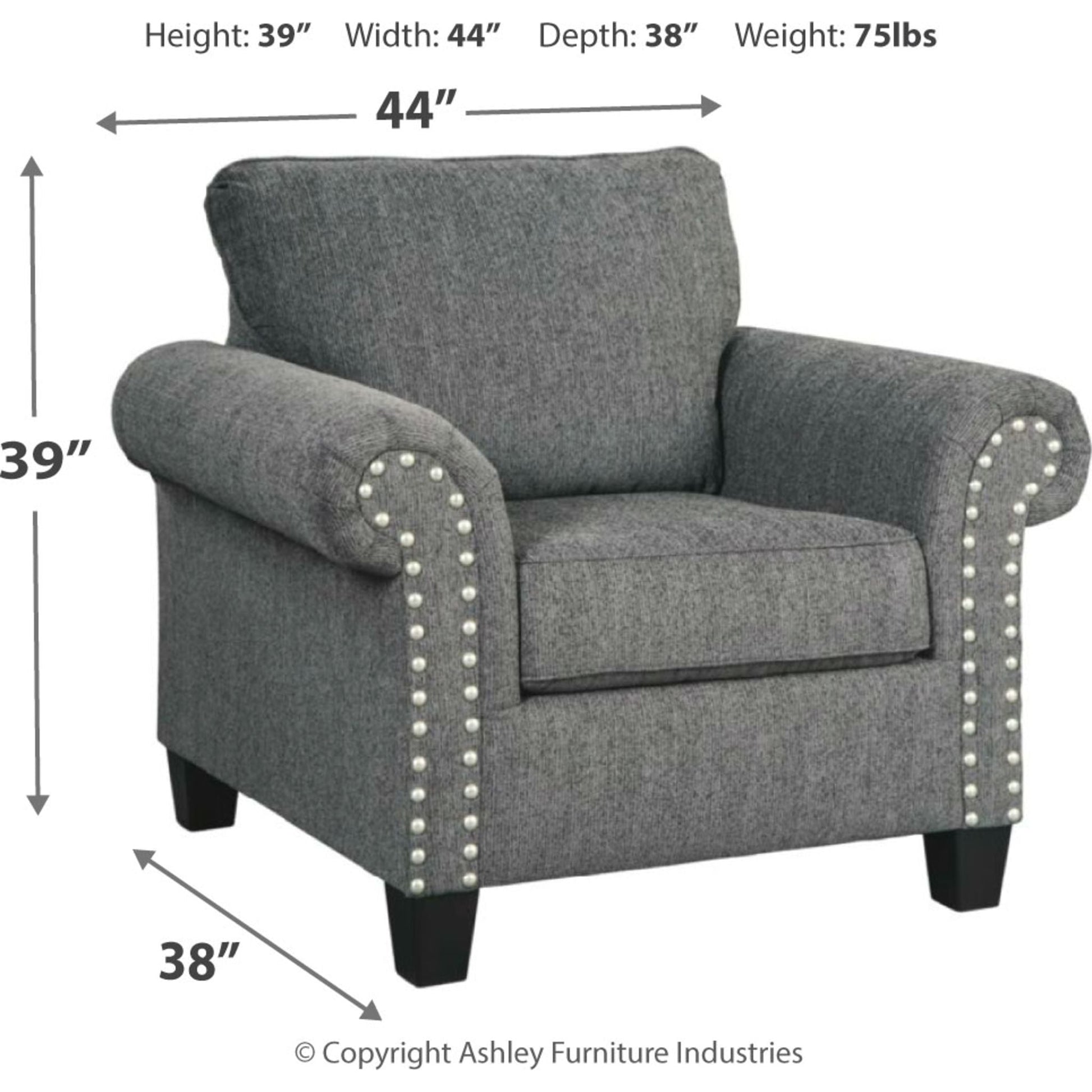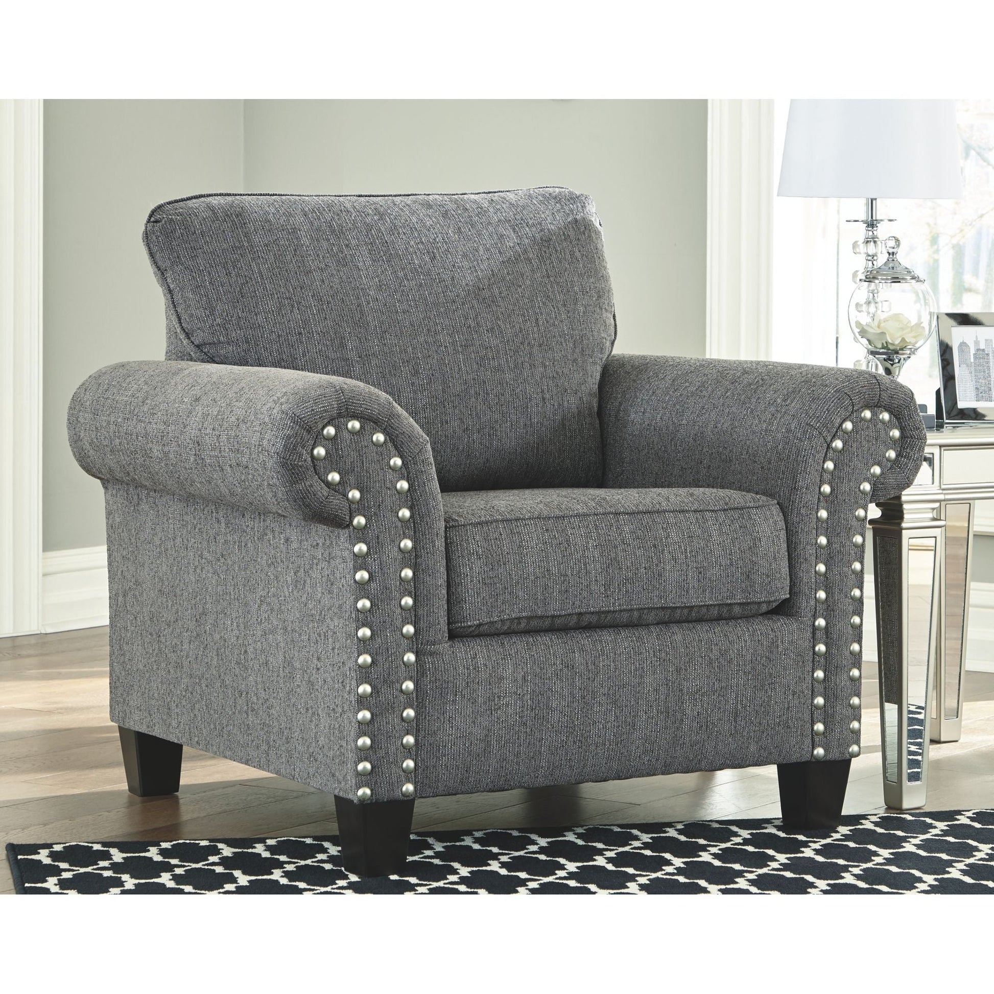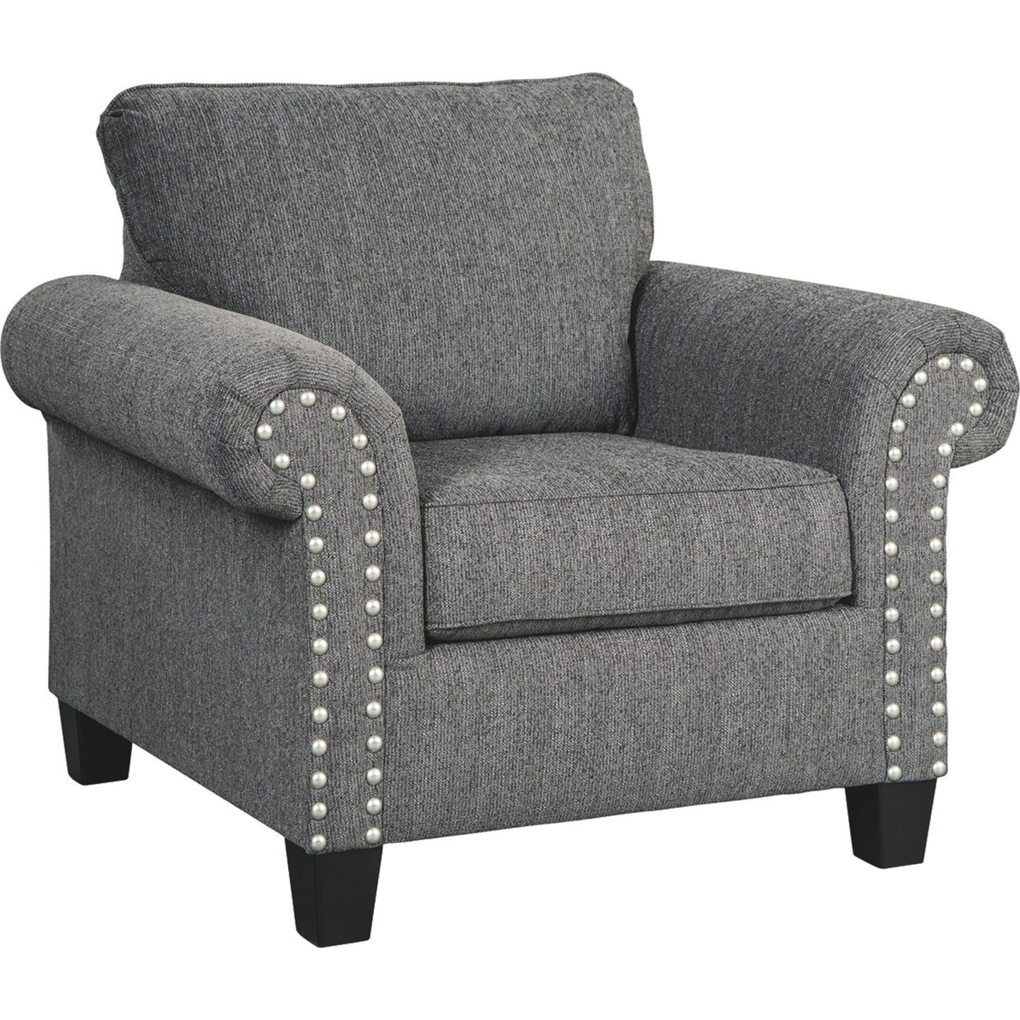 A contemporary dream. This chair checks off everything on your list. Designer profile is accentuated with roll arms and pewter-tone finished nailhead trim. Upholstered in a textured chenille, the feel is up to par with the look. Tapered accent legs finish off top-to-bottom style.