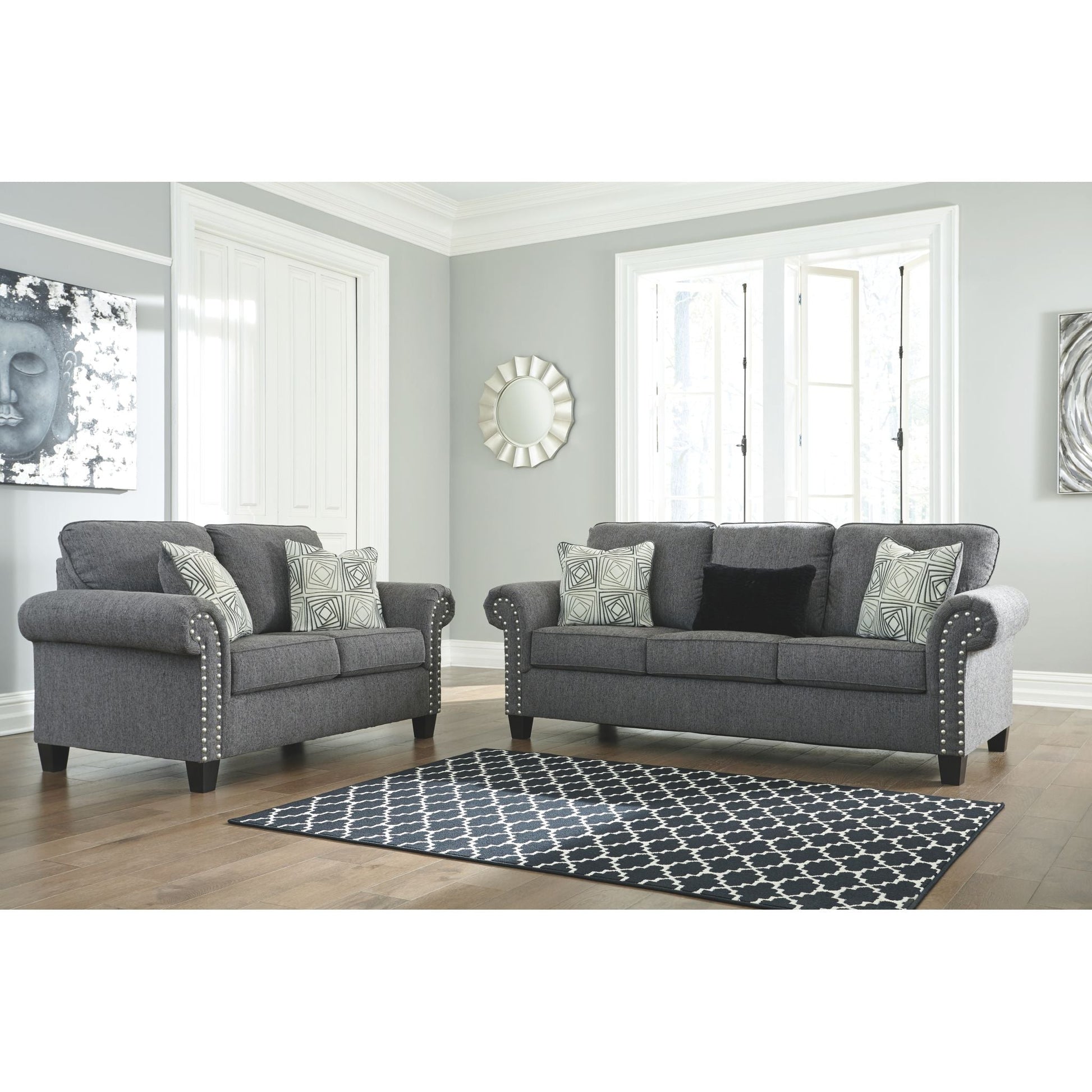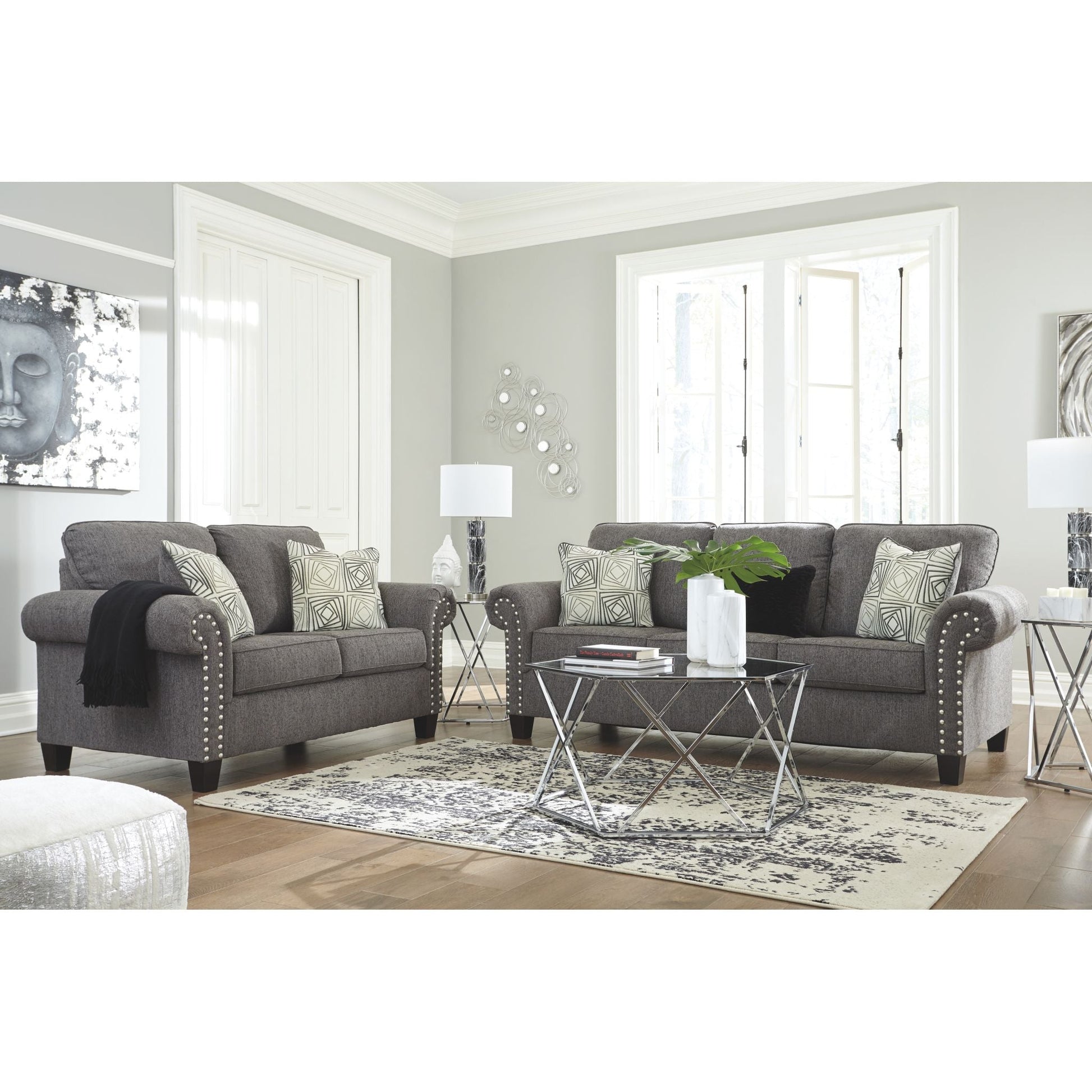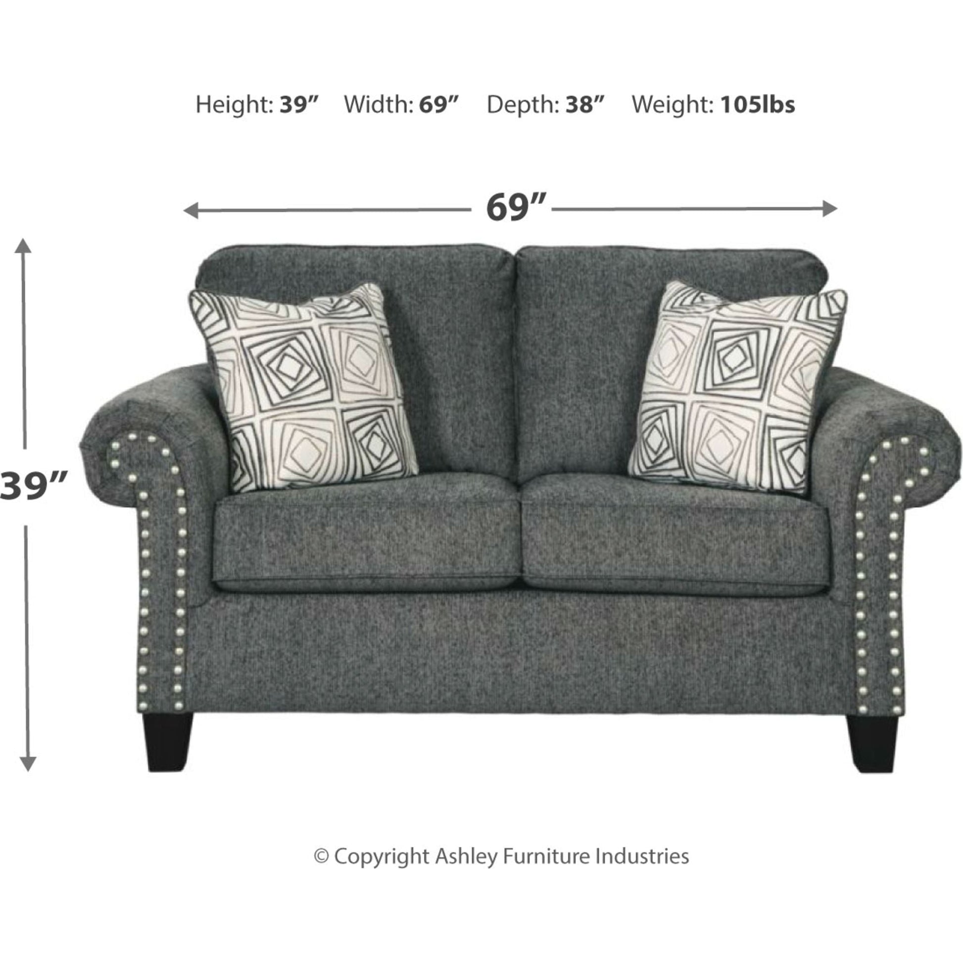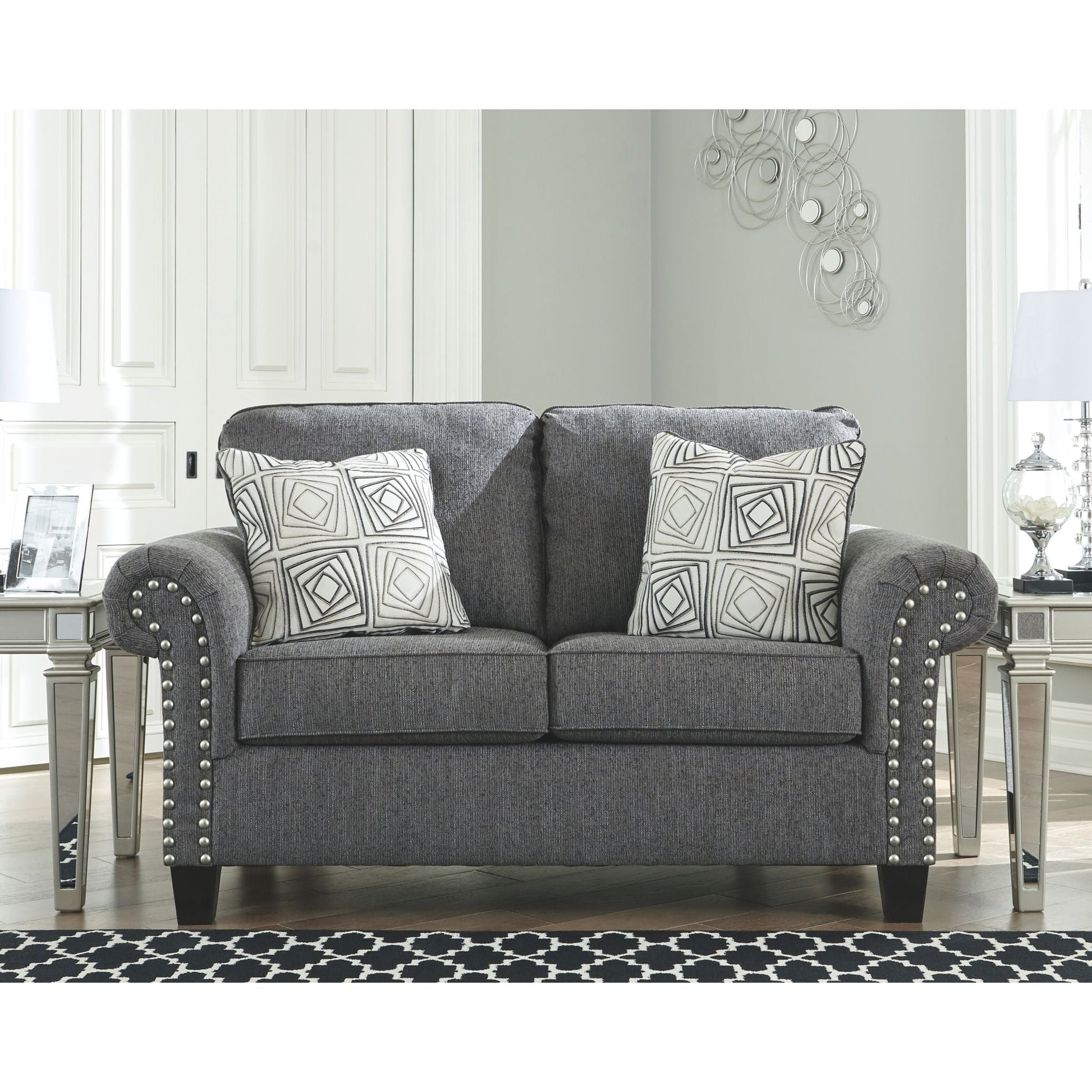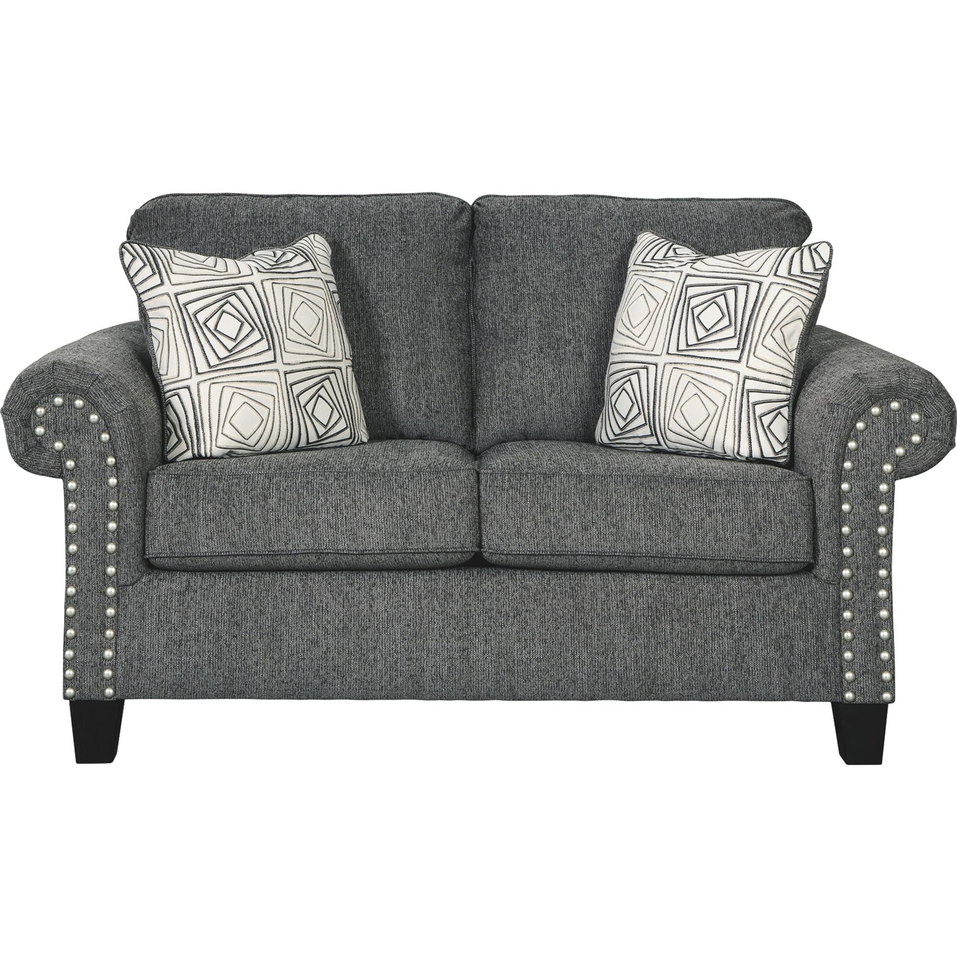 A contemporary dream. This loveseat checks off everything on your list. Designer profile is accentuated with roll arms and pewter-tone finished nailhead trim. Upholstered in a textured chenille, the feel is up to par with the look. Geometric throw pillows flaunt a mesmerizing pattern. Tapered accent legs finish off top-to-bottom style.