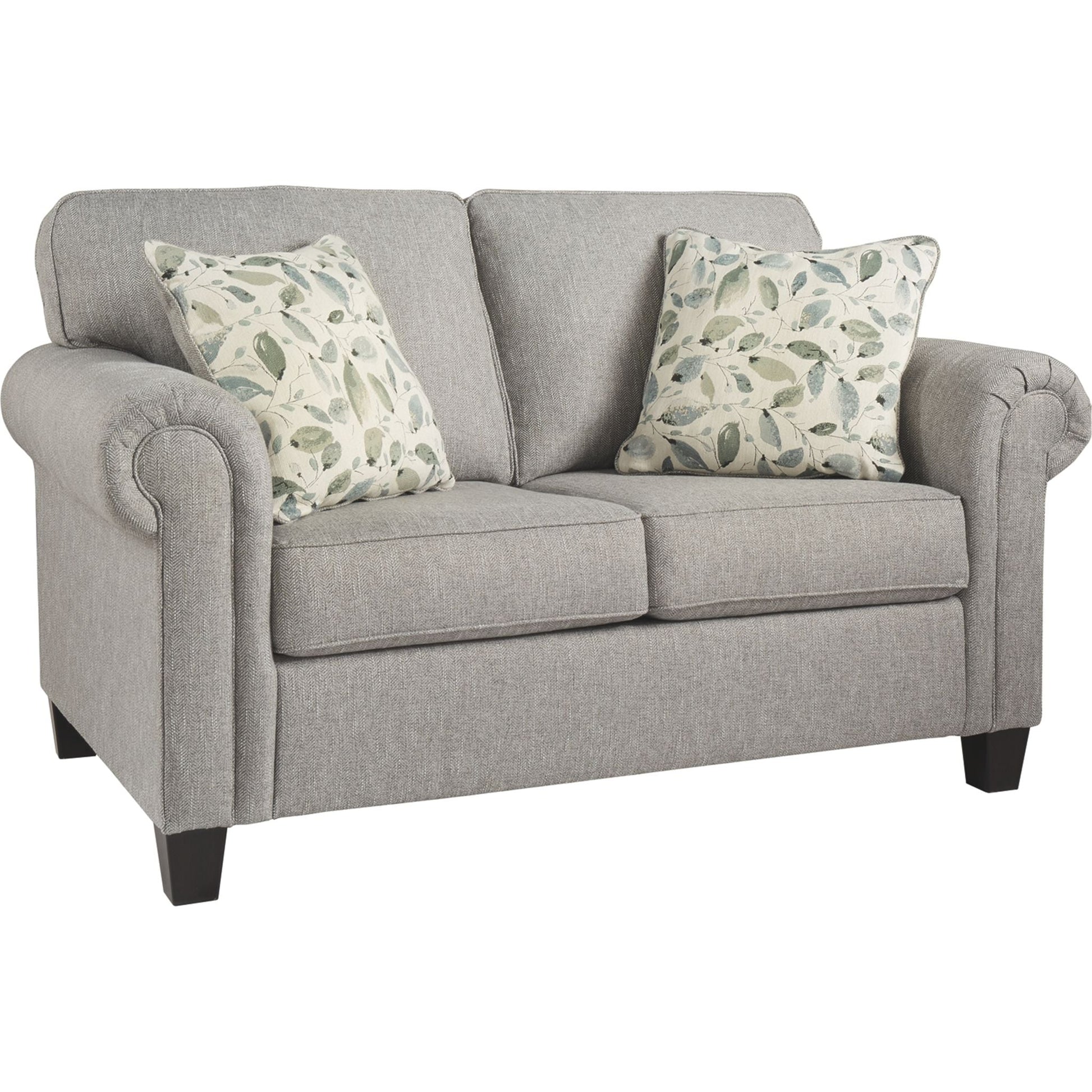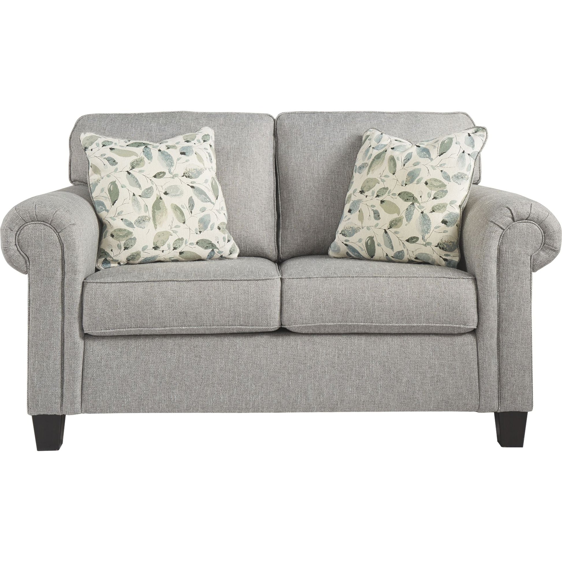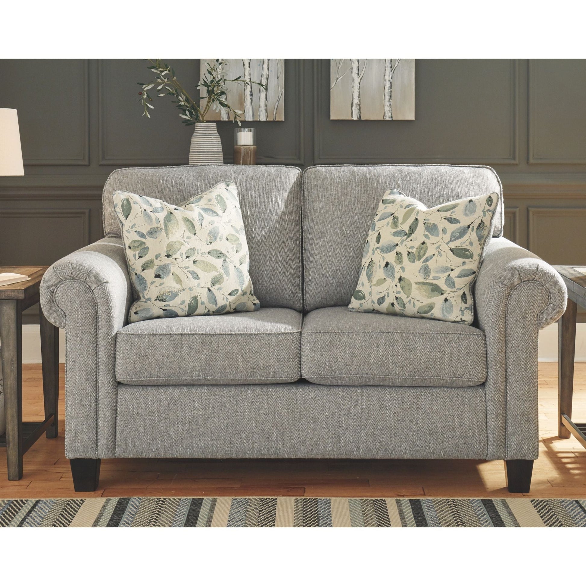 Sporting a pleasing roll arm for classic flair, this loveseat in soft gray exudes an easy elegance sure to please. Feel-good upholstery with linen texturing is made for everyday luxury. Muted-tone toss pillows are a soothing, sophisticated complement.