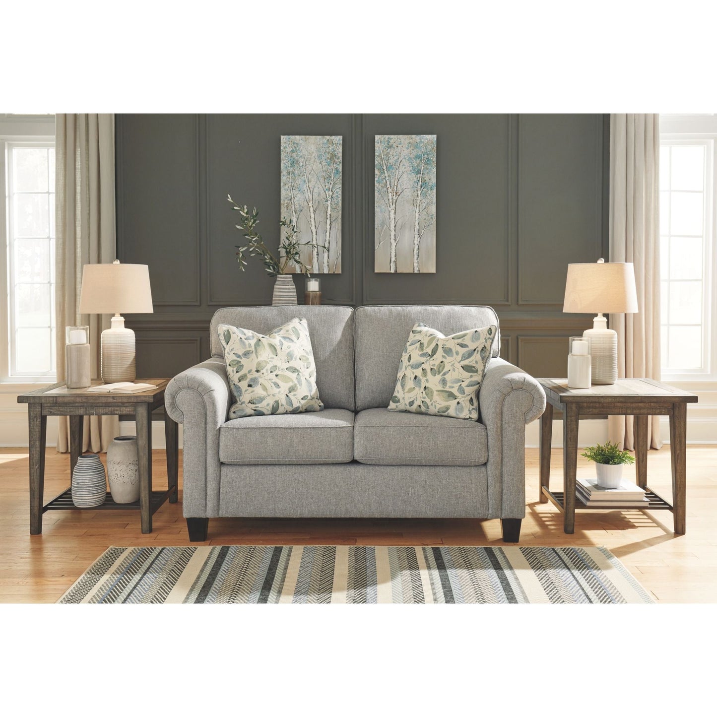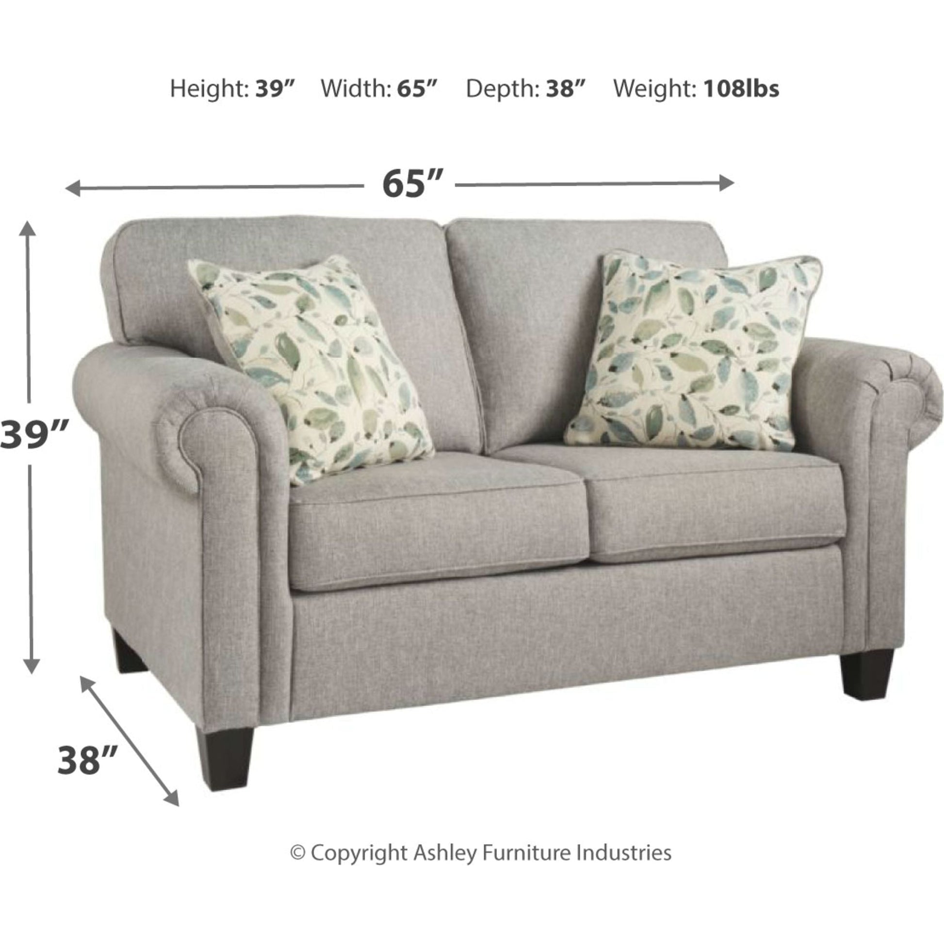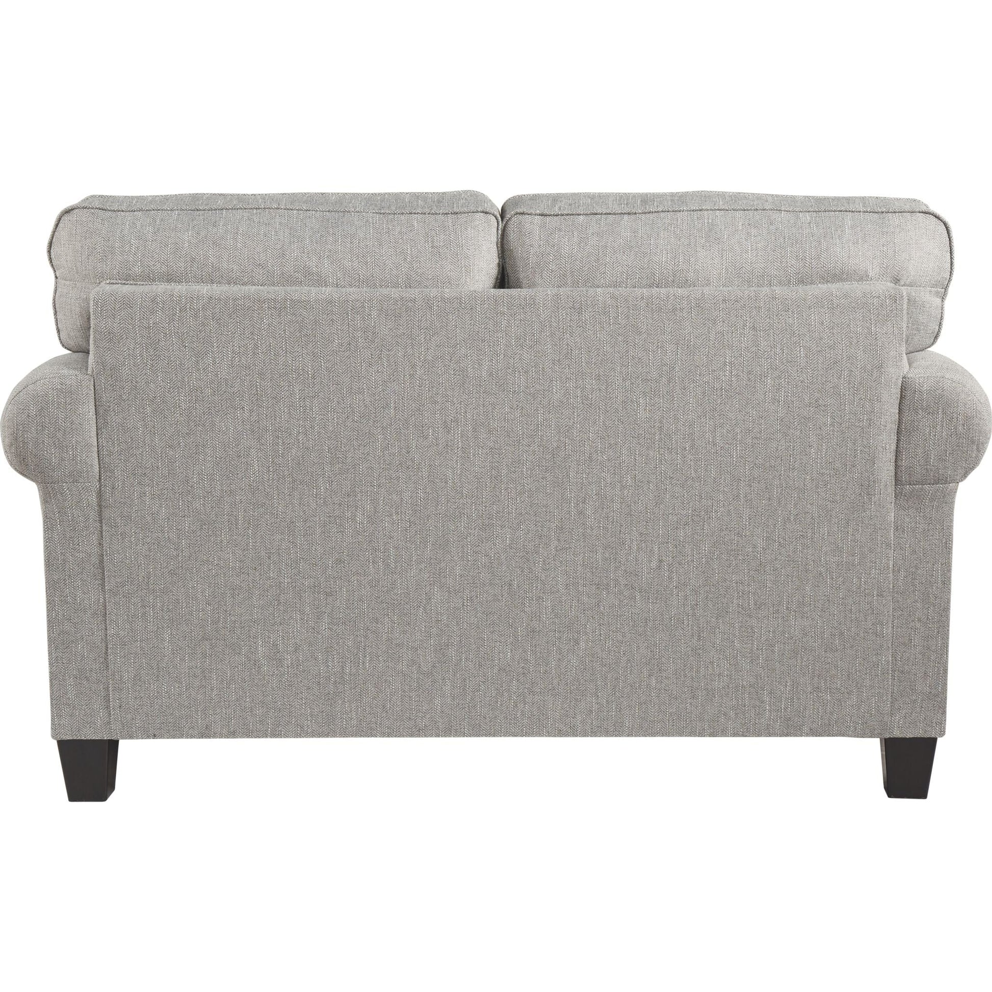 Sporting a pleasing roll arm for classic flair, this loveseat in soft gray exudes an easy elegance sure to please. Feel-good upholstery with linen texturing is made for everyday luxury. Muted-tone toss pillows are a soothing, sophisticated complement.
