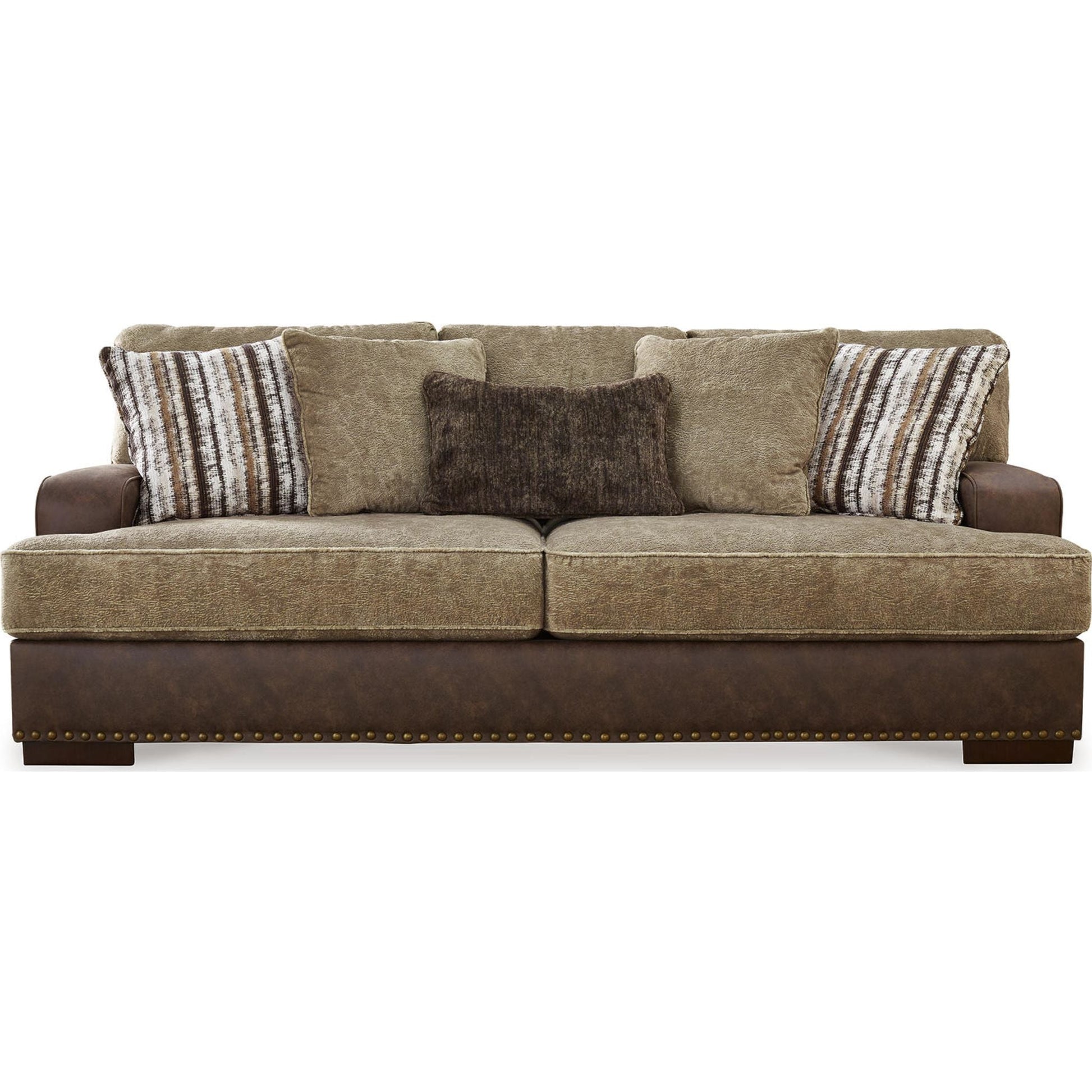 Punctuated by a subtle band of nailhead trim, this sofa is perfect for those who love the look of leather. Two textural tones provide twice the style and comfort—and incorporate an added layer of visual interest. Throw pillows add a fun decorative element.