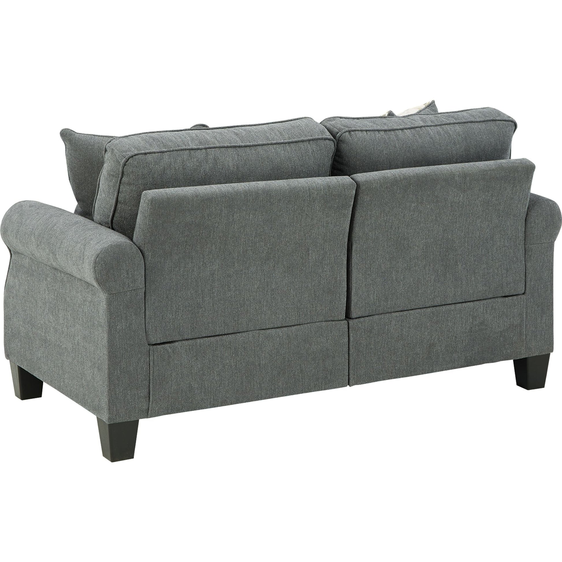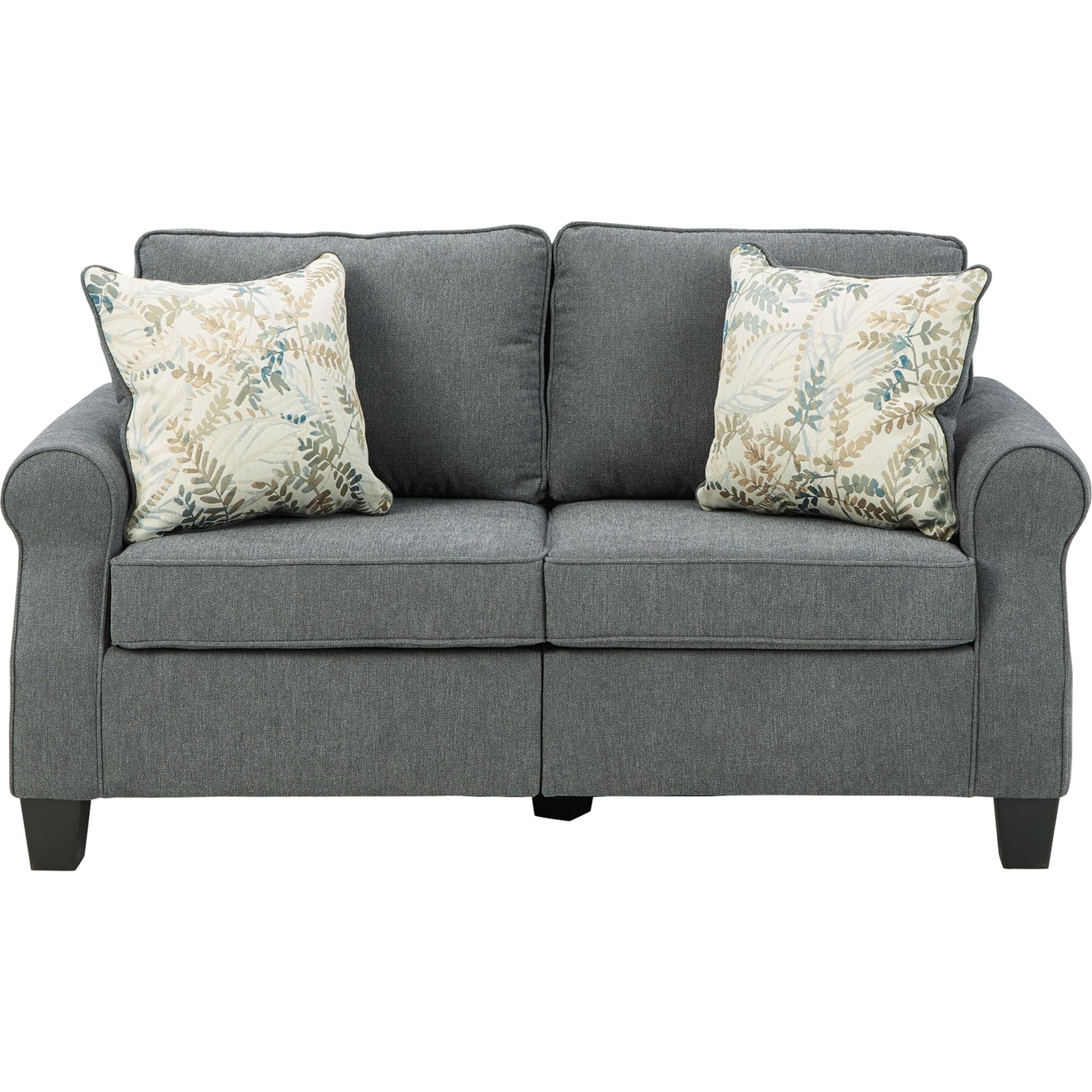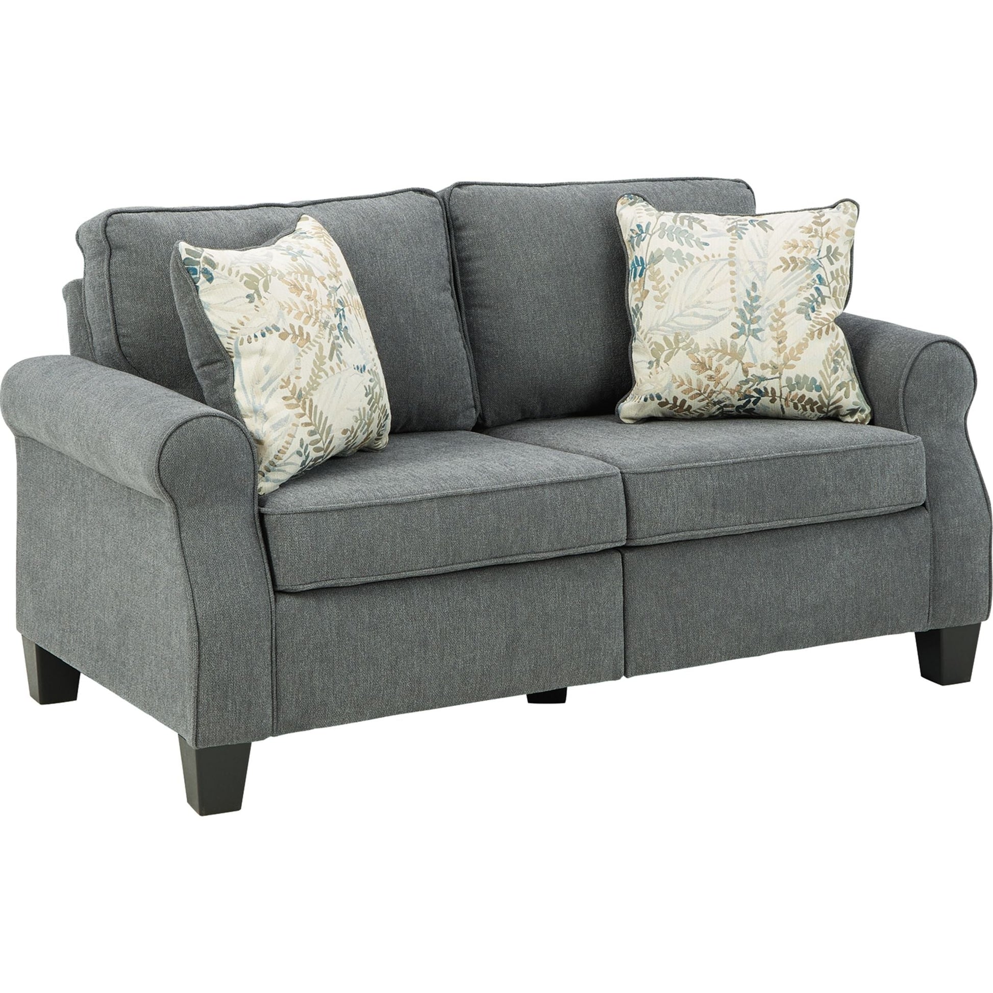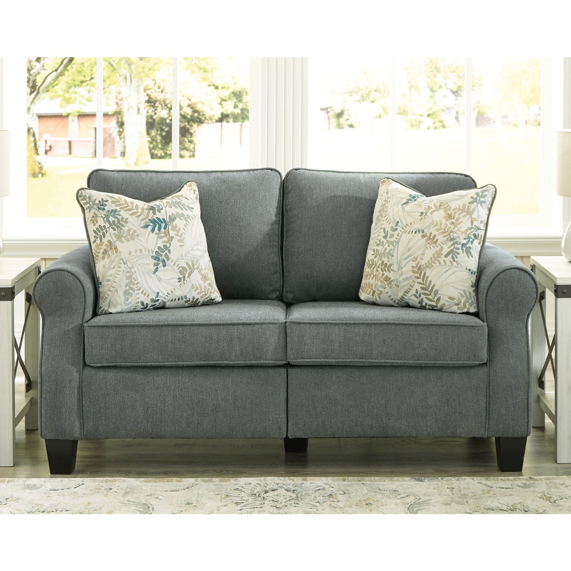 Whether your home is adorned with contemporary or American classic furnishings, this loveseat has a timeless sense of elegance that's sure to fit right in. Signature elements include roll arms and cutaway side profiling for added flair. Richly neutral and soft to the touch, the charcoal gray fabric is a brilliant reflection of your good taste. Rounded cornering adds a softened, tailored aesthetic to the box cushions, making the loveseat a great transitional piece of furniture.