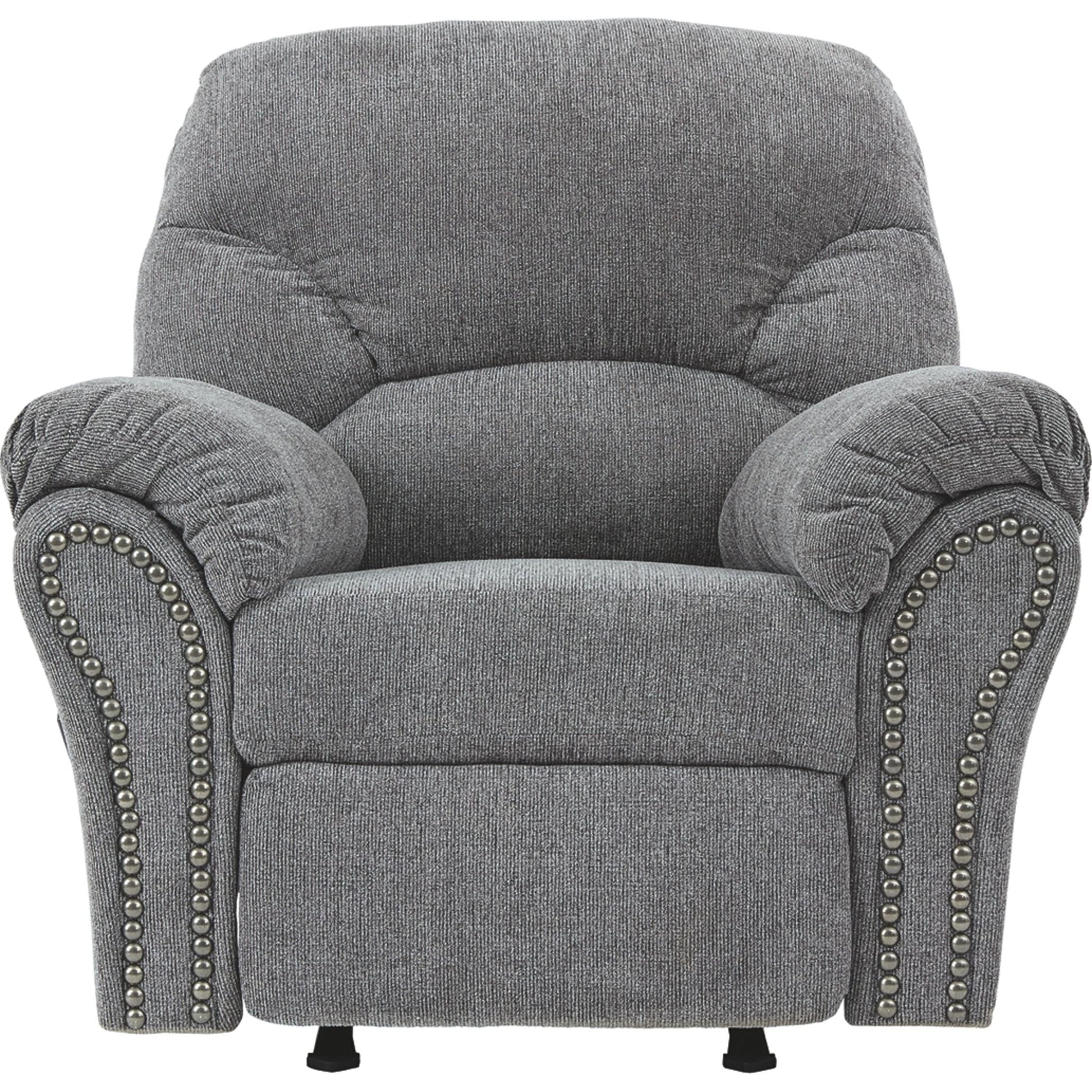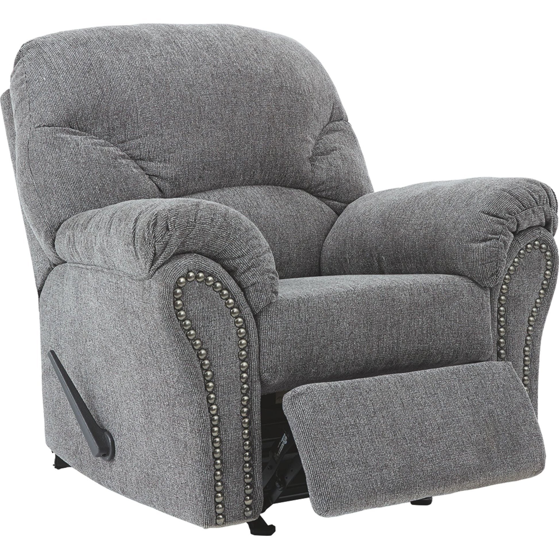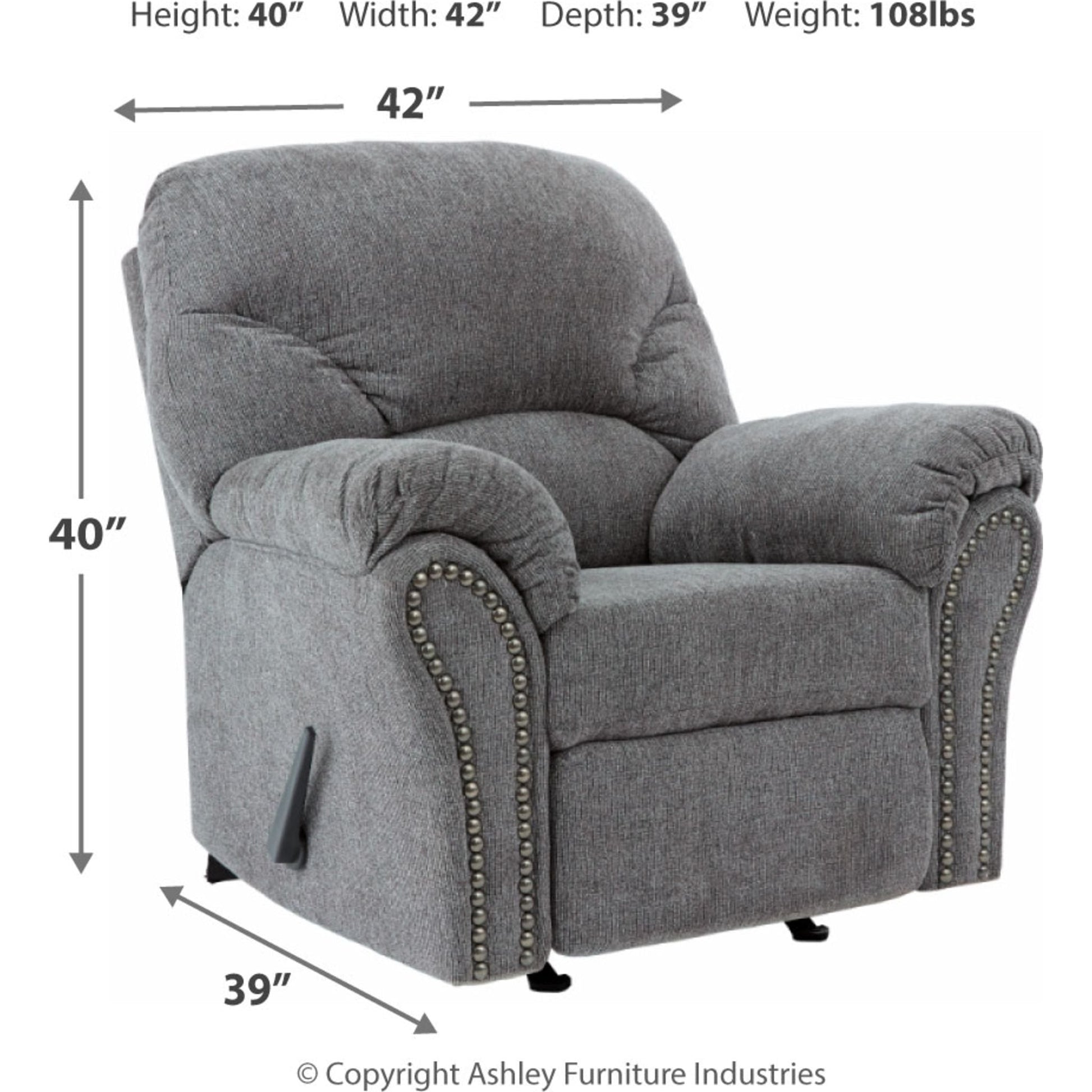 Why sacrifice comfort for style (or style for comfort) when you can have the best of both in this rocker recliner in pewter gray. Elements include a chic divided-back design and pillow top wrapped armrests that make nodding off all too easy. Calling attention to the elegantly flared armrests—black nickel nailhead trim for a punch of cool character.