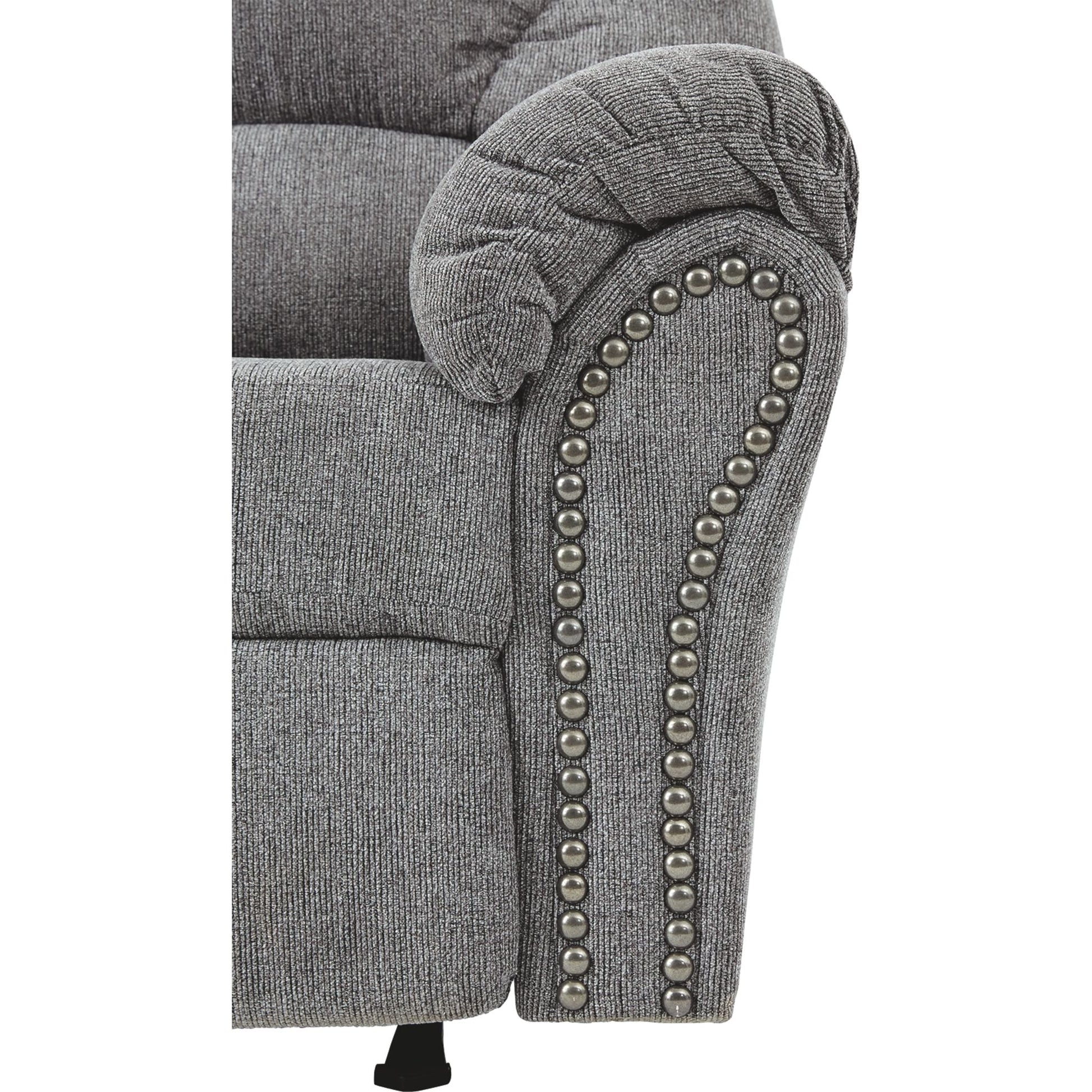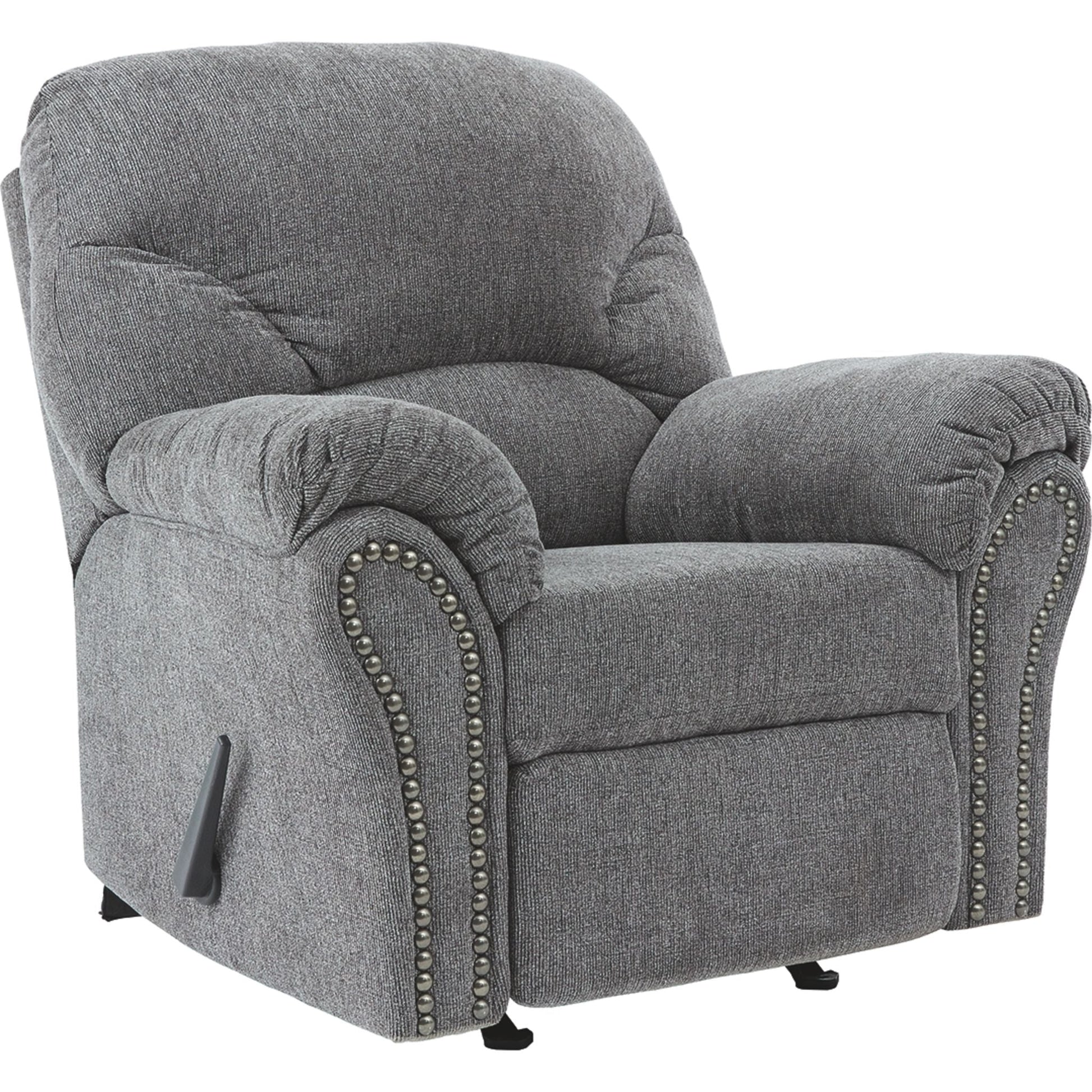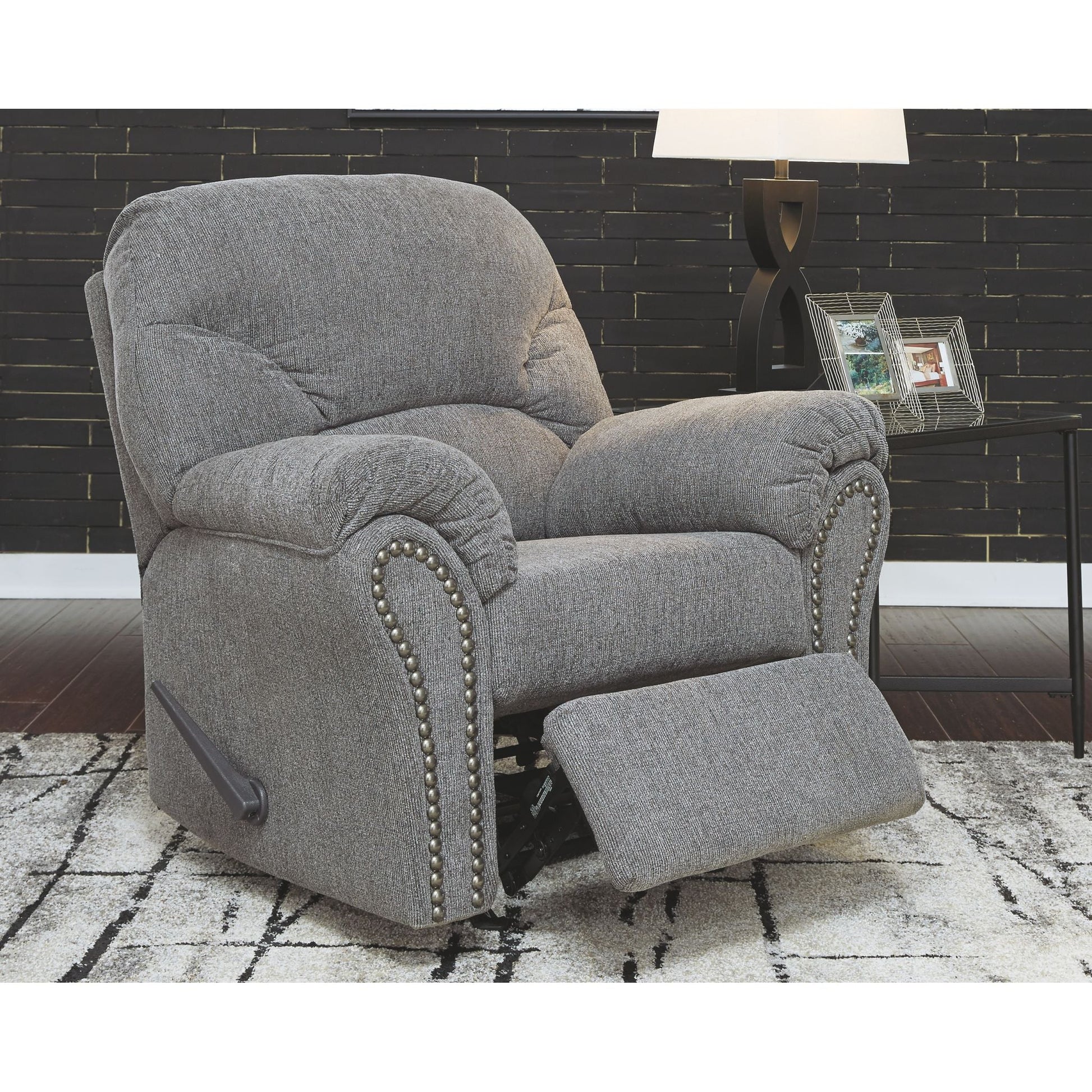 Why sacrifice comfort for style (or style for comfort) when you can have the best of both in this rocker recliner in pewter gray. Elements include a chic divided-back design and pillow top wrapped armrests that make nodding off all too easy. Calling attention to the elegantly flared armrests—black nickel nailhead trim for a punch of cool character.
