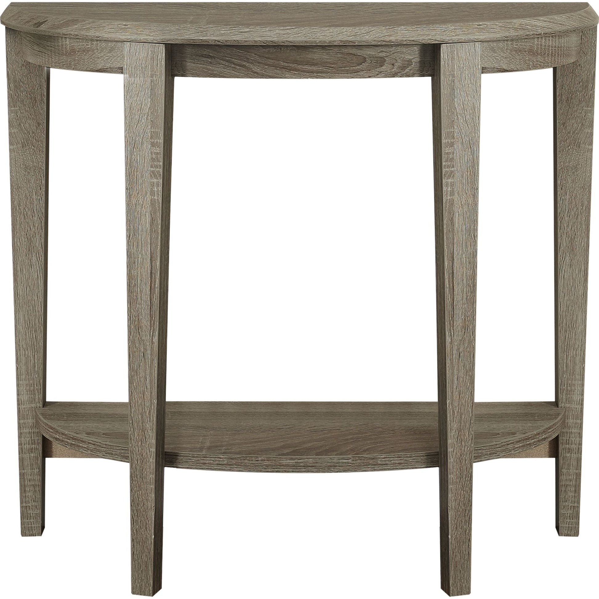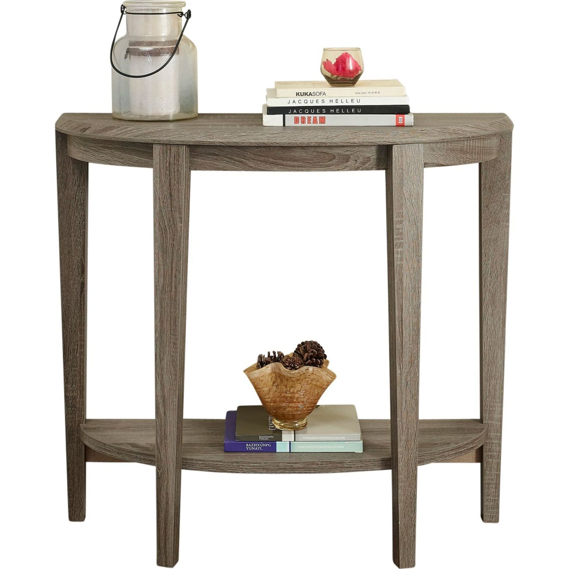 This half-moon shaped, 2-tier console table will fill any size space with sophisticated style. With its semi-round shape that fits snugly against a wall and a bottom shelf that provides a second storage surface, this accent table maximizes the display space available in a living room or narrow rooms like a hallway or an entryway. Its curved front offers a graceful alternative to rectangular console tables. This contemporary update of the classic demilune design merges elegant details, like a beveled tabletop and a table apron, with robust construction in a dark taupe wood-look finish.
