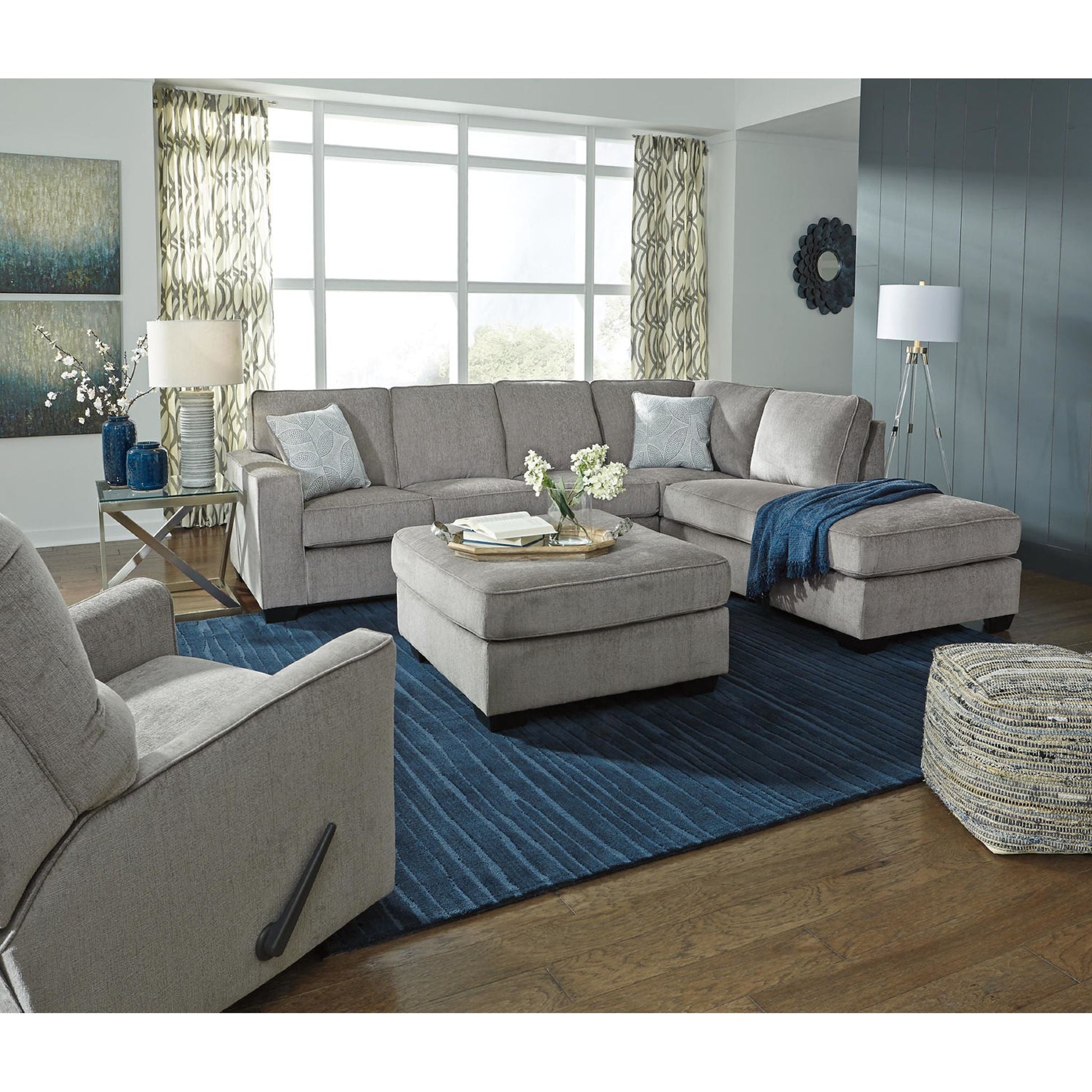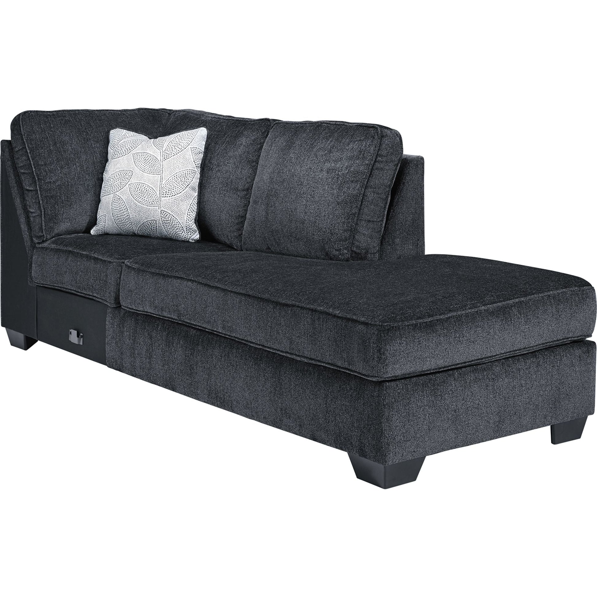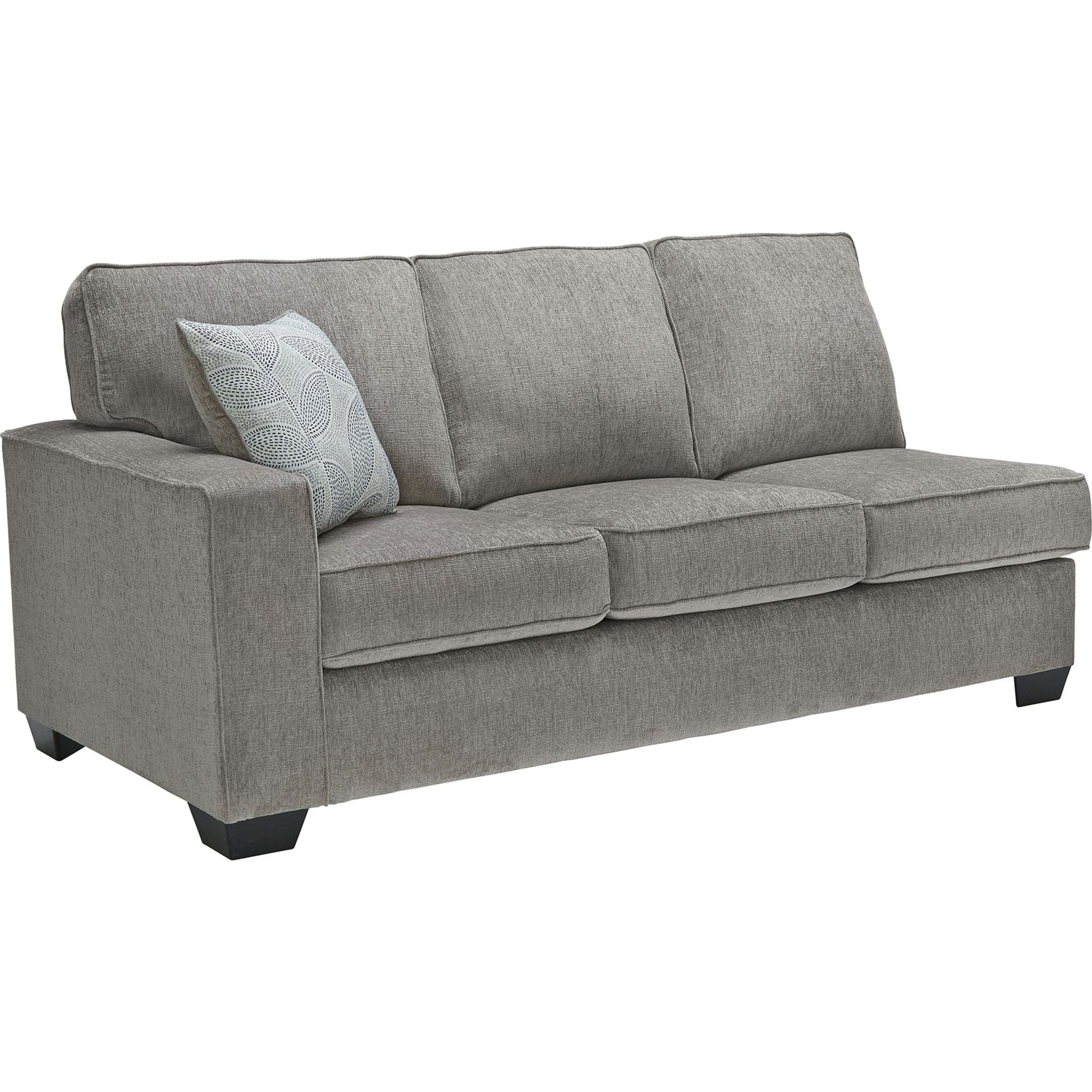 If style is the question, then this sleeper sectional is the answer. Sporting clean lines and sleek track arms, the decidedly contemporary profile is enhanced with plump cushioning and a chenille-feel upholstery, so pleasing to the touch. Sure to play well with so many color schemes, this sleeper sectional in slate gray includes a pair of understated floral pattern pillows for fashionably fresh appeal. Crafted of quality memory foam, the pull-out full mattress comfortably accommodates overnight guests.