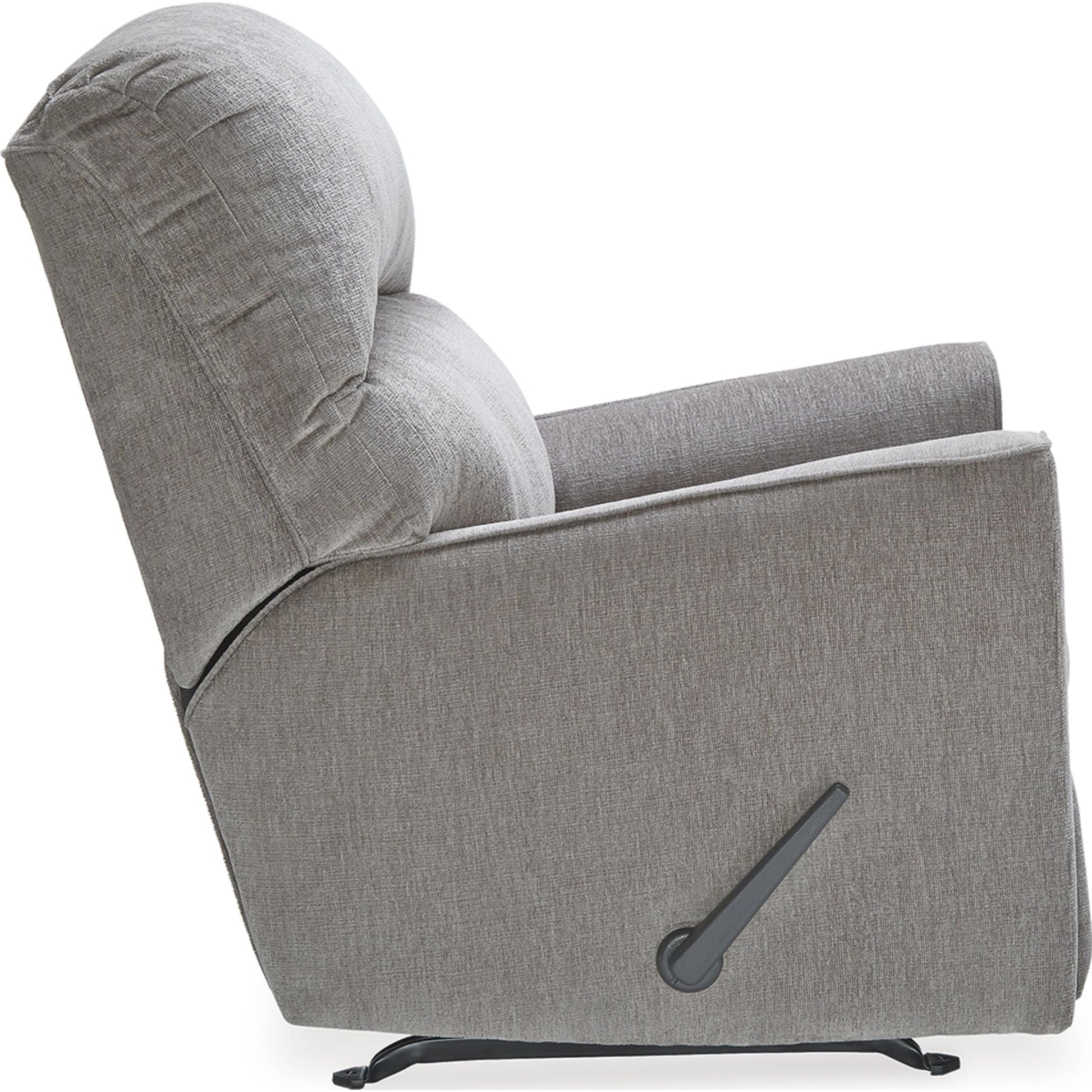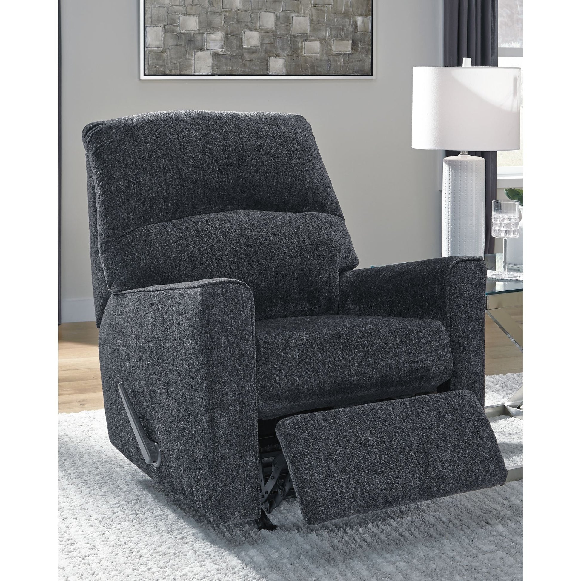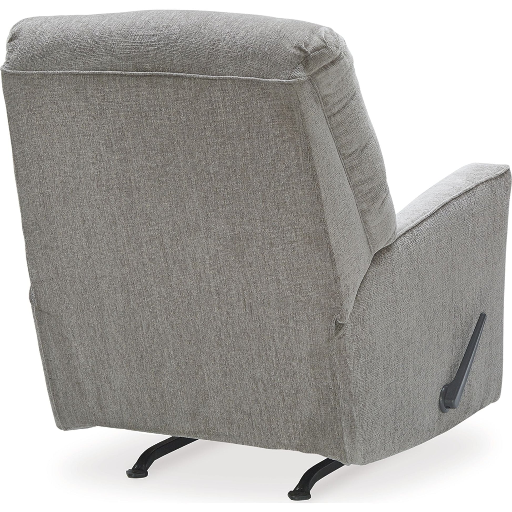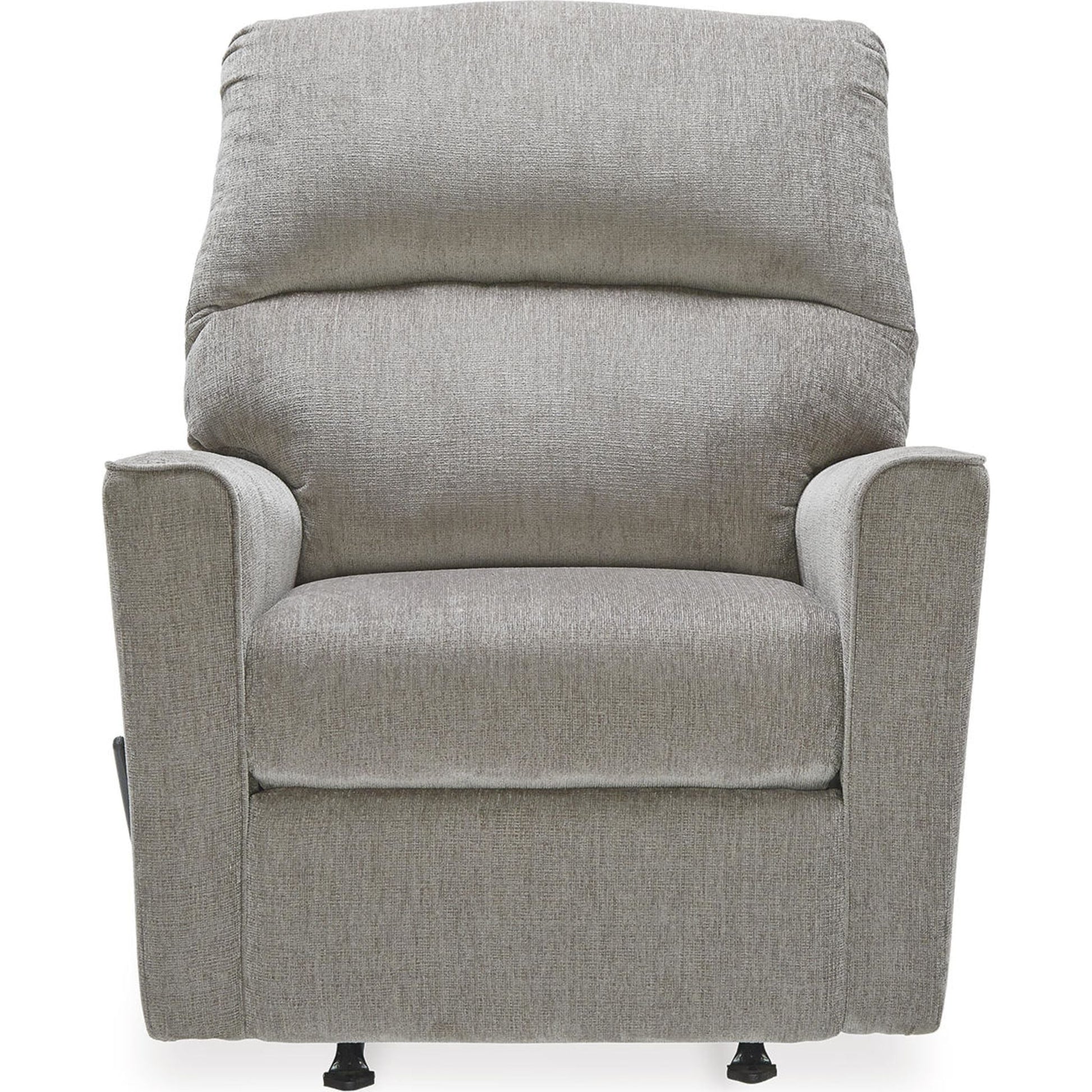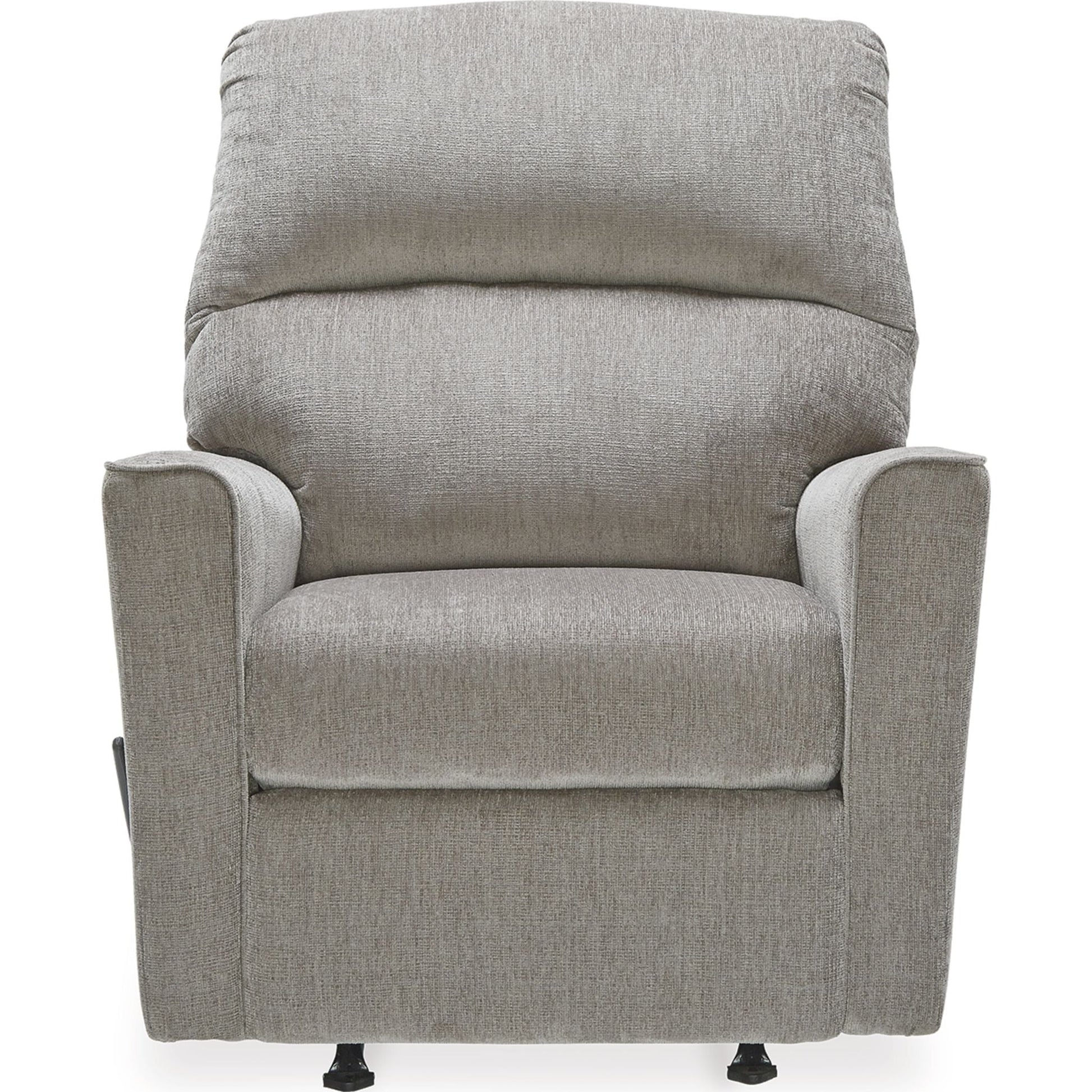 If style is the question, then this rocker recliner is the answer. Clean-lined profile is beautifully contemporary. Plush chenille fabric and plump cushioning make it so easy to comfortably kick up your heels. Richly neutral hue complements a variety of decor.