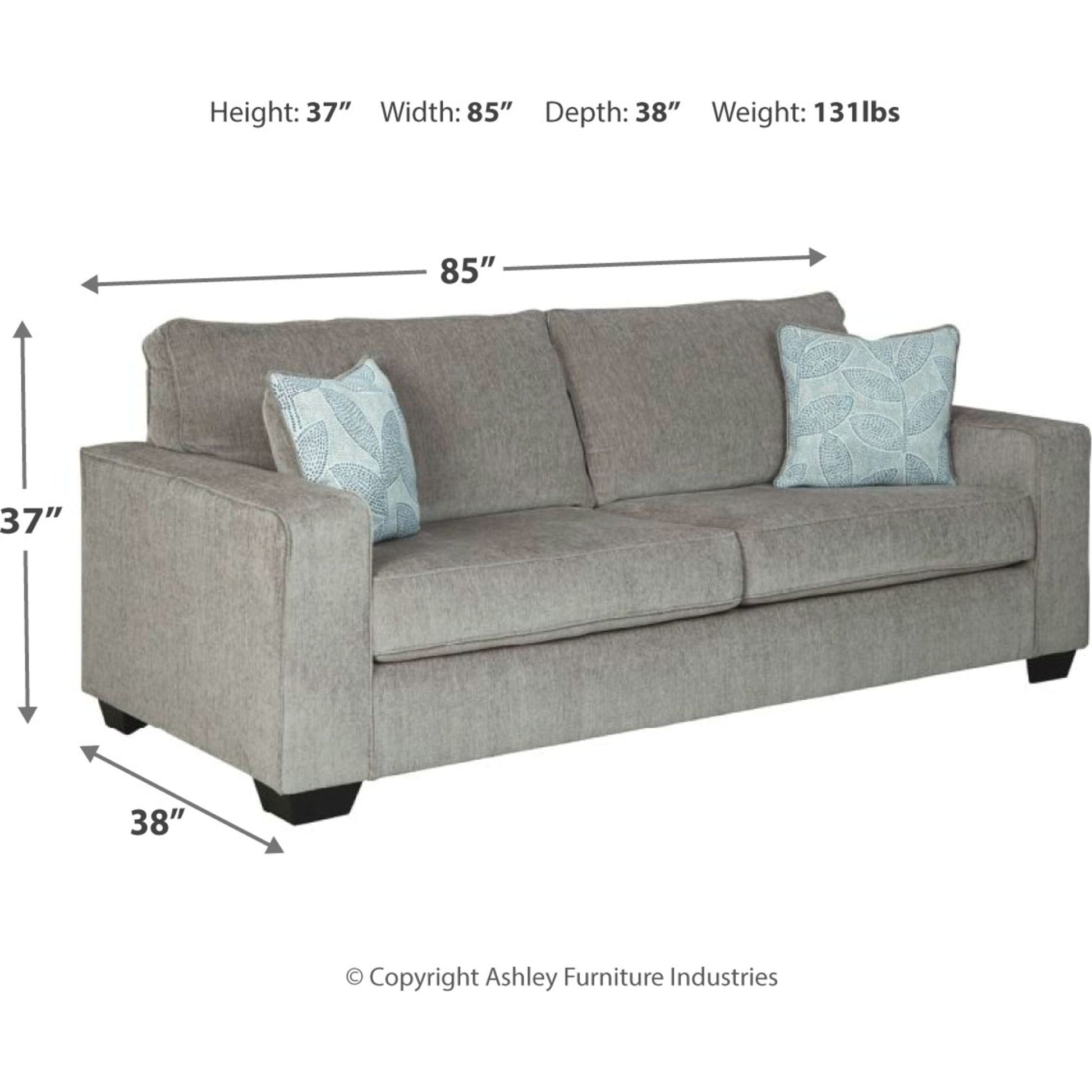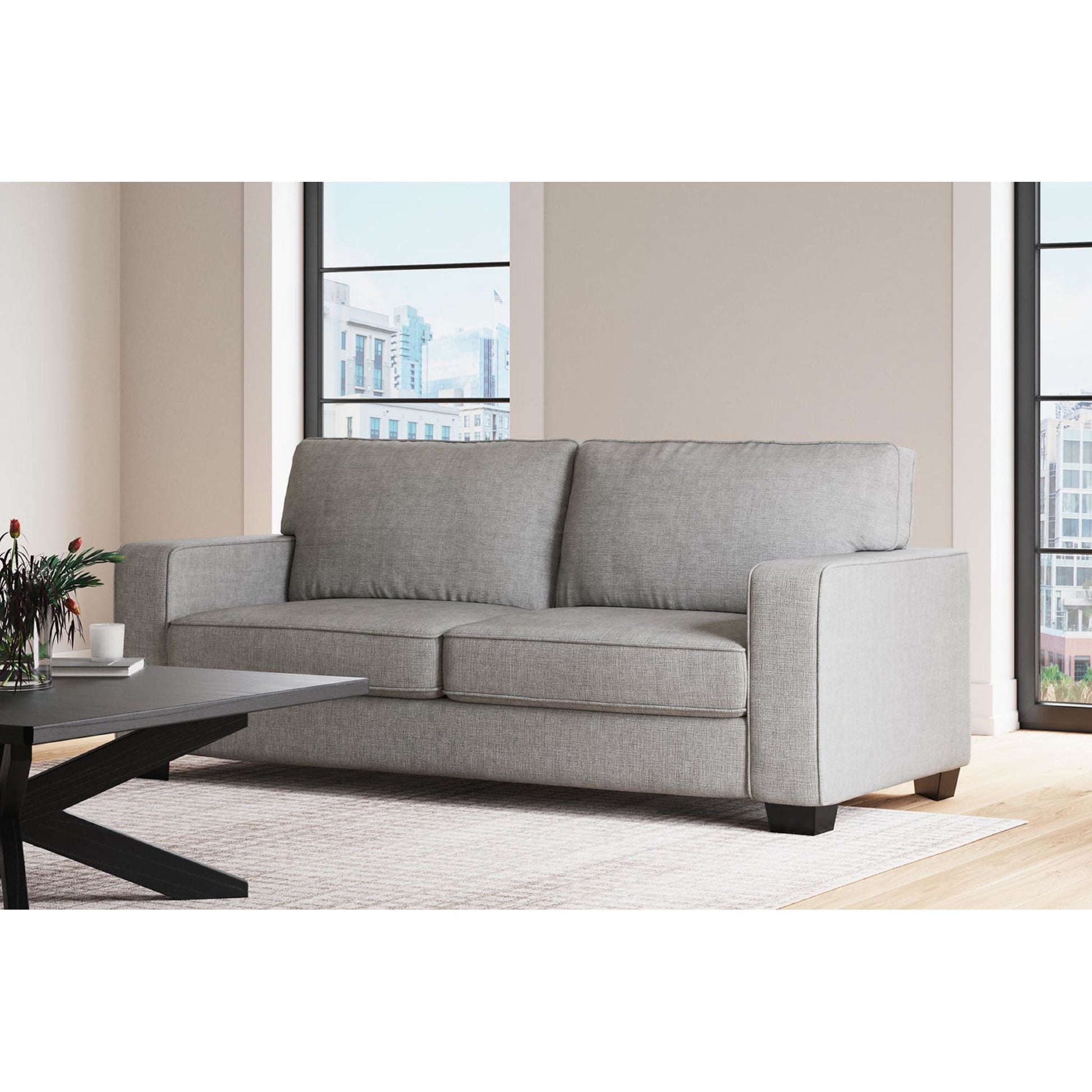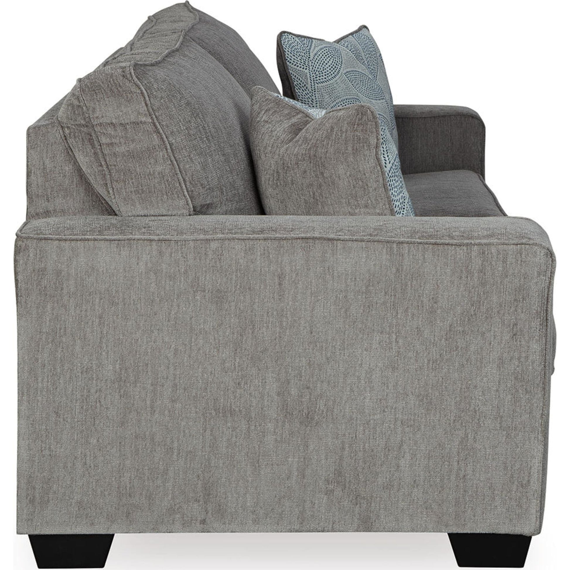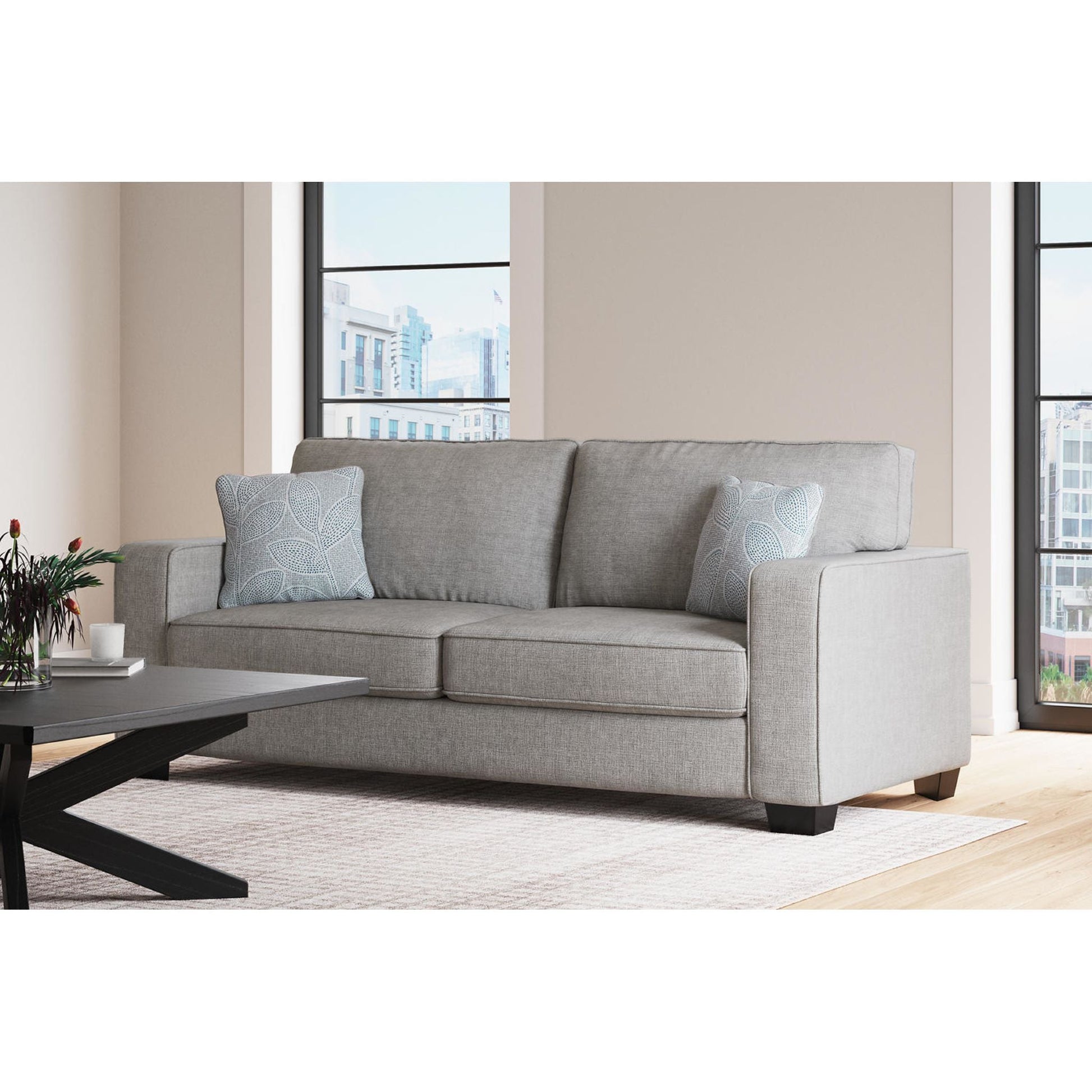 If style is the question, then this sofa is the answer. Sporting clean lines and sleek track arms, the decidedly contemporary profile is enhanced with plump cushioning and a chenille-feel upholstery, so pleasing to the touch. Sure to play well with so many color schemes, this sofa in slate gray includes a pair of understated floral pattern pillows for fashionably fresh appeal.