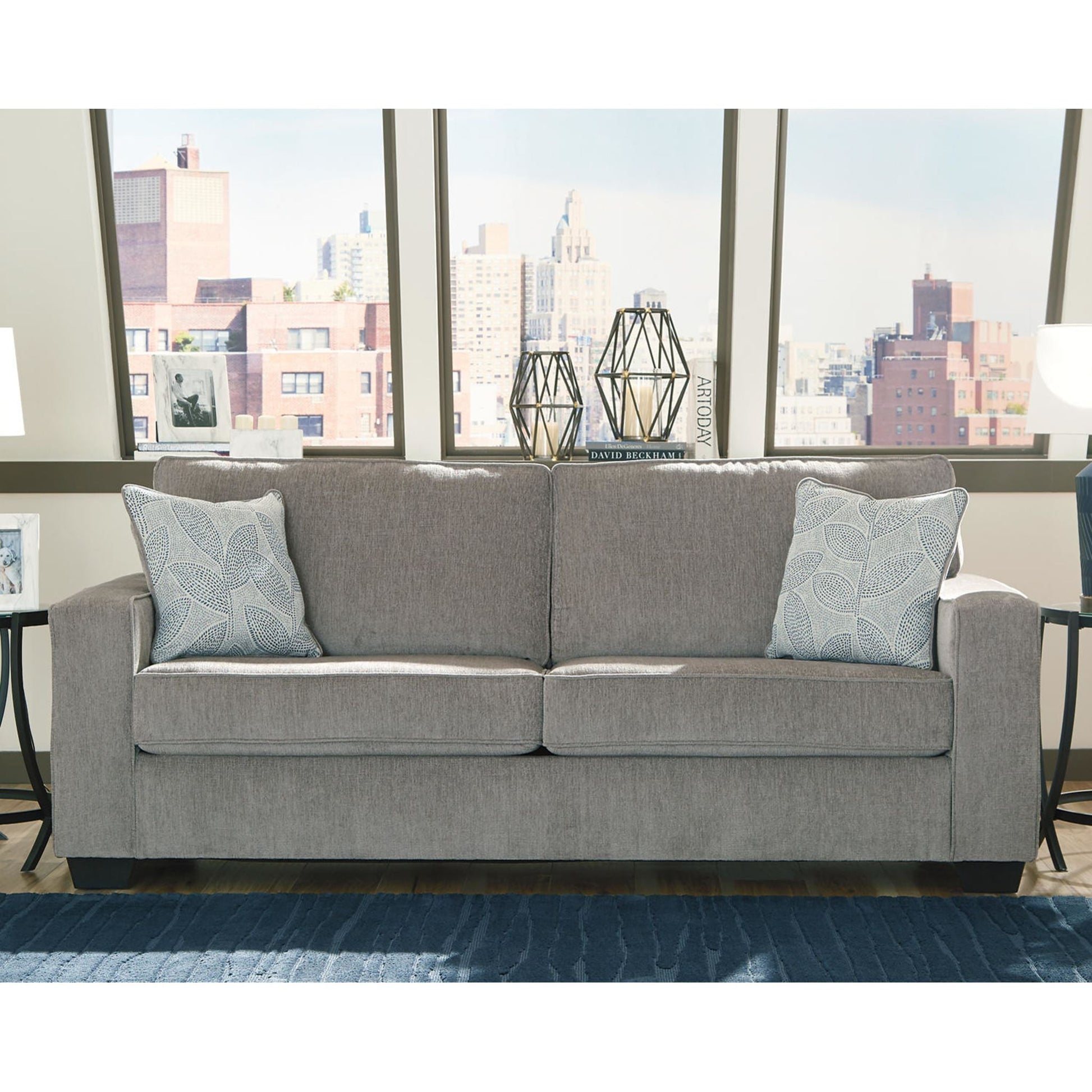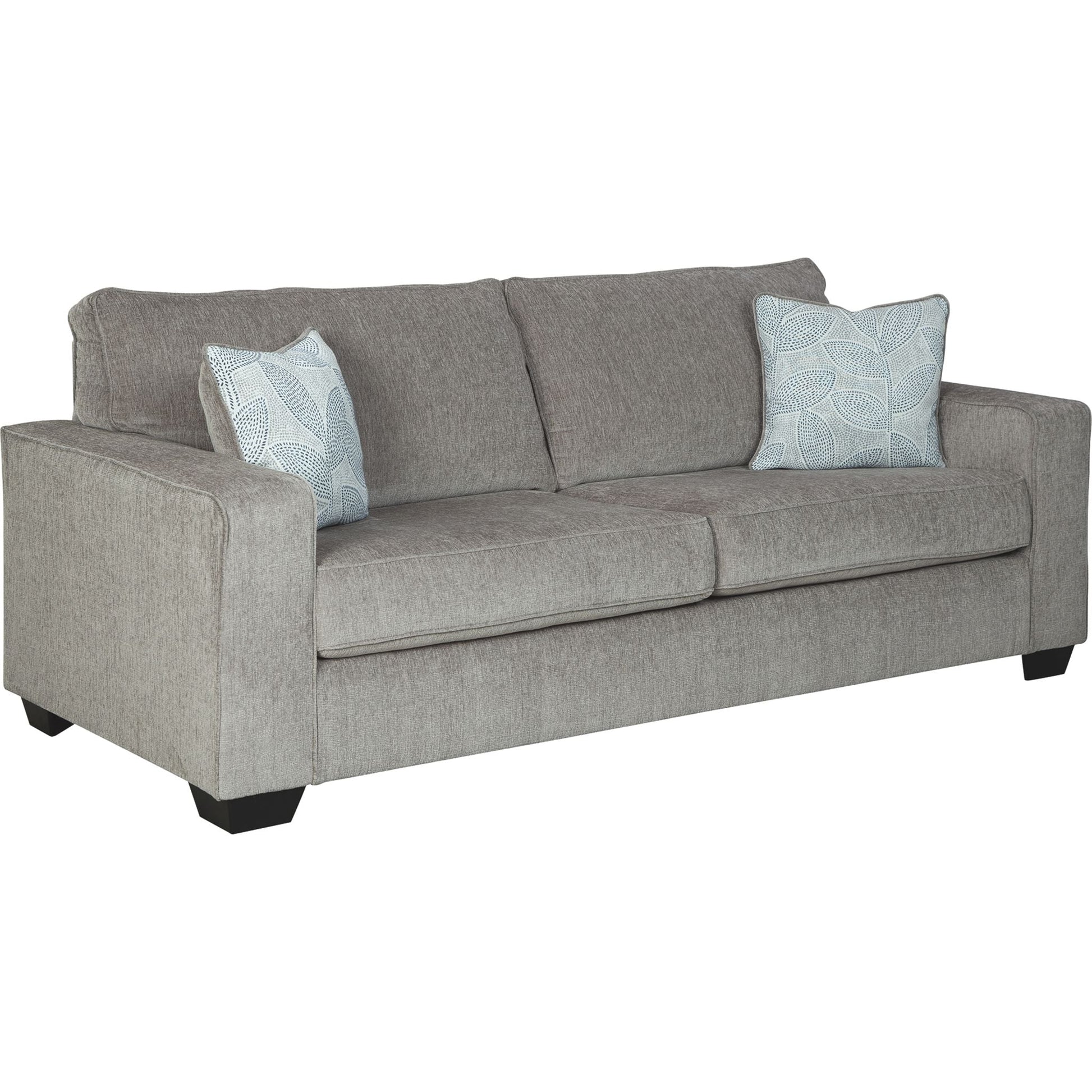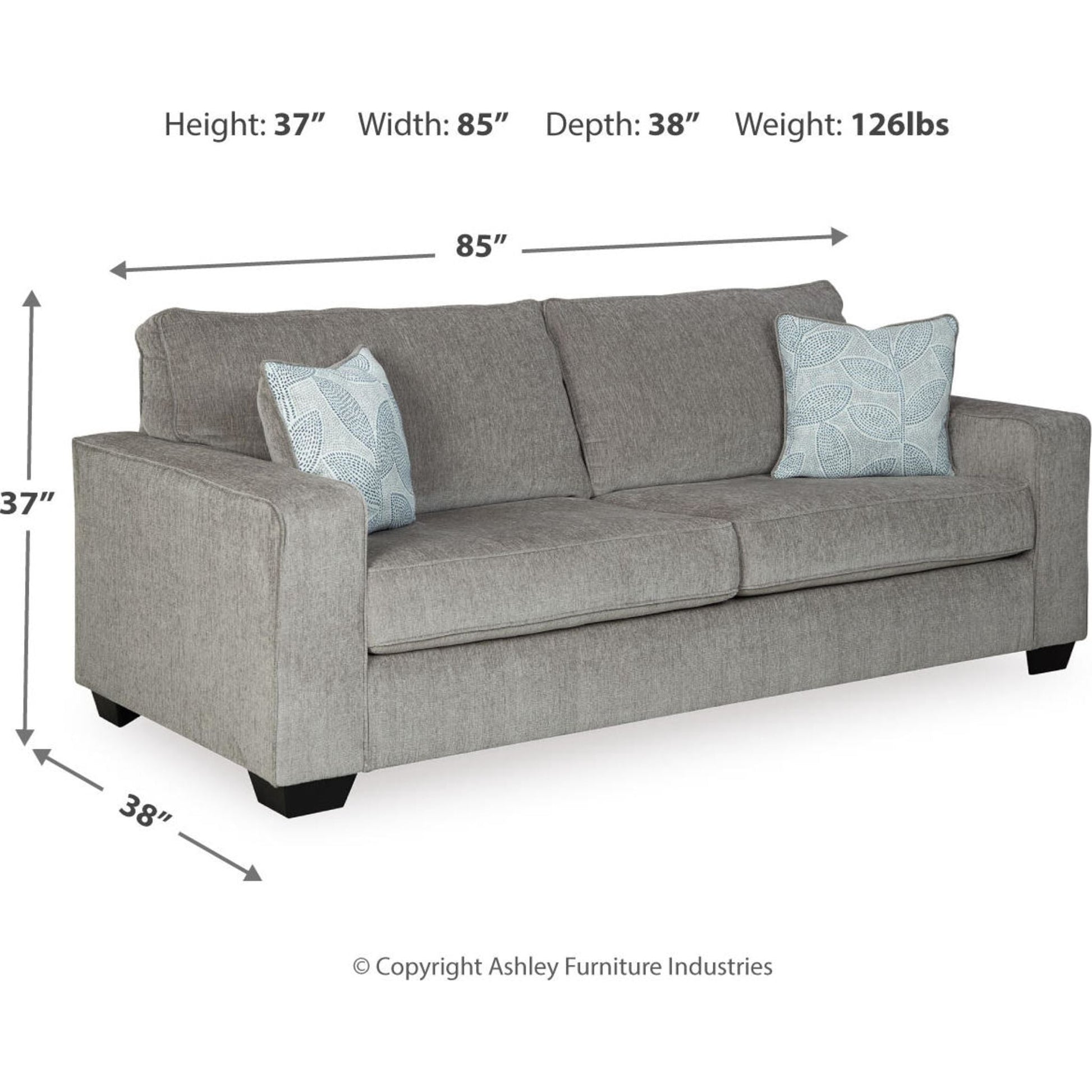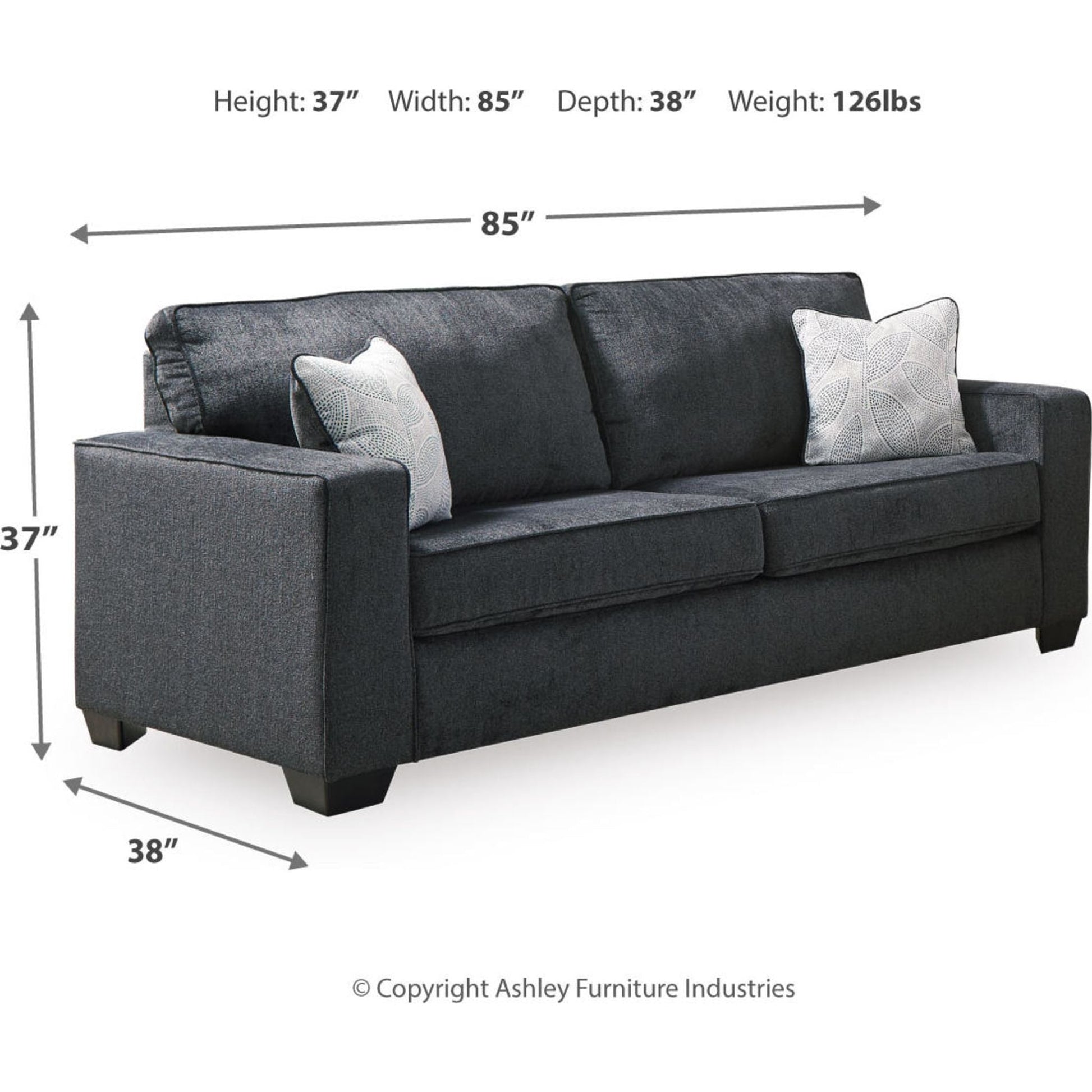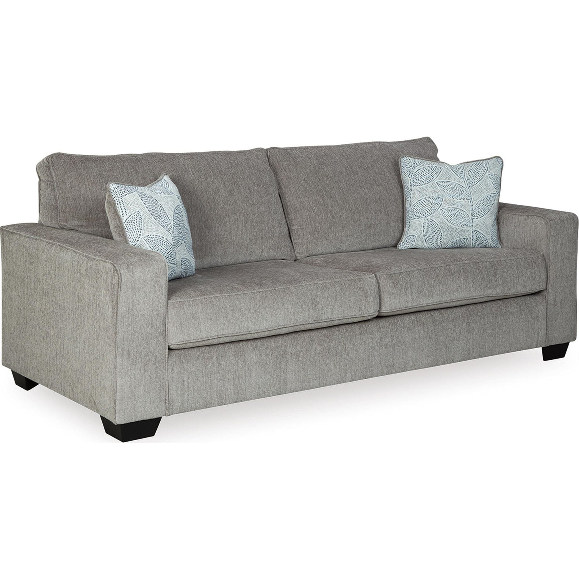 If style is the question, then this sofa is the answer. Sporting clean lines and sleek track arms, the decidedly contemporary profile is enhanced with plump cushioning and a chenille-feel upholstery, so pleasing to the touch. Sure to play well with so many color schemes, this sofa in slate gray includes a pair of understated floral pattern pillows for fashionably fresh appeal.