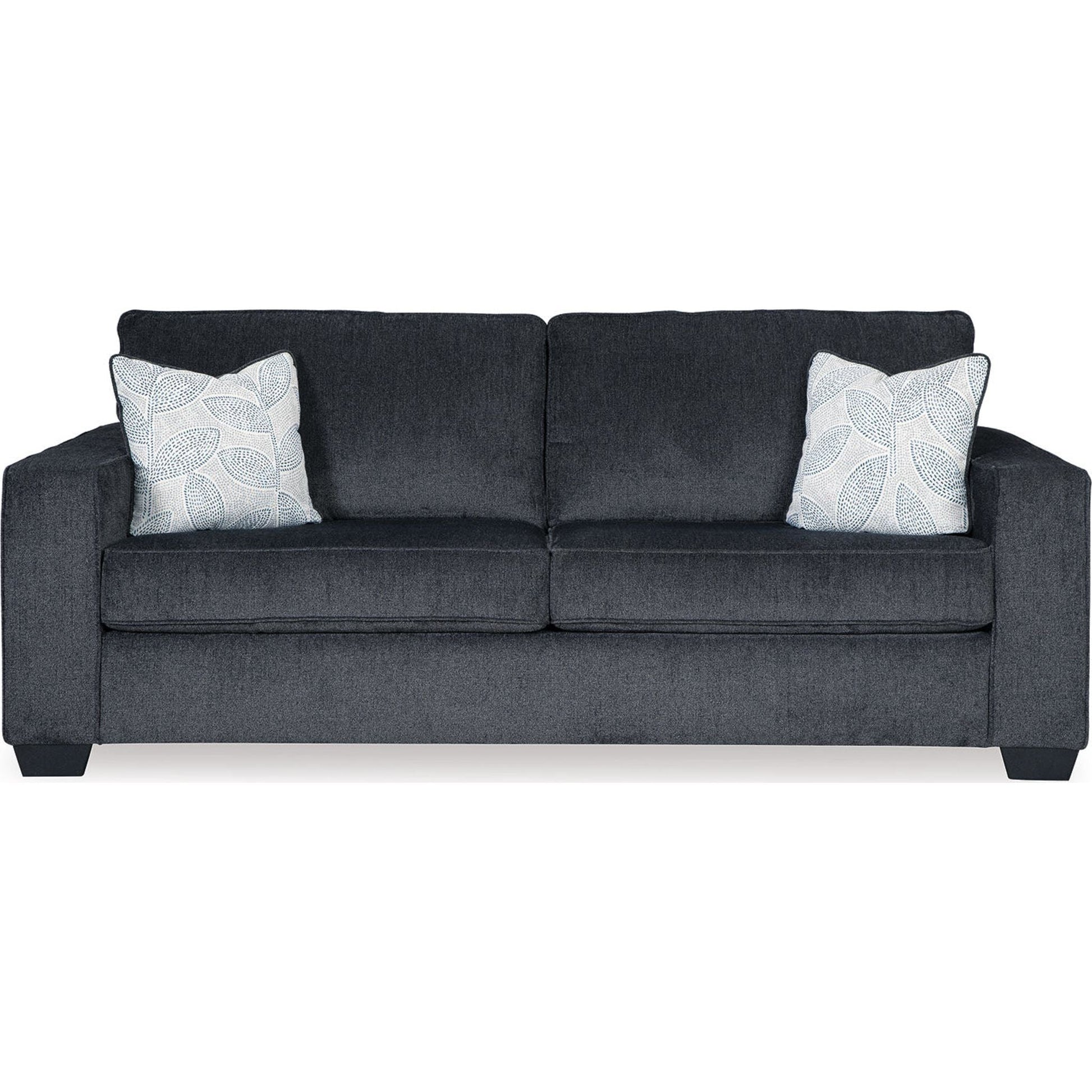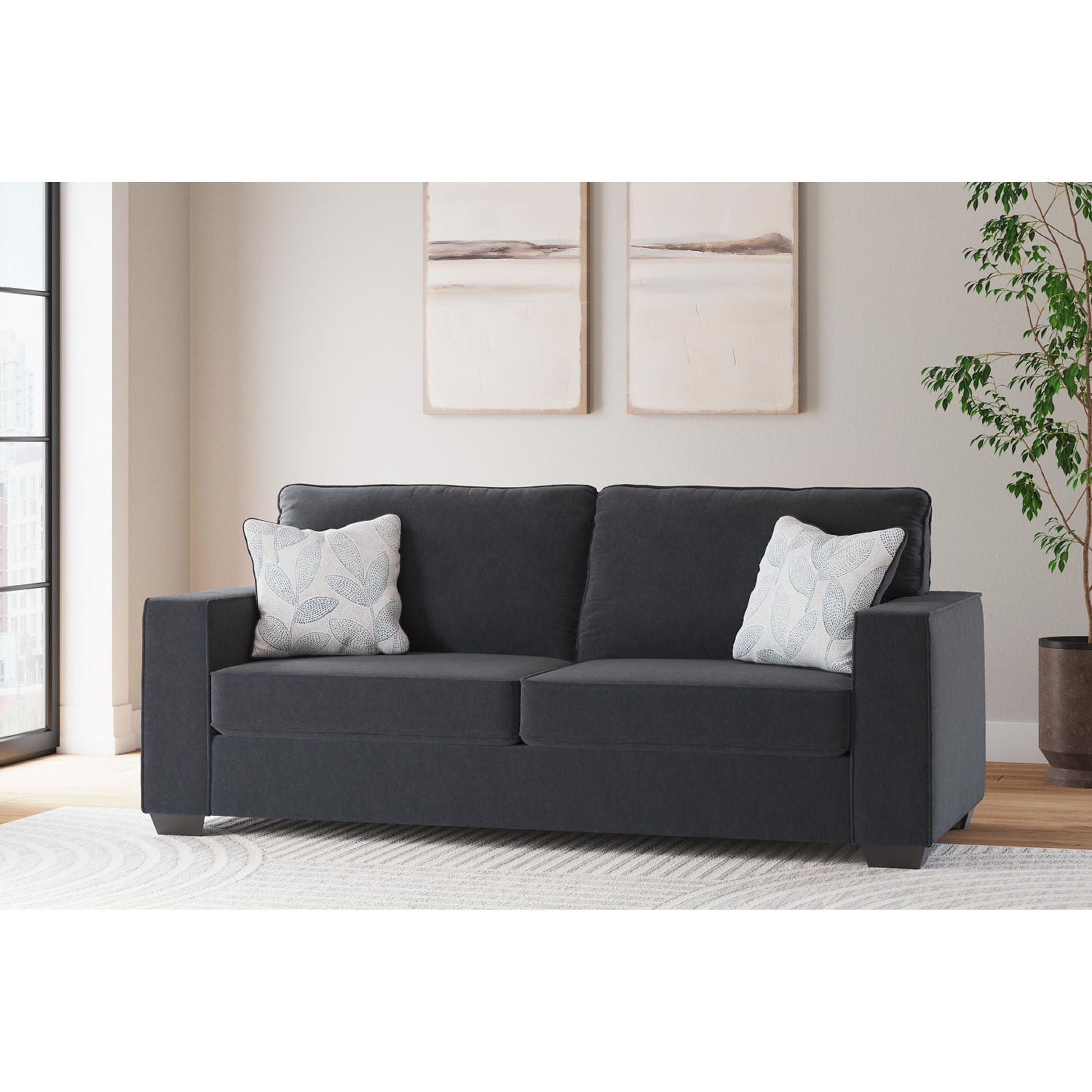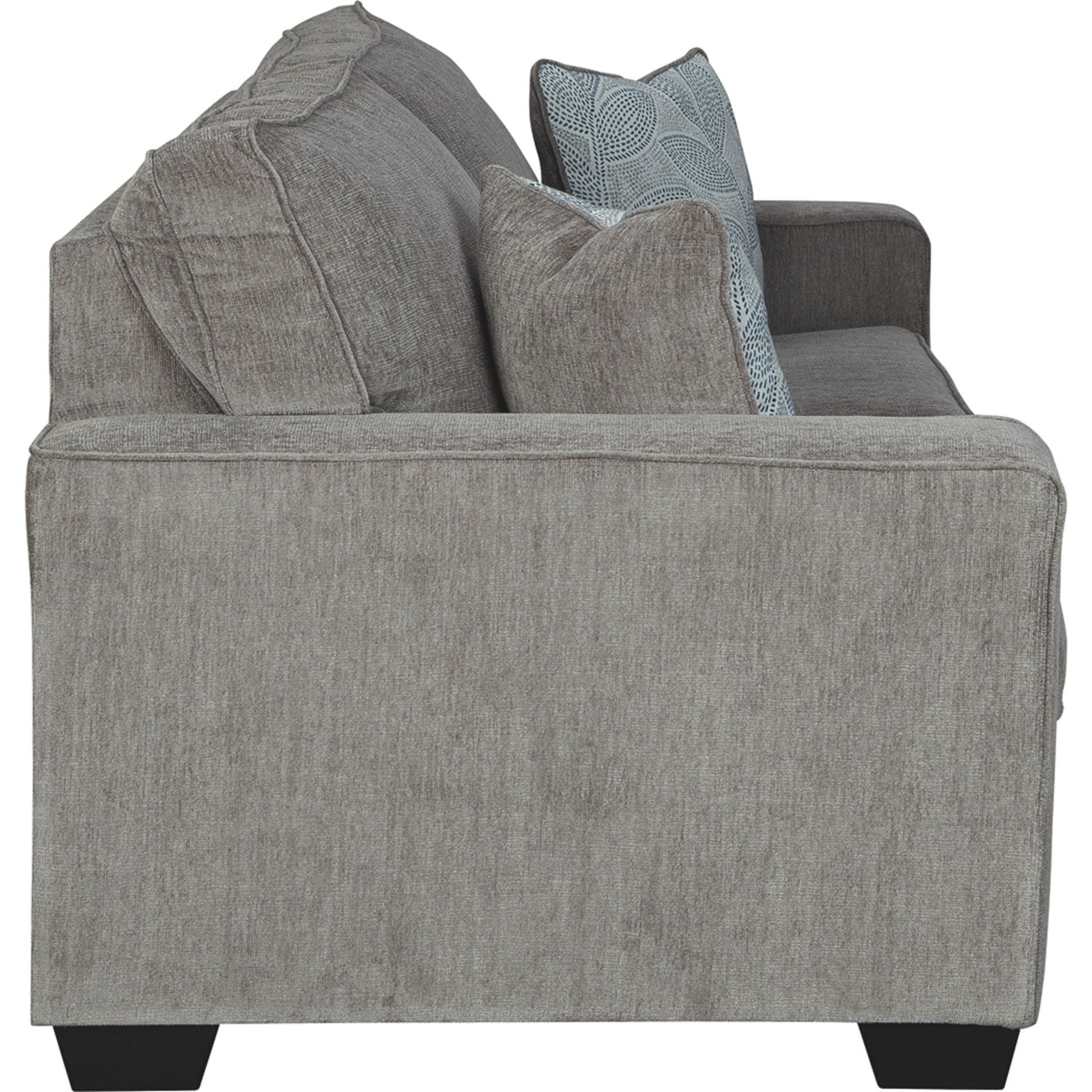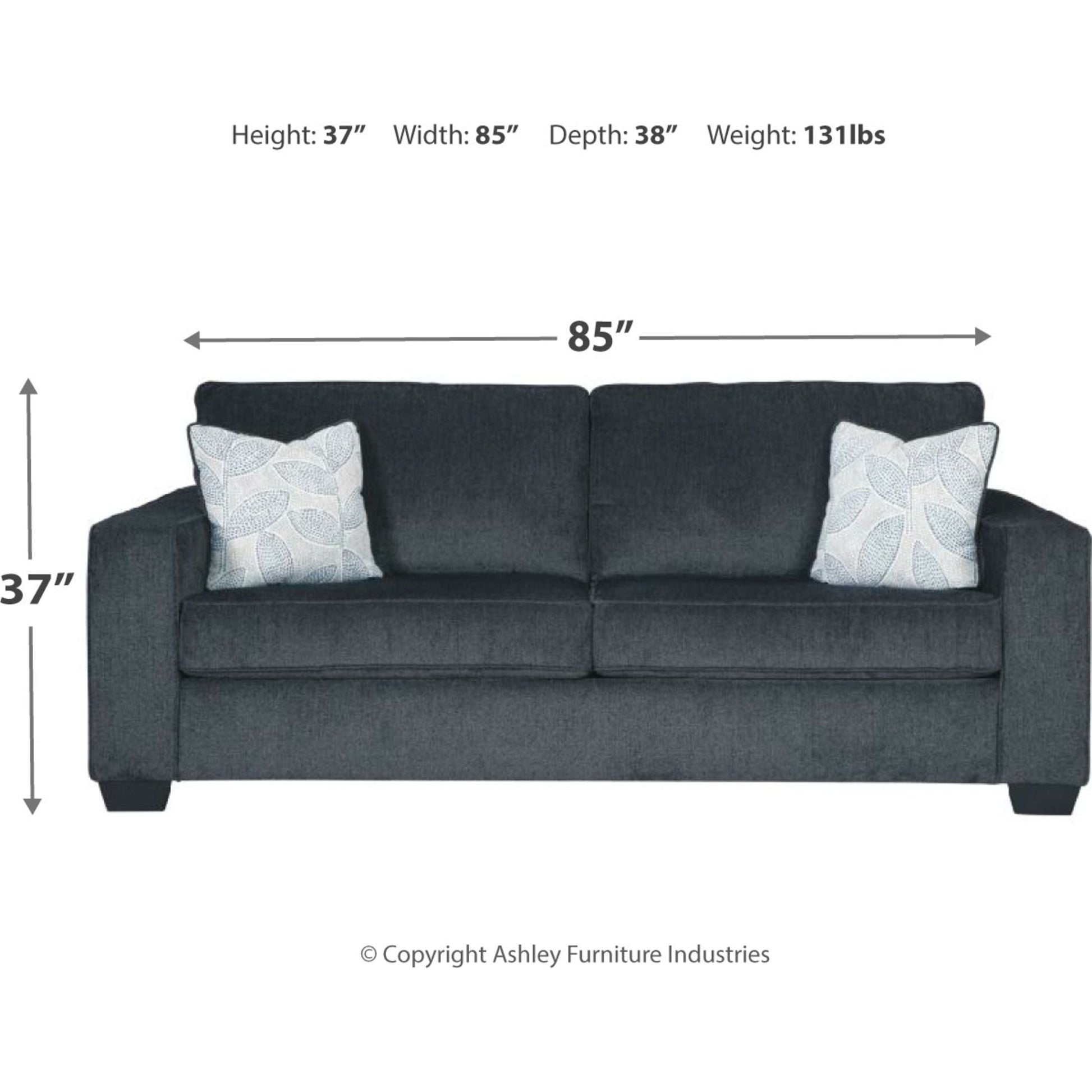 If style is the question, then this sofa is the answer. Sporting clean lines and sleek track arms, the decidedly contemporary profile is enhanced with plump cushioning and a chenille-feel upholstery, so pleasing to the touch. Sure to play well with so many color schemes, this sofa in slate gray includes a pair of understated floral pattern pillows for fashionably fresh appeal.