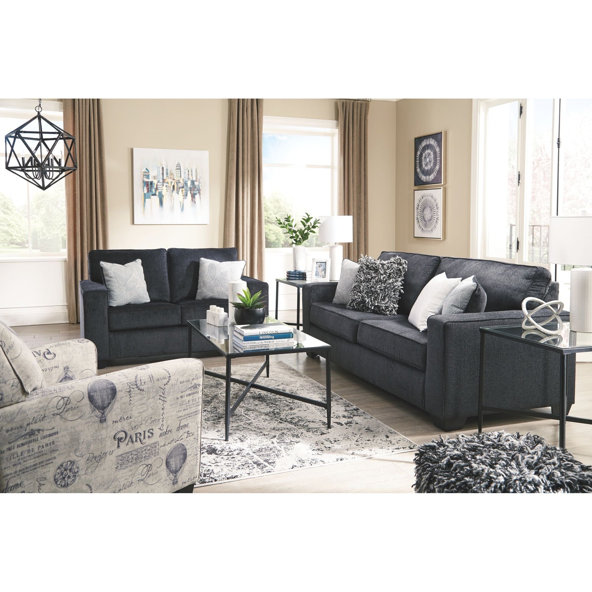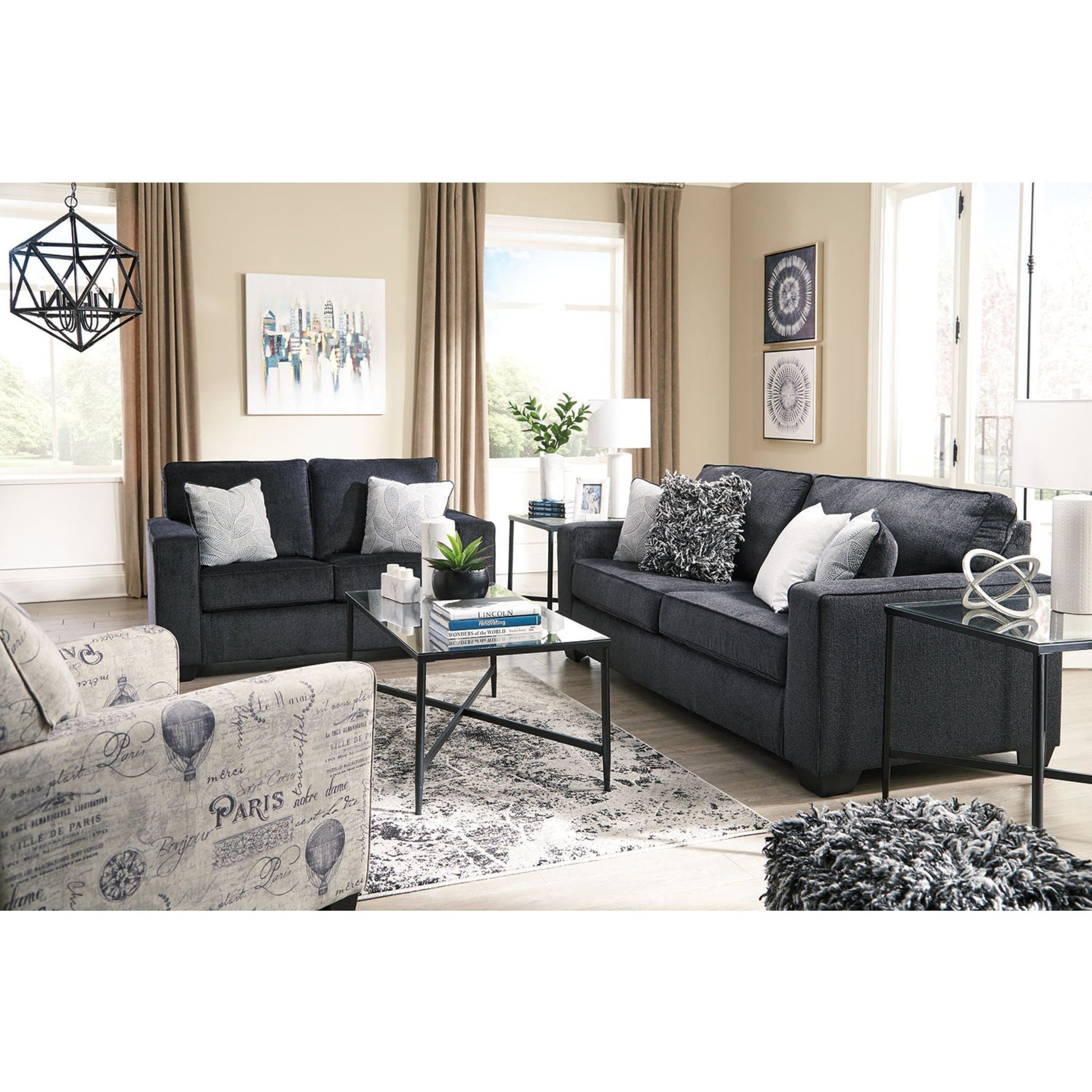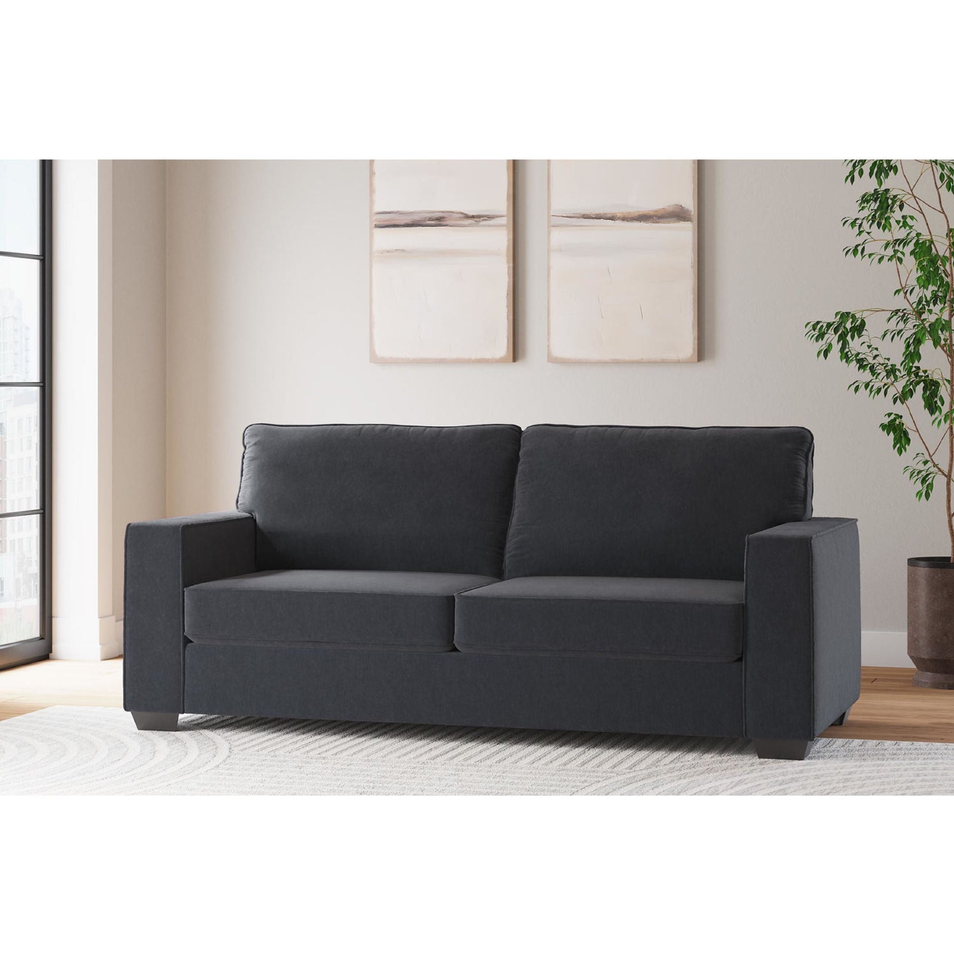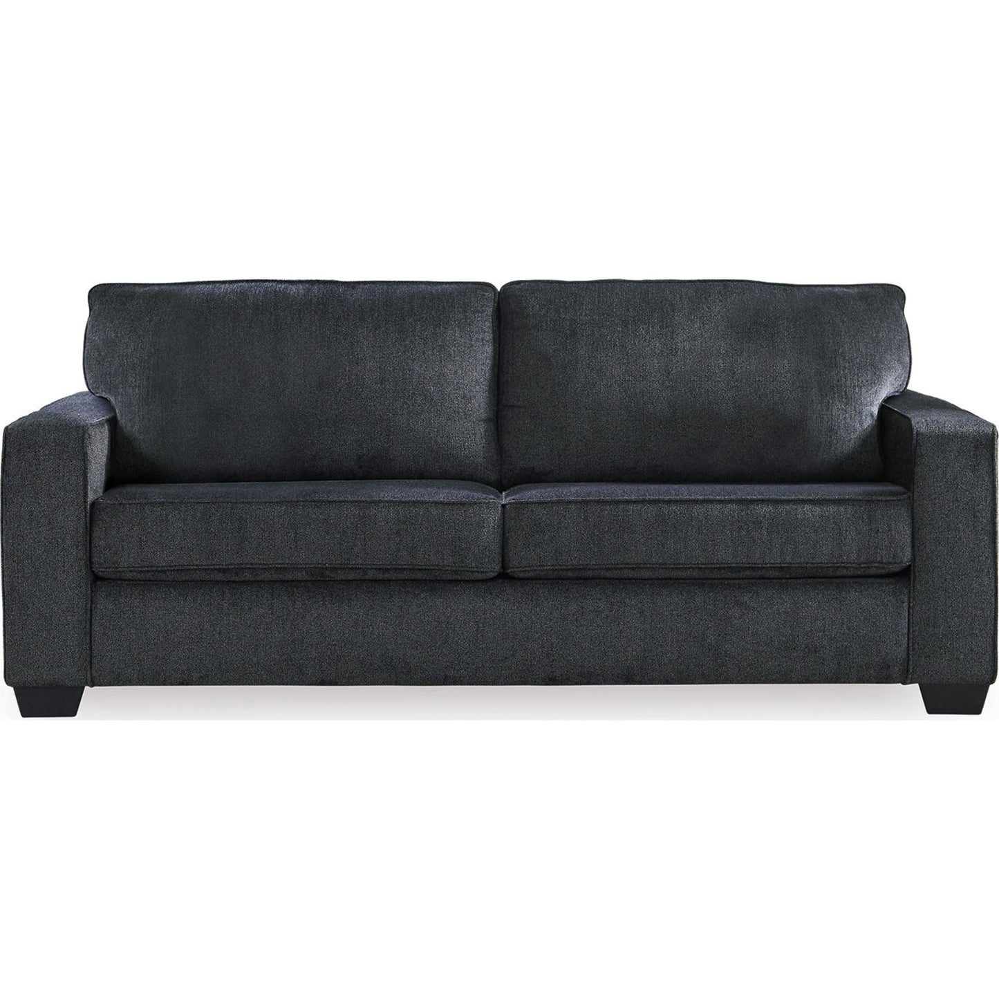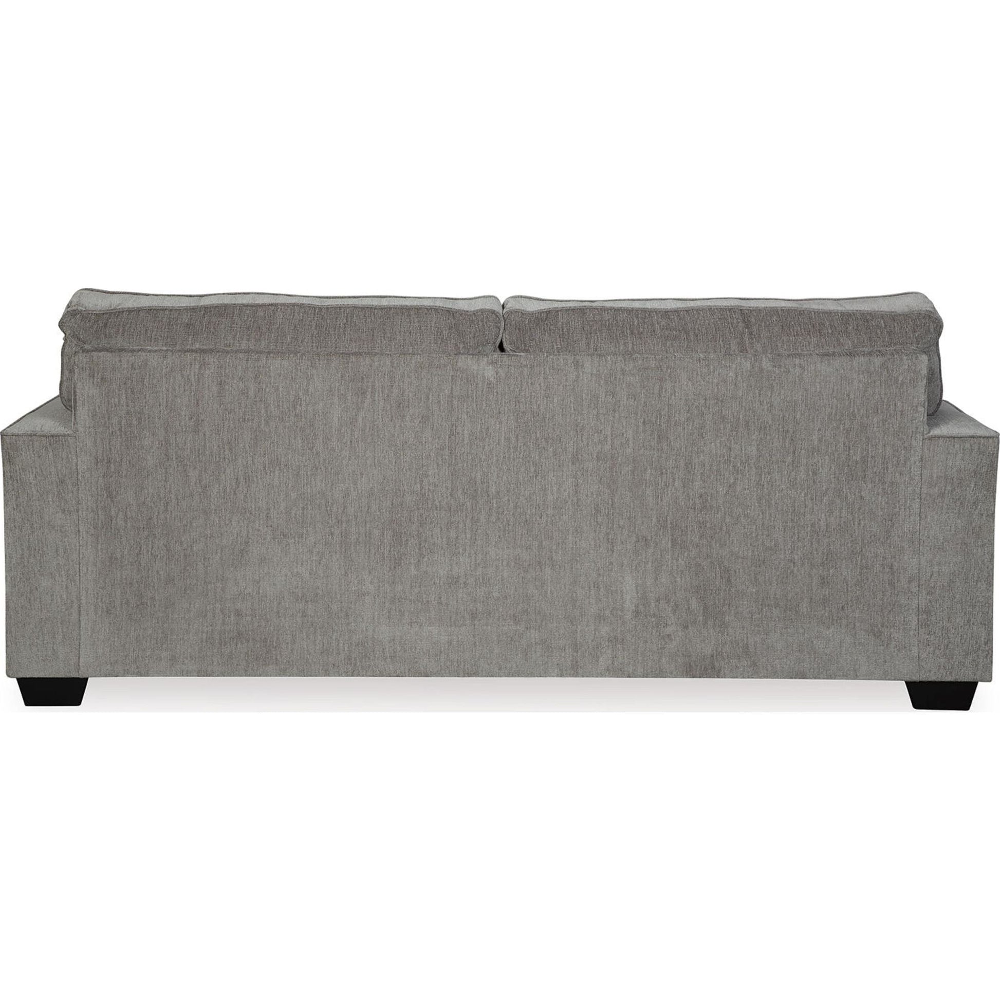 If style is the question, then this sofa is the answer. Sporting clean lines and sleek track arms, the decidedly contemporary profile is enhanced with plump cushioning and a chenille-feel upholstery, so pleasing to the touch. Sure to play well with so many color schemes, this sofa in slate gray includes a pair of understated floral pattern pillows for fashionably fresh appeal.