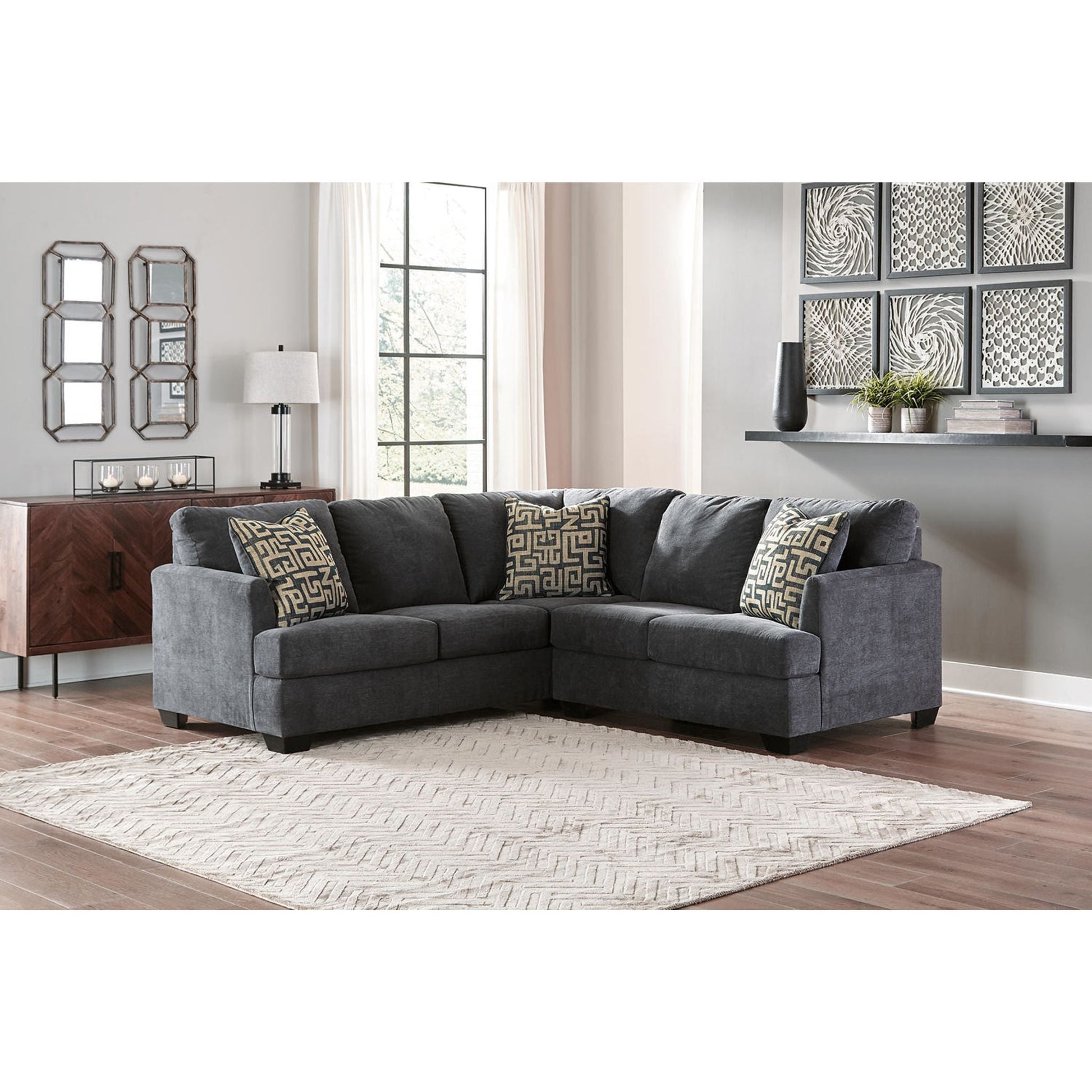 This sectional makes a stylish statement in modern design. Velvety soft upholstery is love at first touch, and its stunningly simple look is right at home in contemporary decor. The neutral gunmetal hue blends easily with any color scheme. Patterned accent pillows in complementary colors add bold contrast and a soft touch.