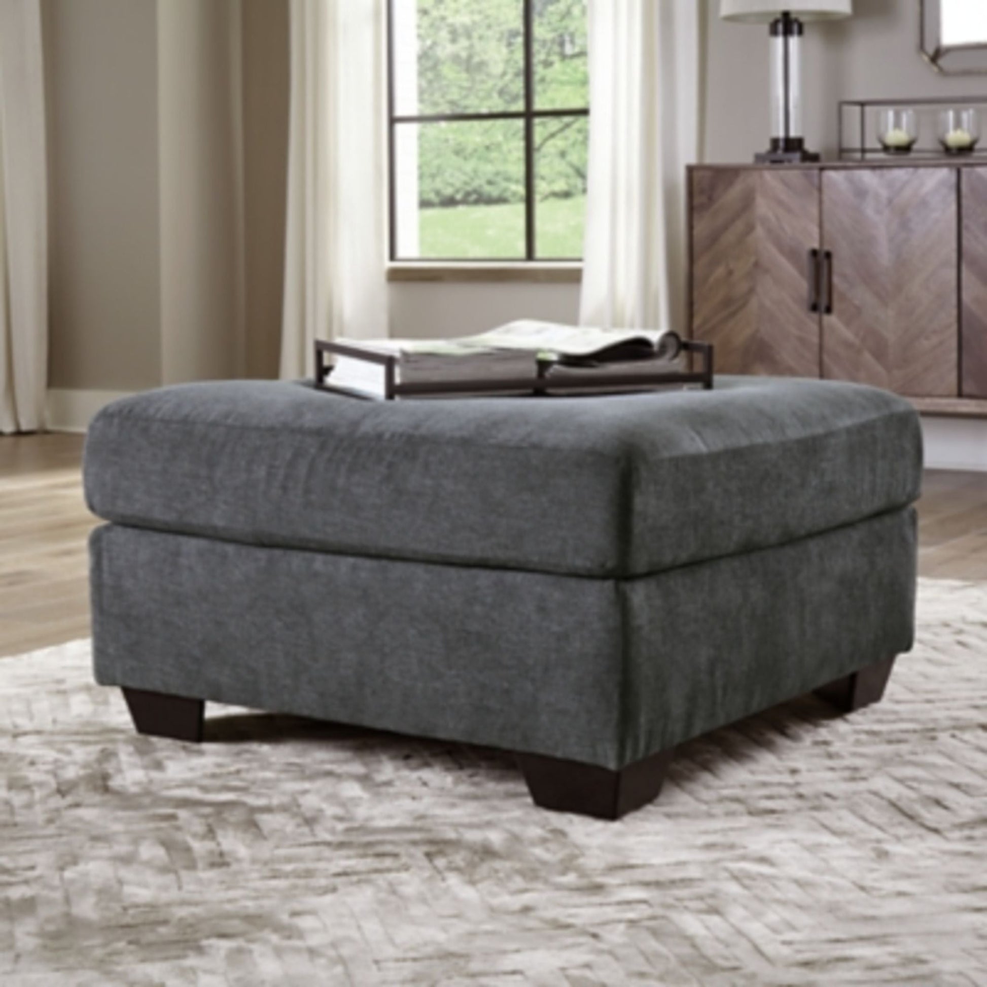This oversized accent ottoman makes a statement in modern room decor. Velvety soft upholstery is love at first touch and its stunningly simple design is right at home in an urban setting. A neutral gunmetal hue blends easily with any color scheme. Ideal for resting tired feet at the end of a long day, this versatile piece is also a convenient place to put a serving tray and an ideal spot for the game board on game night.