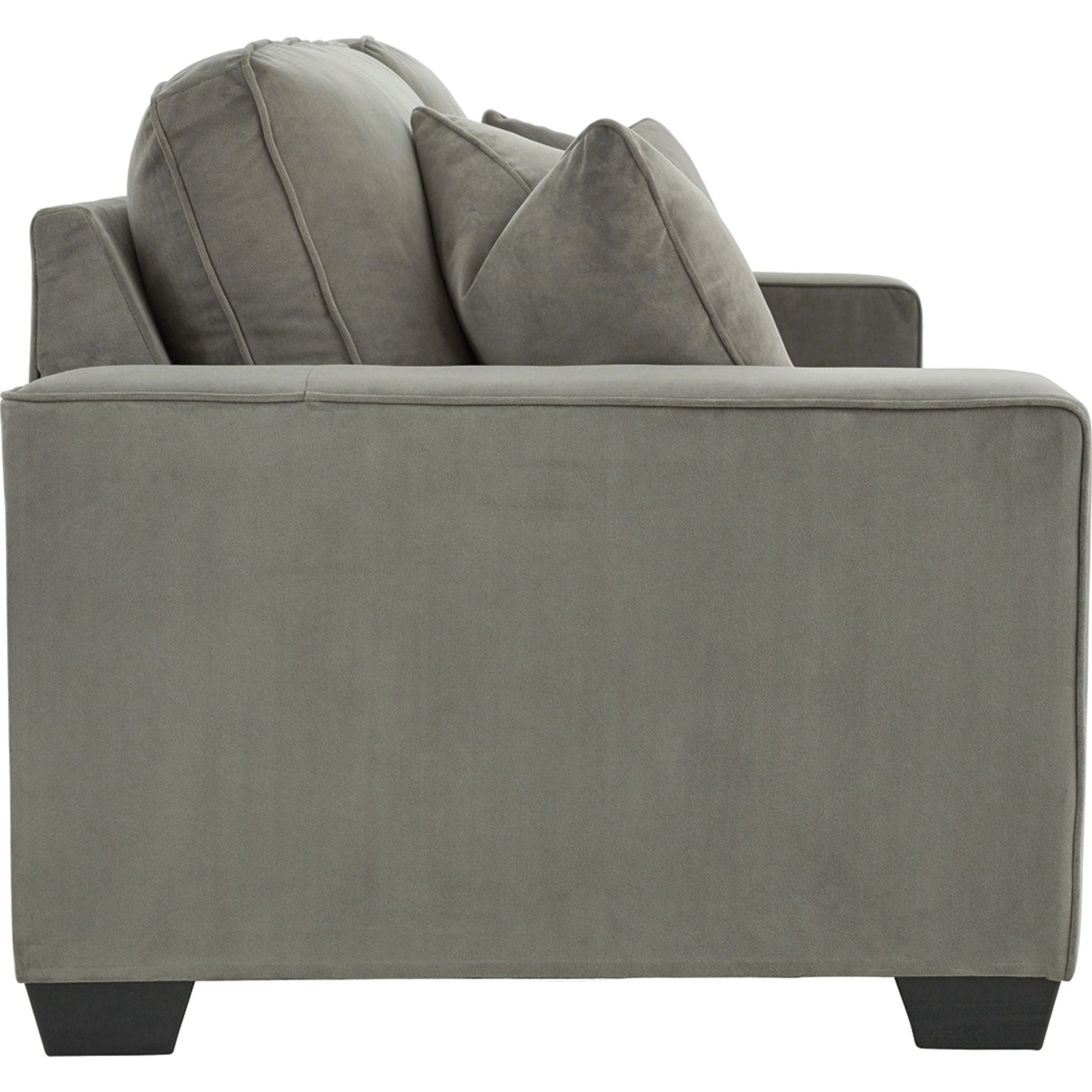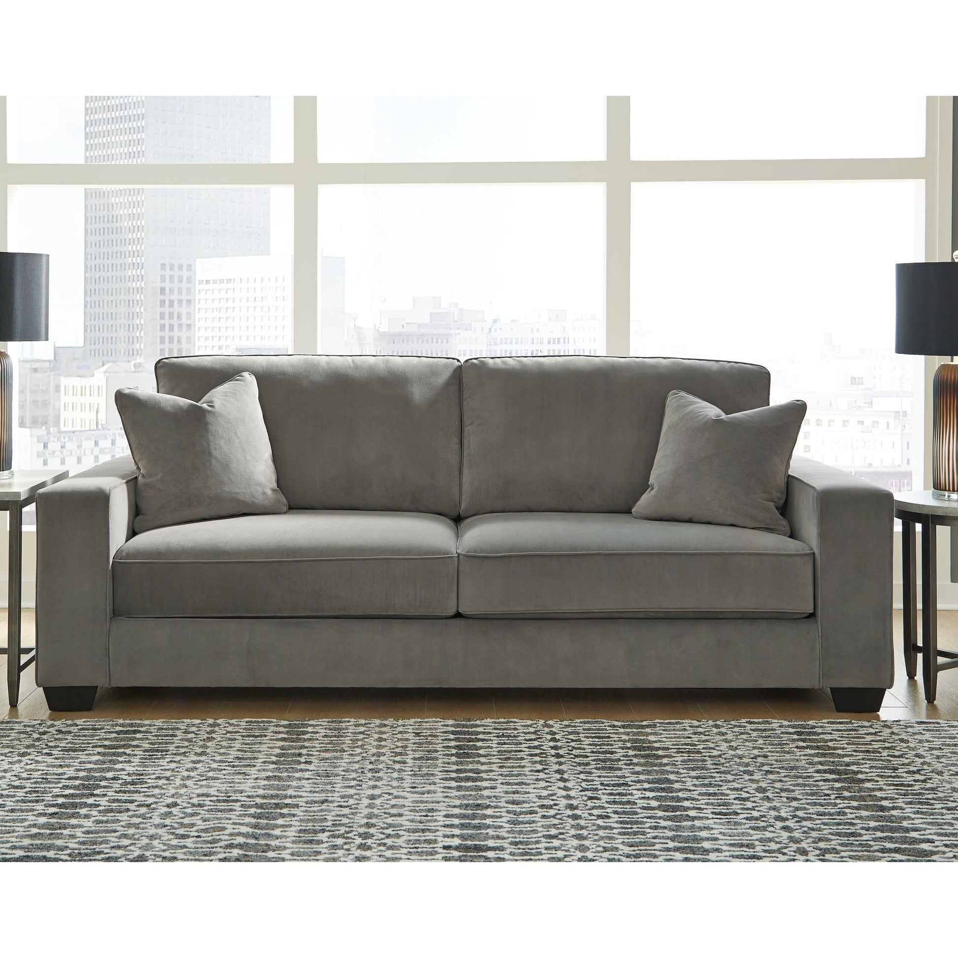 Serving up a refined, upscale look—at an incomparable value price—this sofa lures from every angle. Crisp, 2-over-2 cushion design, wide track arms and black tapered feet lend a clean, contemporary aesthetic. Velvety soft upholstery in a chic sandstone gray upholstery takes neutral to another level. Matching feather-filled throw pillows master the art of minimalism.
