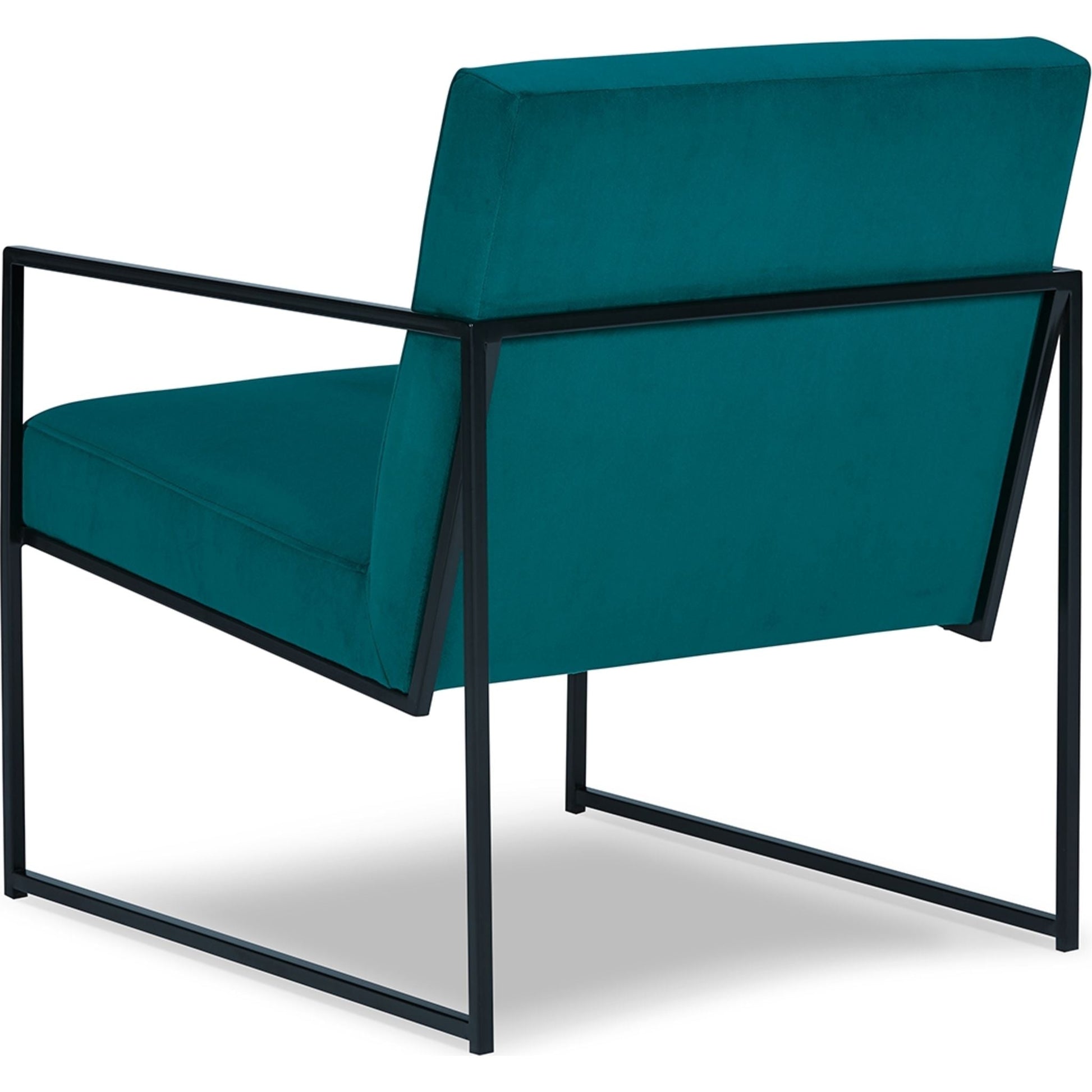 Dress up your reading nook or den with the decidedly contemporary stylings of this accent chair. Velvet fabric in a teal tone provides a pop of soft color while remaining reserved and refined in appearance. A streamlined metal frame polishes off the posh design.