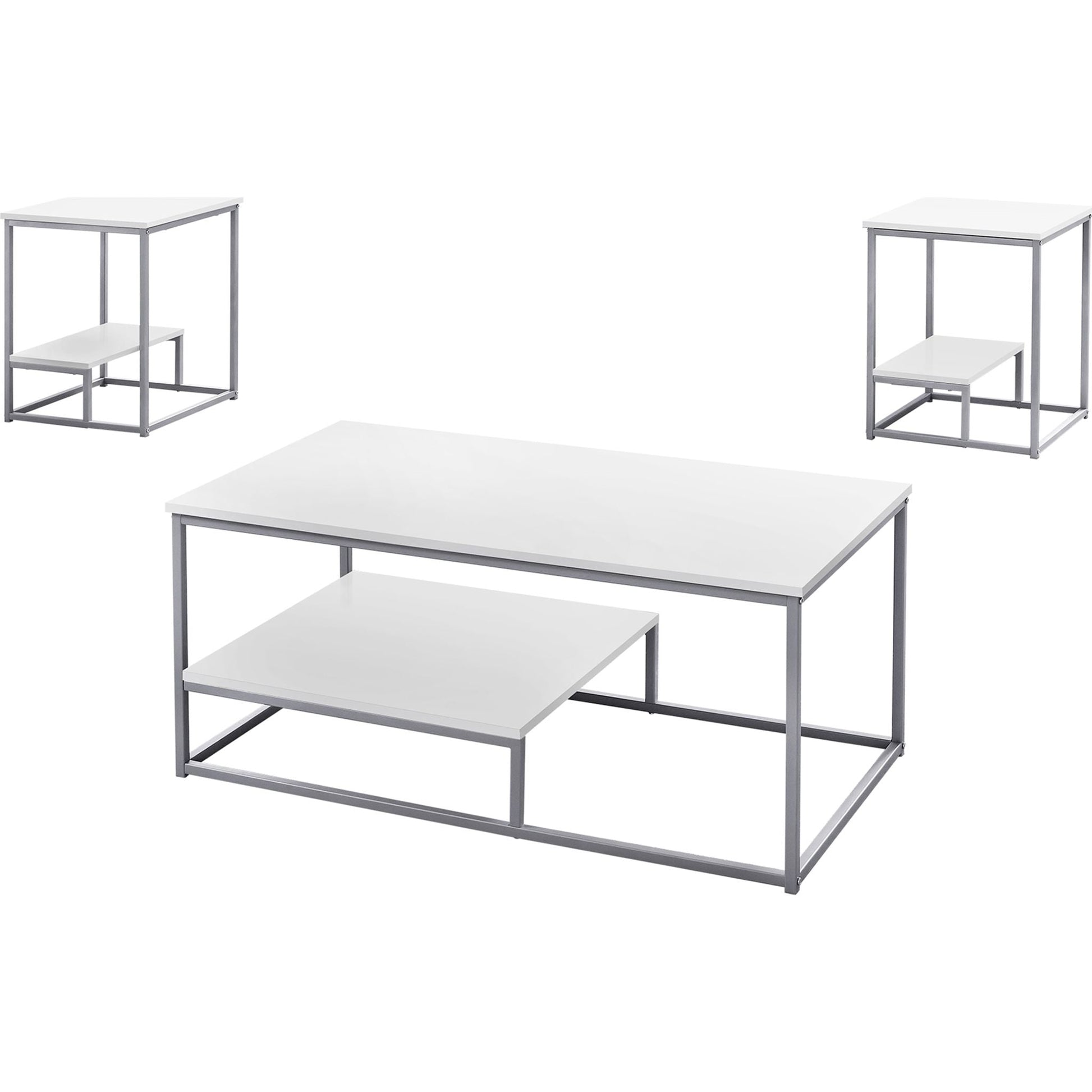Bring a fresh modern update to your living space with this unique 3 piece coffee table set. The simple contemporary design in a chic white finish and accented with a silver metal trim, provides a spacious table top with a raised bottom half shelf for additional storage and display. The matching end tables are perfect to place a lamp, pictures, or other decorative objects while the coffee table will be an attractive focal point in your living room, den, or family room.