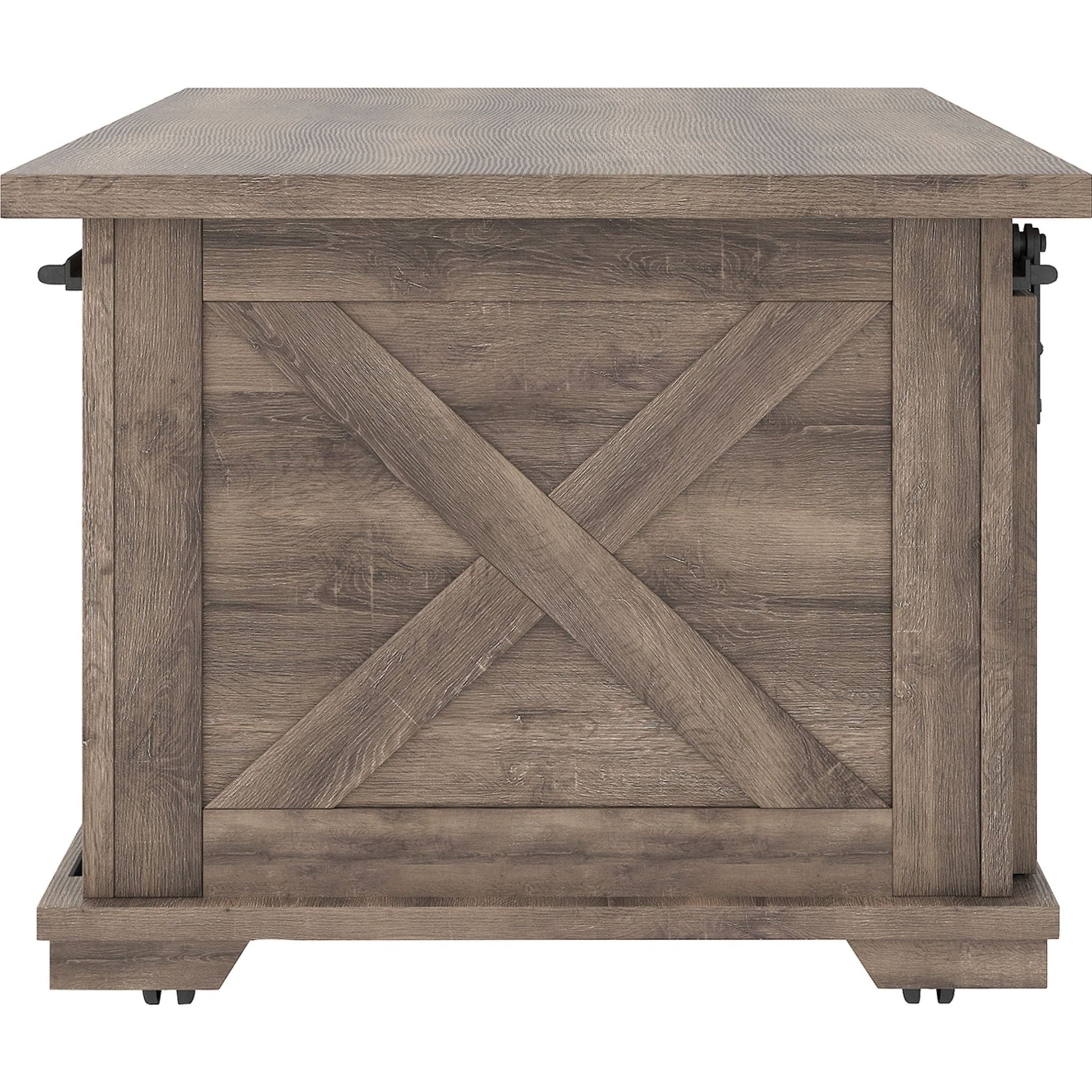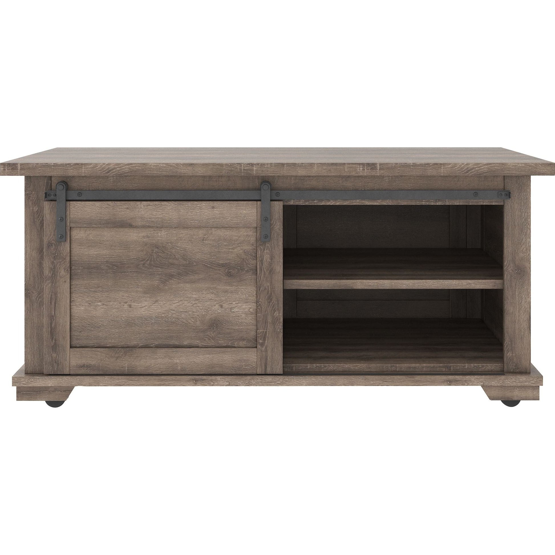 Raise the bar on modern farmhouse design with the Arlenbry storage coffee table. Sporting a handsome weathered oak effect and cross buck accents, the table's unique sliding barn door moves to reveal shelved storage space. Easy roll casters add a cool touch that's right on trend.