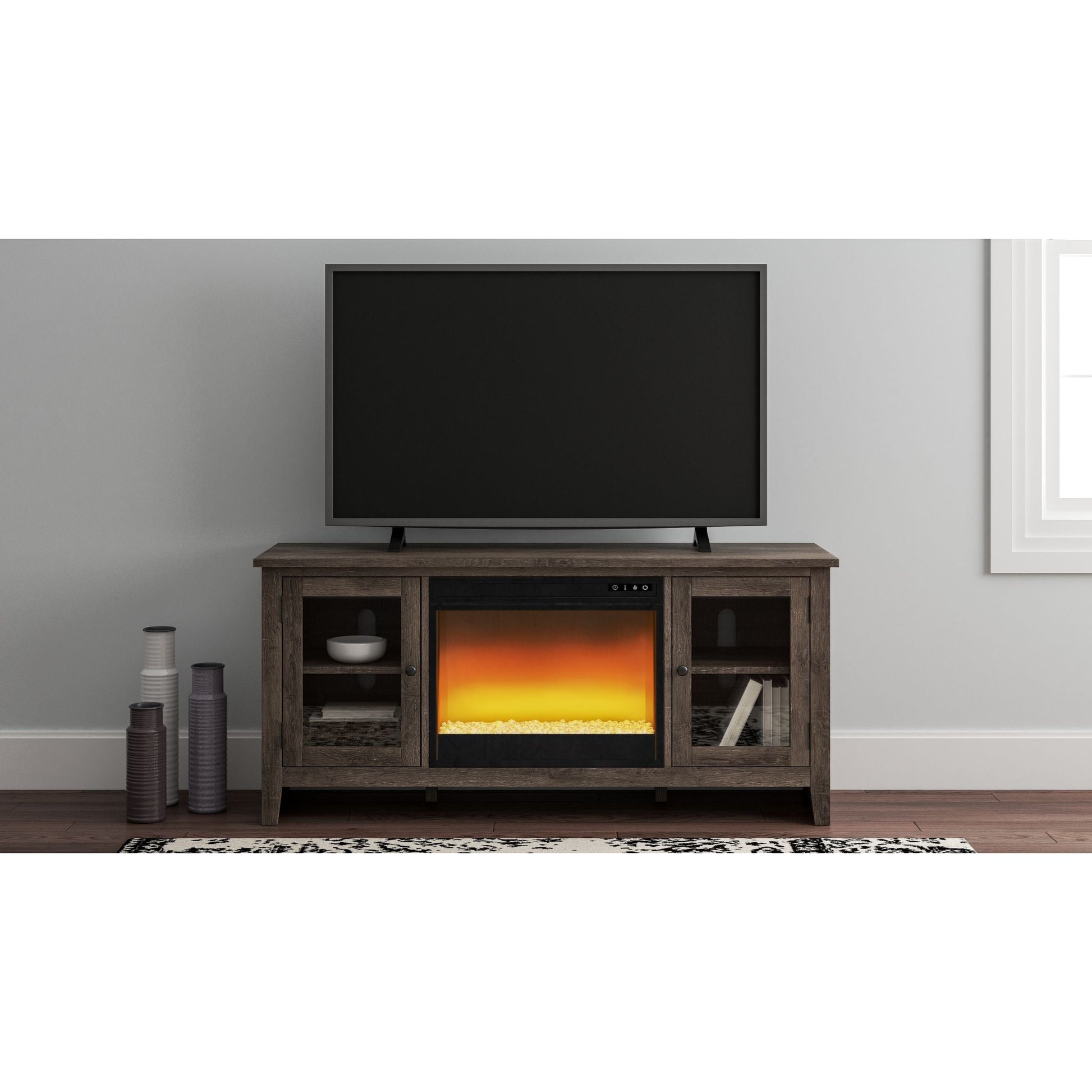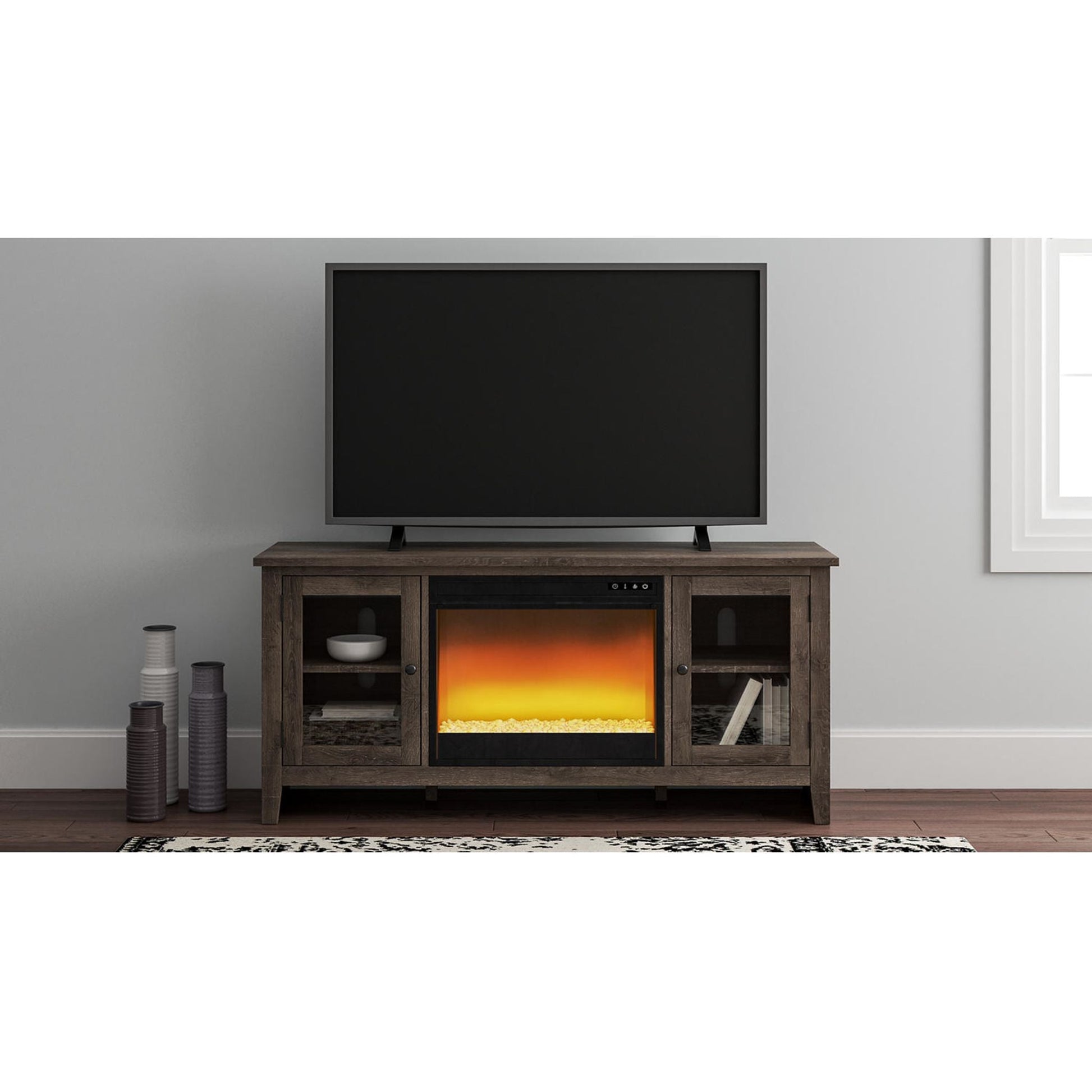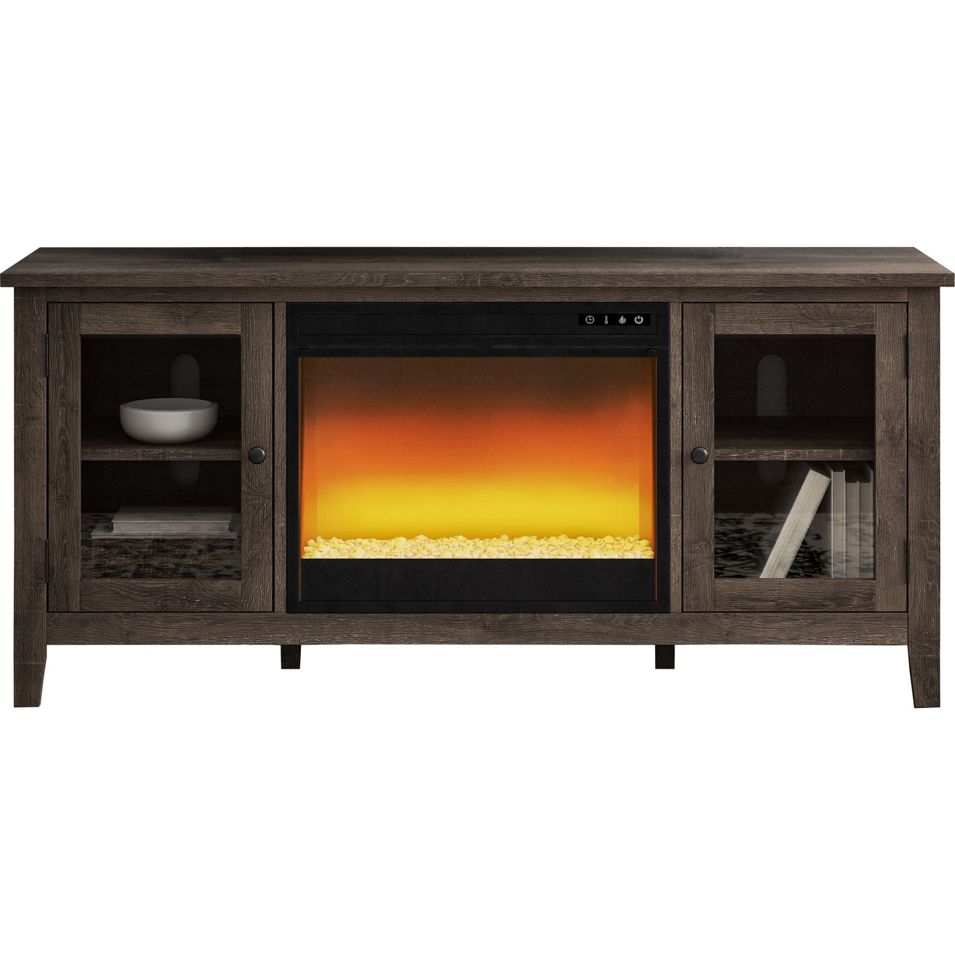 With its replicated weathered oak finish and minimalist charm, this TV stand with LED fireplace insert is right in tune with your relaxed approach to high style. Beautifully made to accommodate your media equipment, it’s well equipped with adjustable shelving, cutouts for wire management and a pair of glass-front doors that enhance the clean-lined aesthetic. The look is ideal for modern farmhouse and contemporary settings. Adding that much more show-stopping style: an LED fireplace insert that operates with or without heat and includes a six-level temperature setting, remote control and overheating control for added safety. The fireplace insert comes with optional faux glass crystals and natural stones, so you can customize the look of the flame bed.