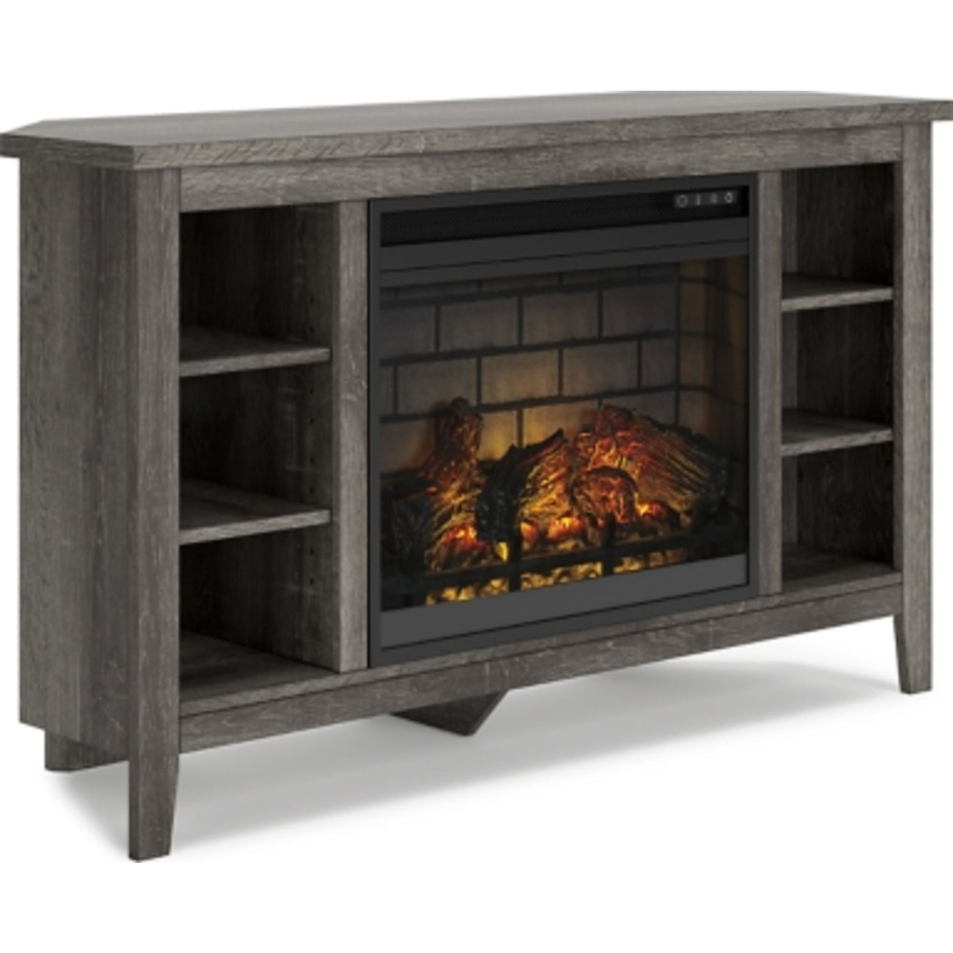 With its replicated weathered oak finish and authentic charm, this corner TV stand with electric fireplace is right in tune with your relaxed approach to high style. Beautifully shaped to nestle into any corner, it’s well equipped with adjustable and fixed shelving and cutouts for wire management. A mastery in modern farmhouse living, the electric infrared fireplace insert with faux firebrick surround operates with or without infrared heat and includes a multi flame feature, 7-level temperature setting, five brightness levels and LED glowing embers effect.