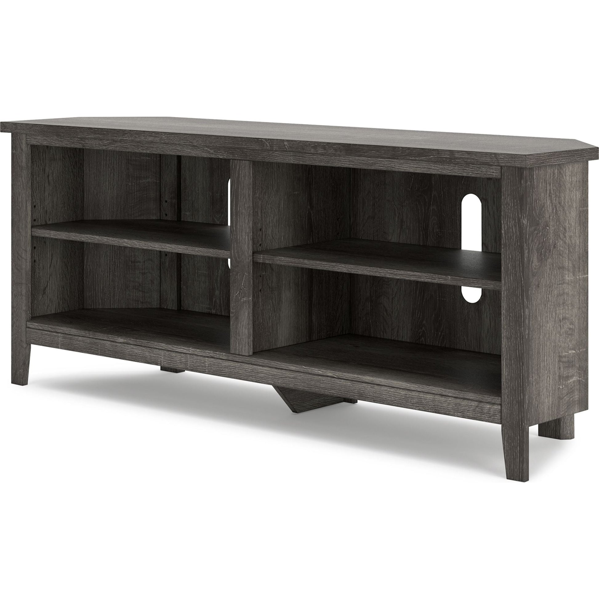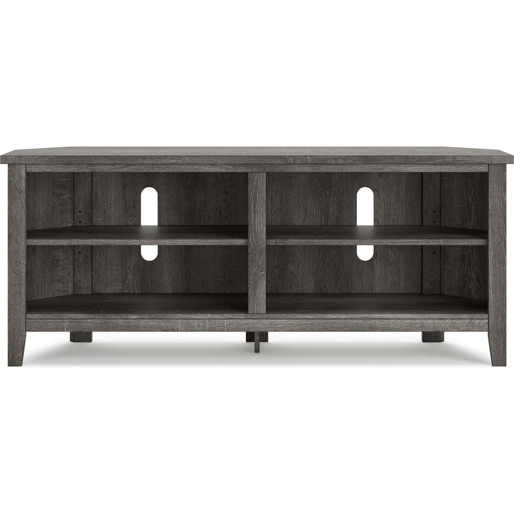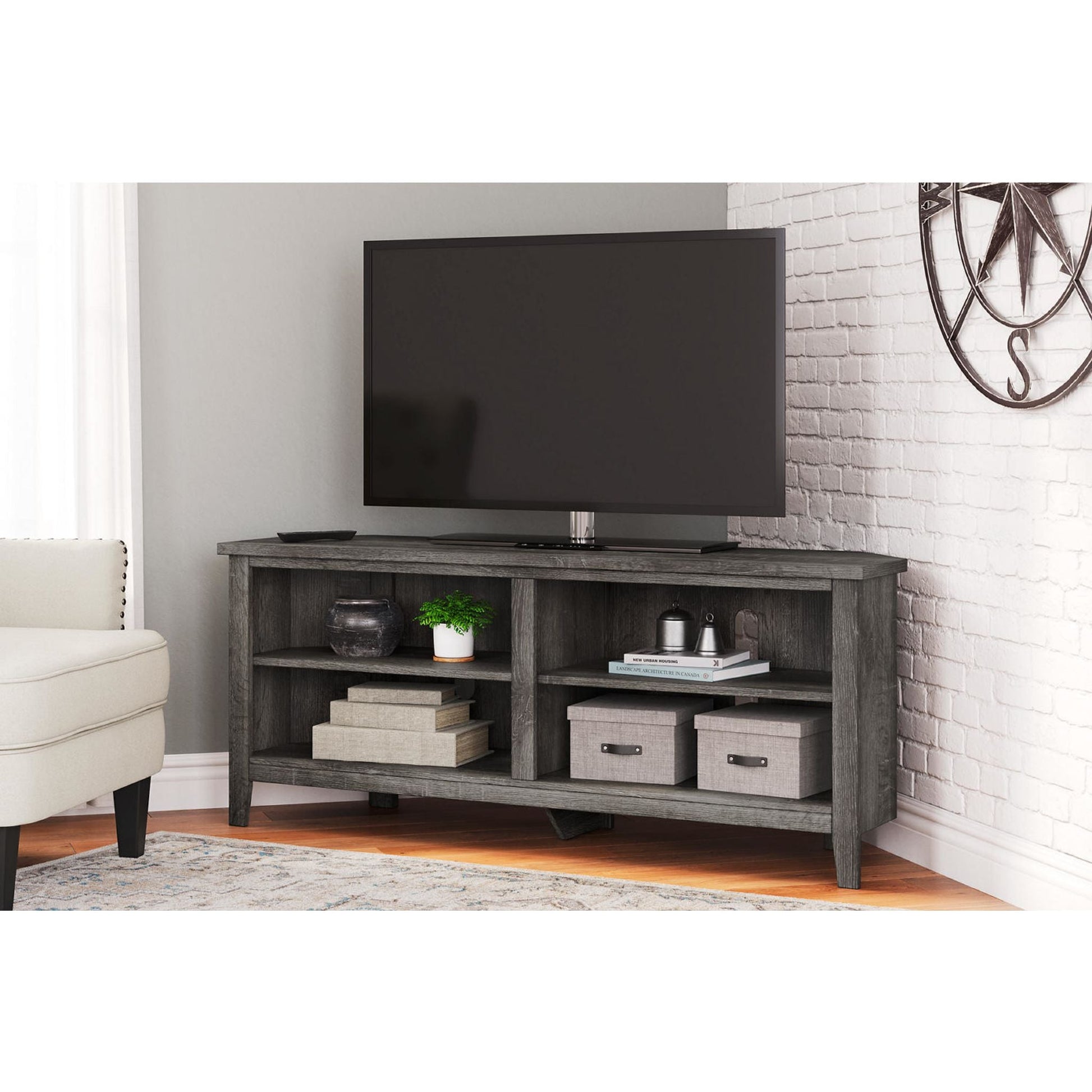 With its replicated weathered oak finish and authentic charm, this corner TV stand is right in tune with your relaxed approach to high style. Beautifully shaped to nestle into any corner, it’s well equipped with shelving and cutouts for wire management. What a mastery in modern farmhouse living for small spaces.