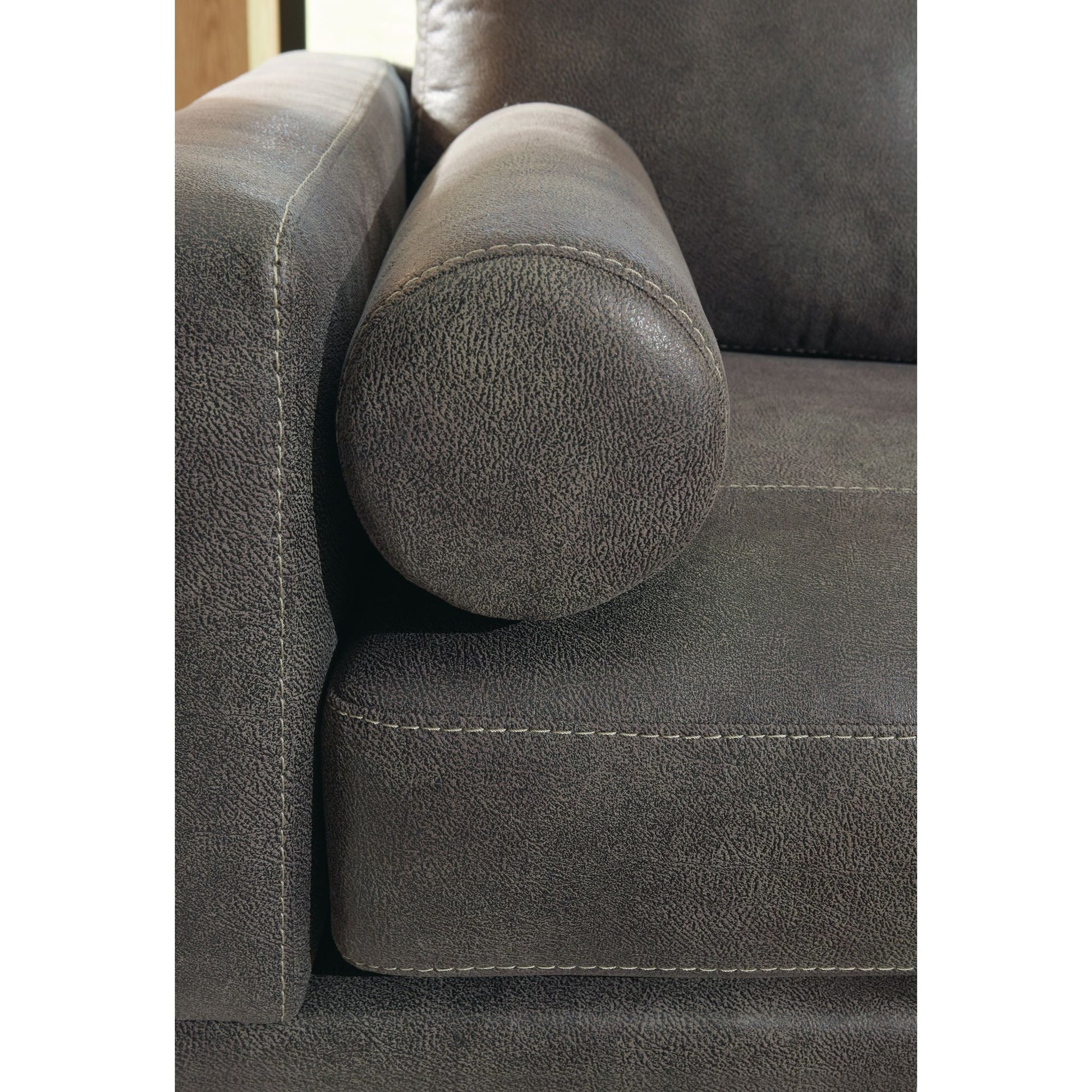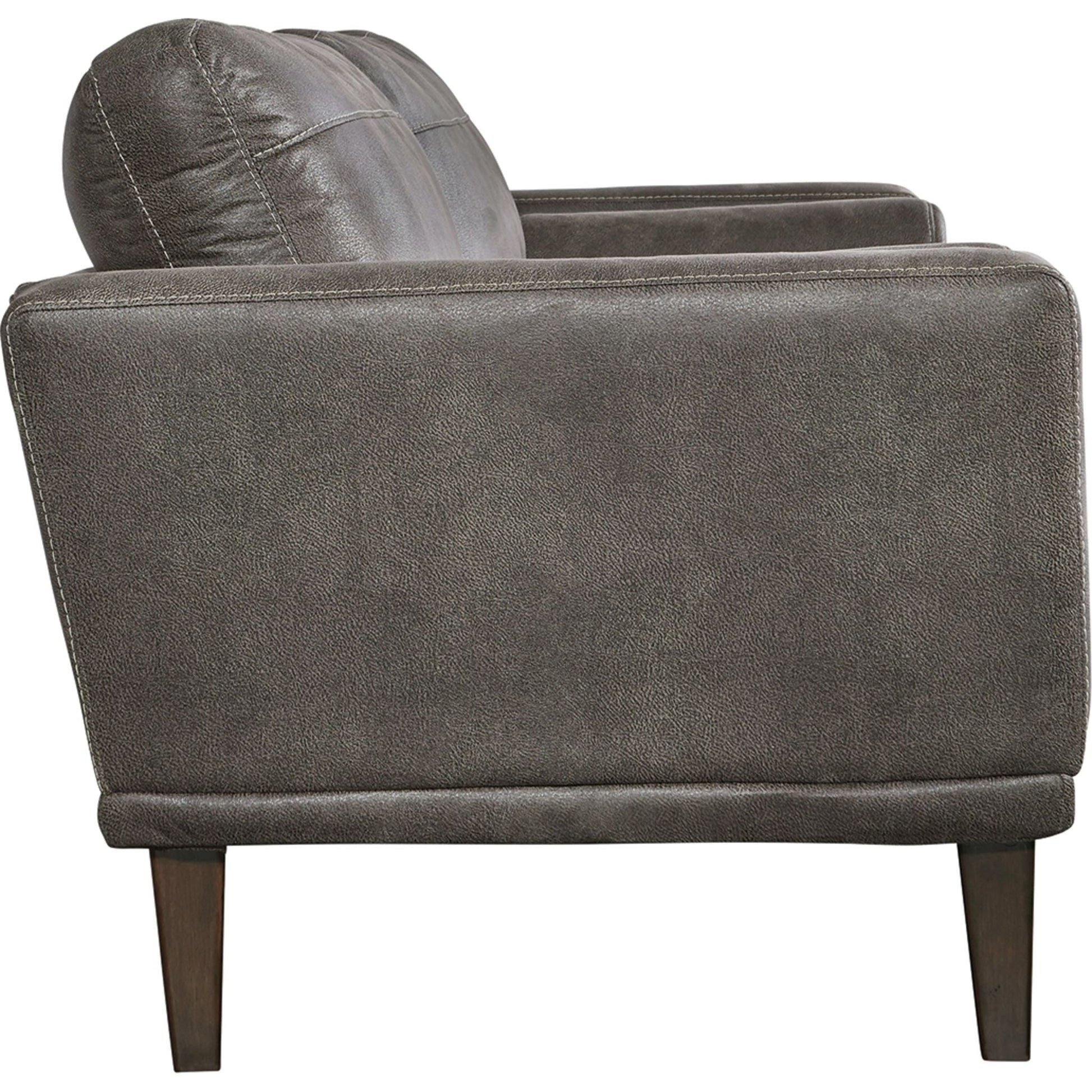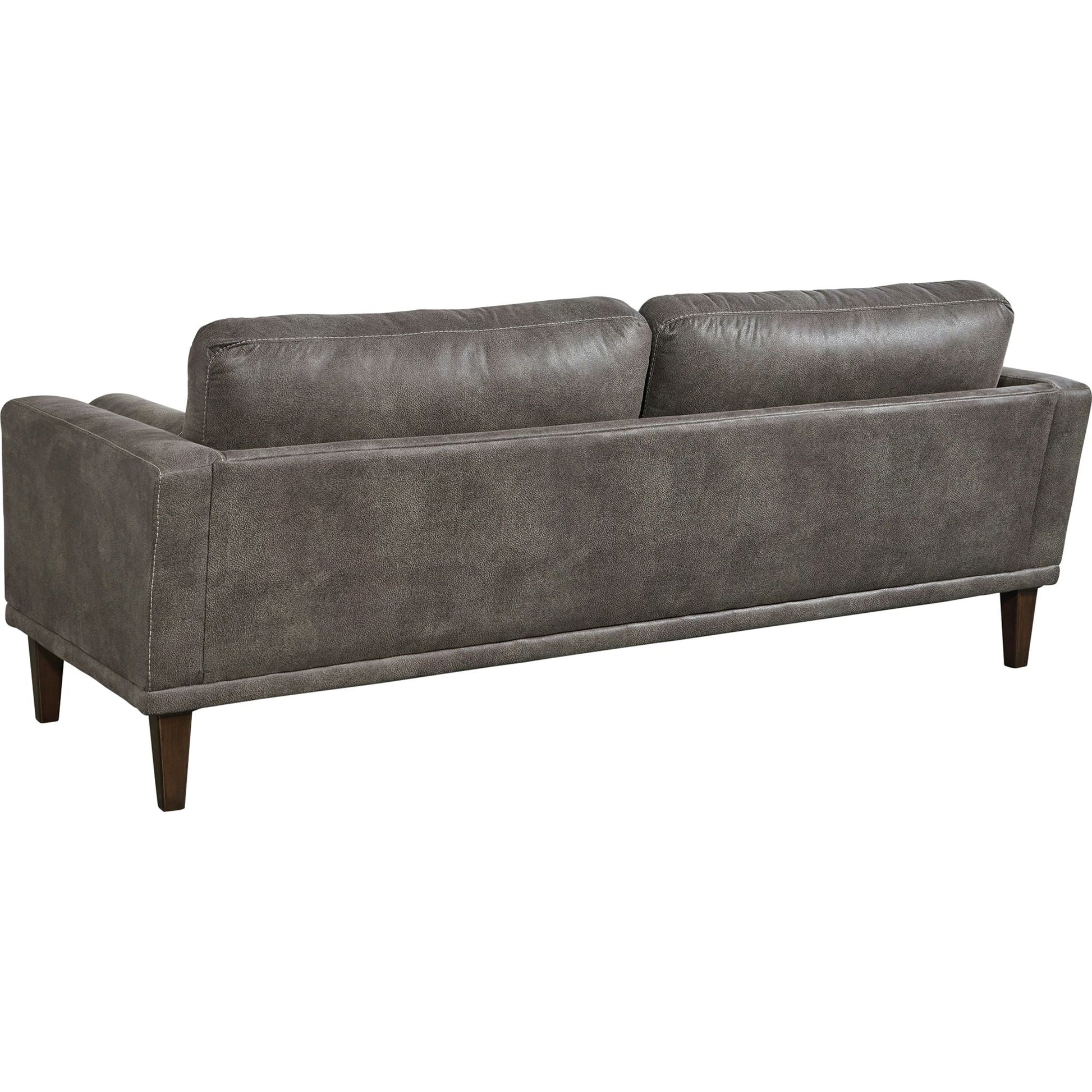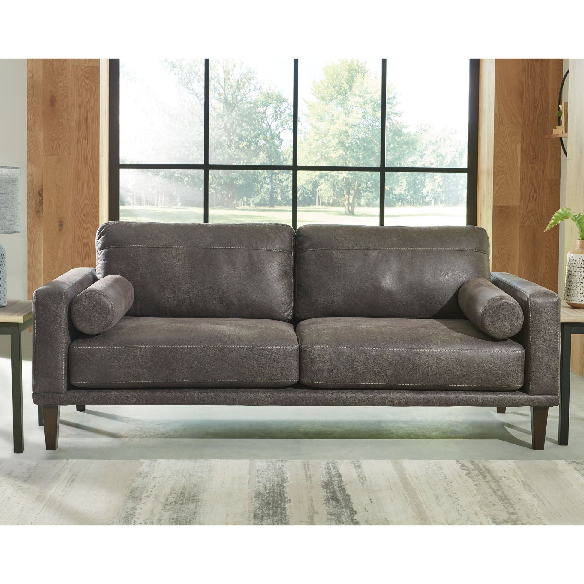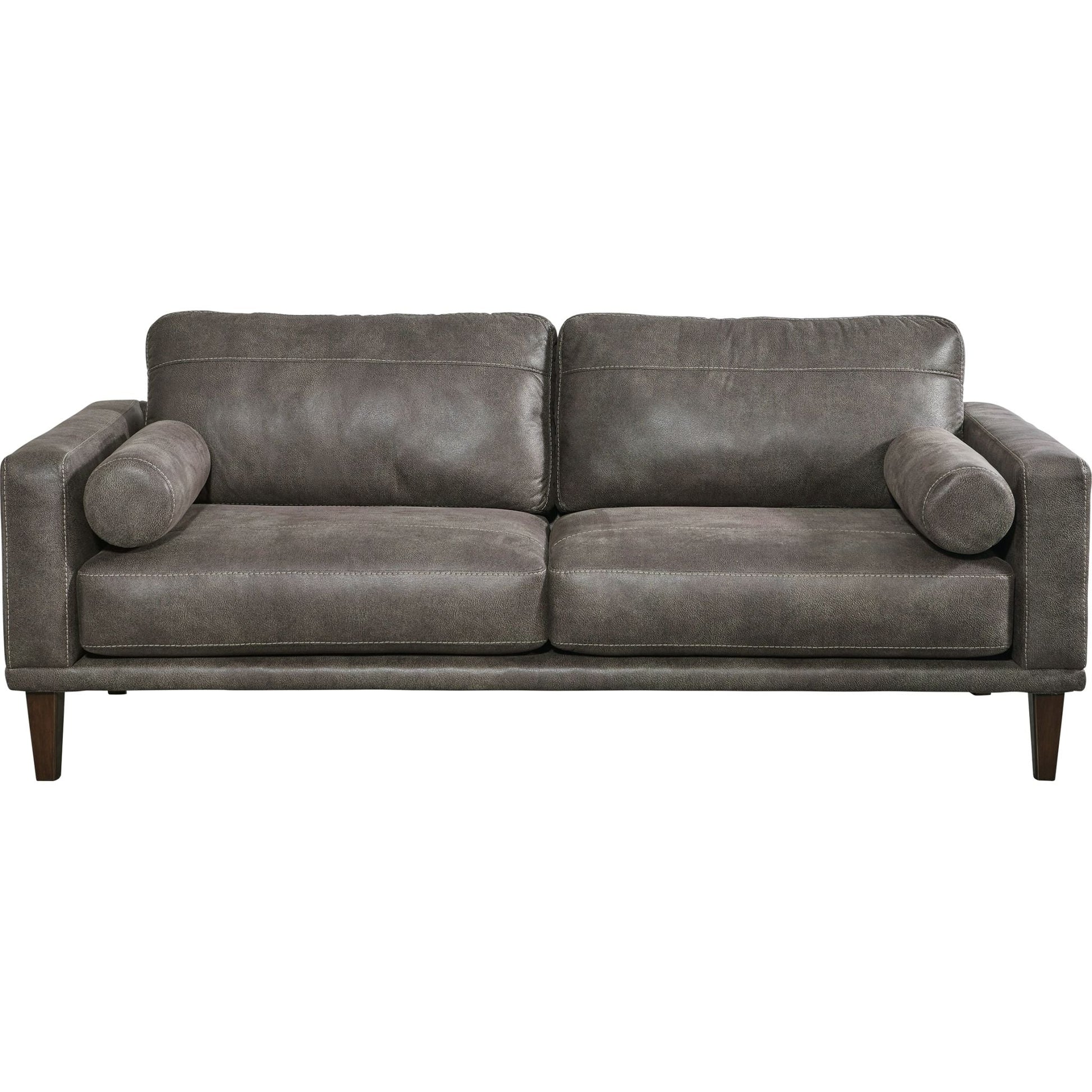 For a fresh spot in your space, turn to this designer sofa. This invigorating piece breathes warmth into your home with its striking gray faux leather upholstery, modern bolster pillows and tapered legs. Wind down at the end of a long day when you sink into this canyon of comfort.