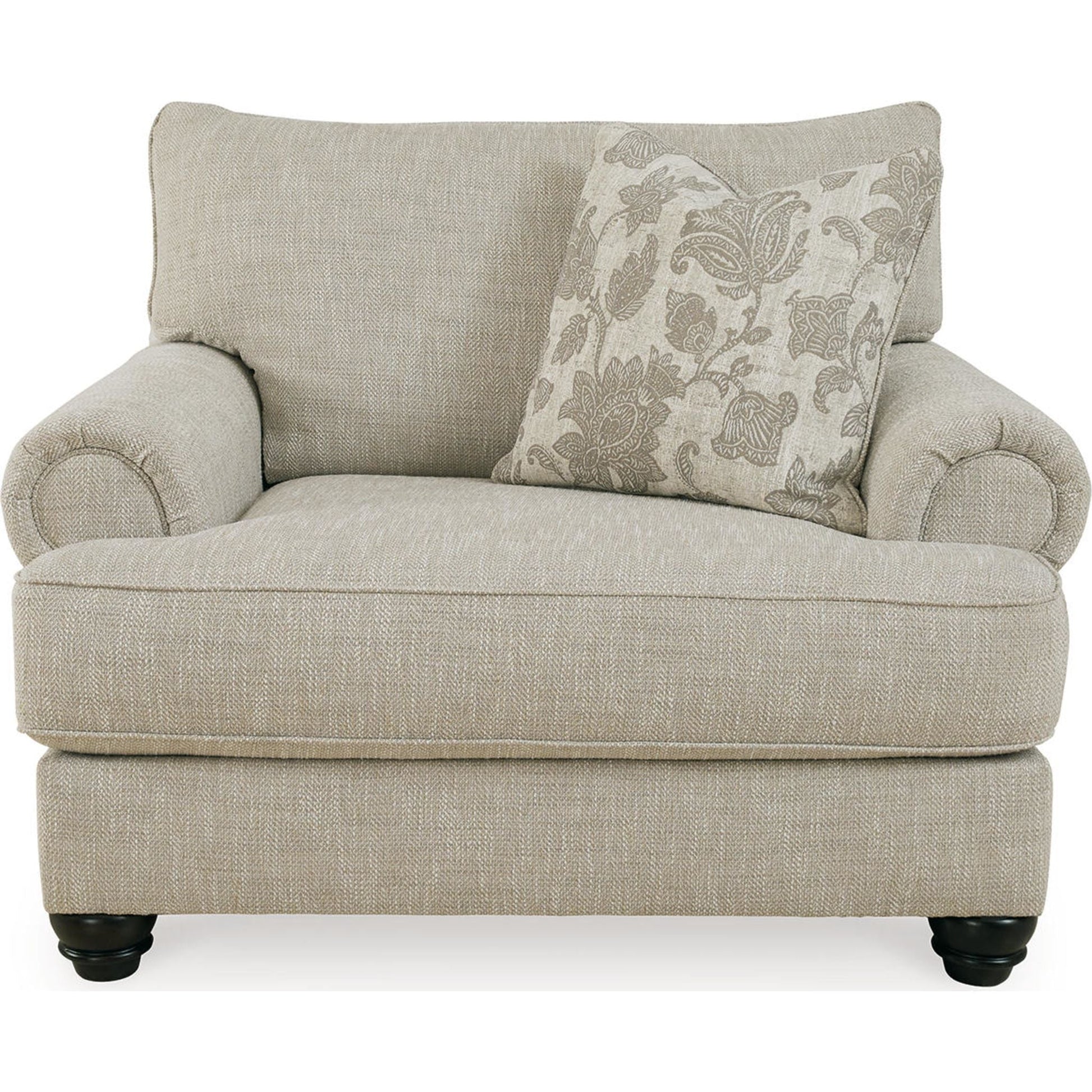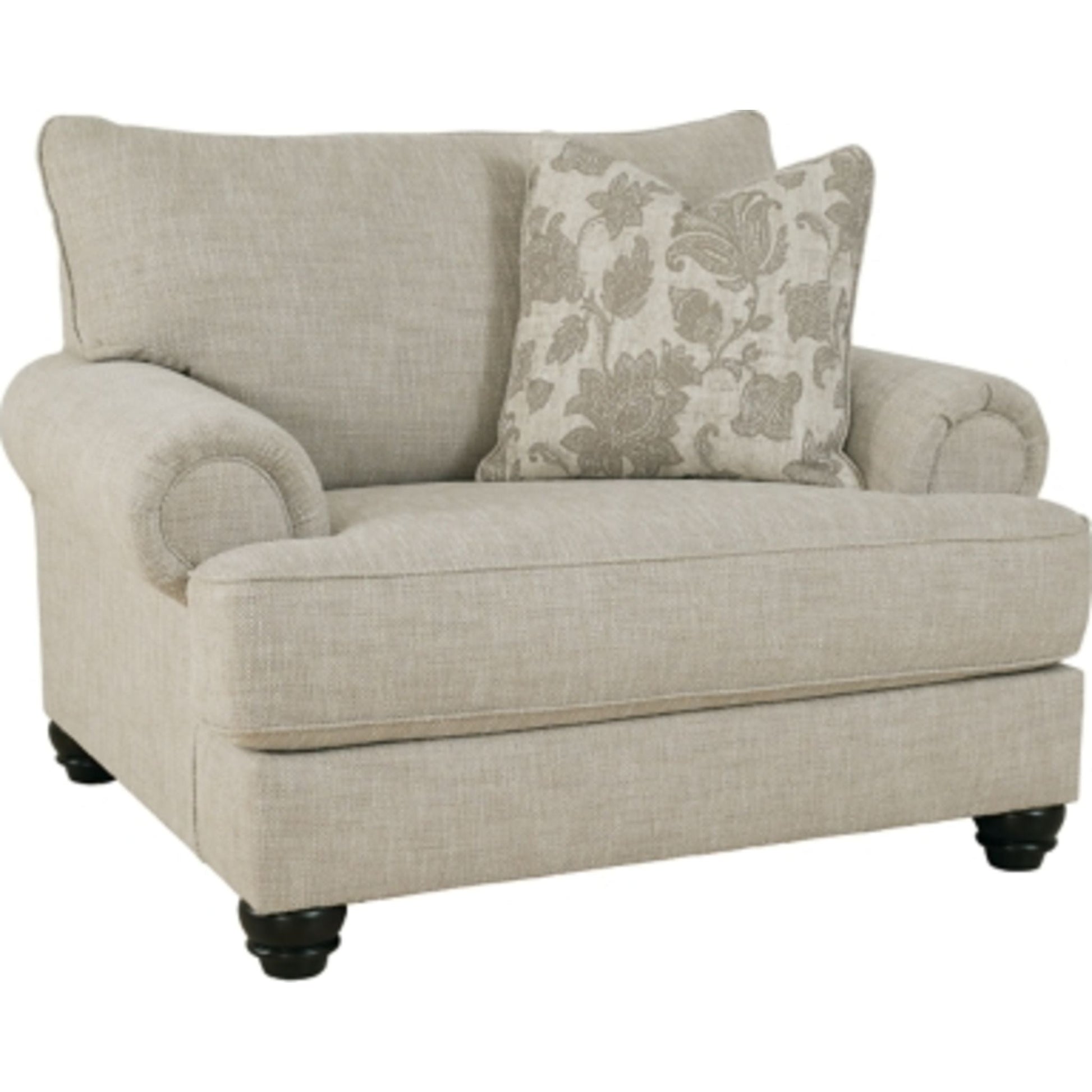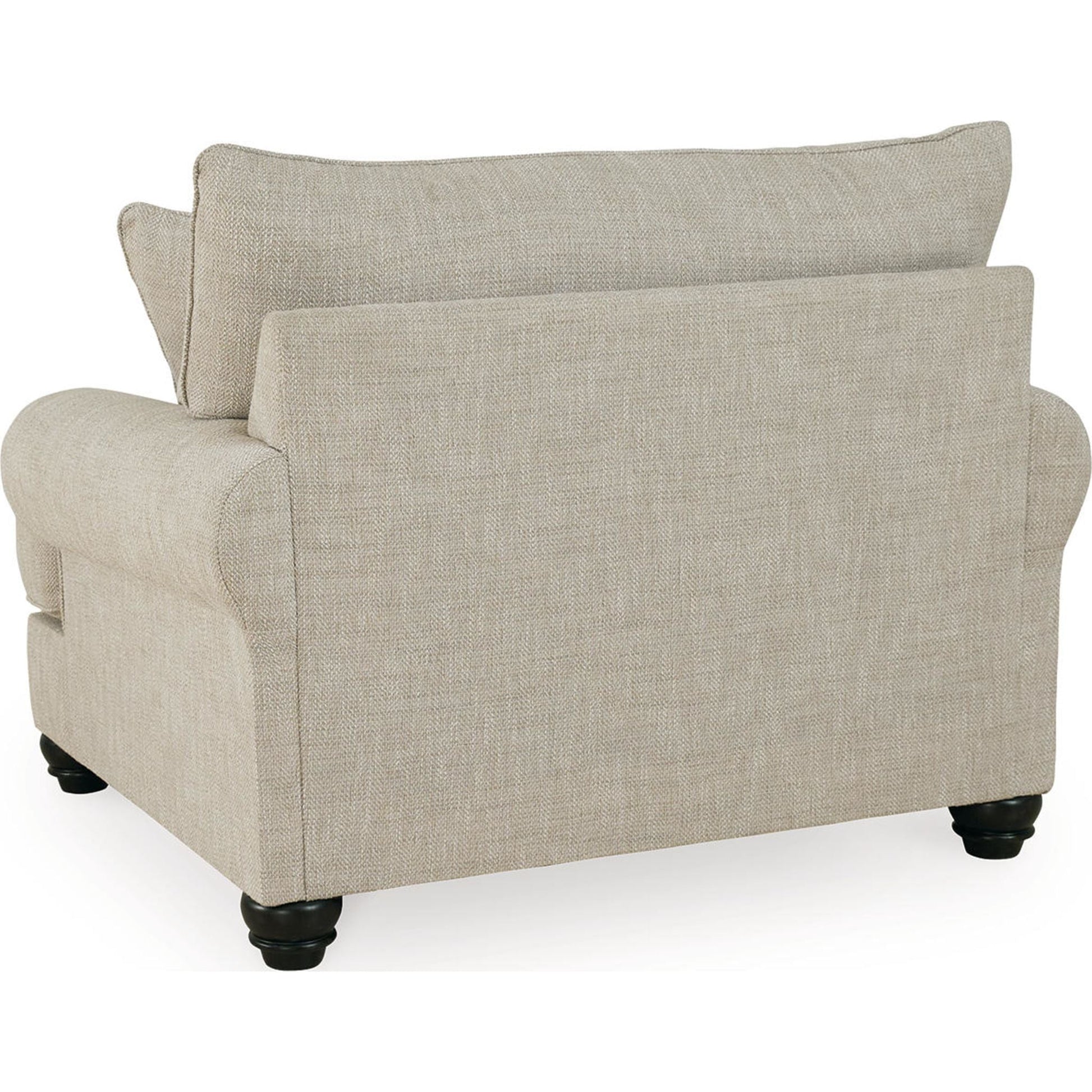 This oversized chair has an alluring look that's guaranteed to turn heads. Richly textured fabric in a light, easygoing hue is enhanced by even lighter flax peeking through. Distinctive roll arms add a dab of debonair, while indulgently plush cushions cradle you softly. Sit back and relax in comfort and style, with plenty of room to stretch out and unwind at the end of a long day.