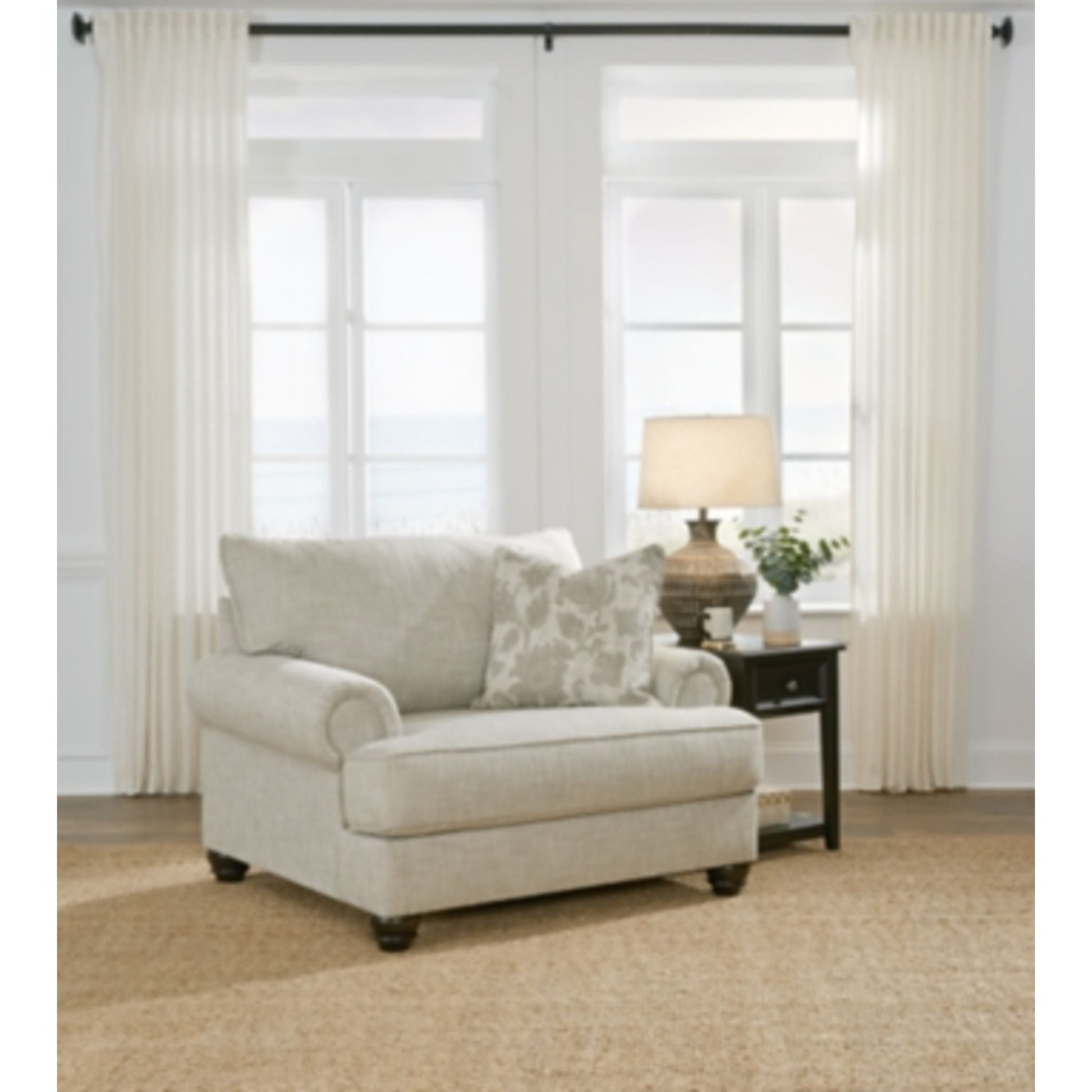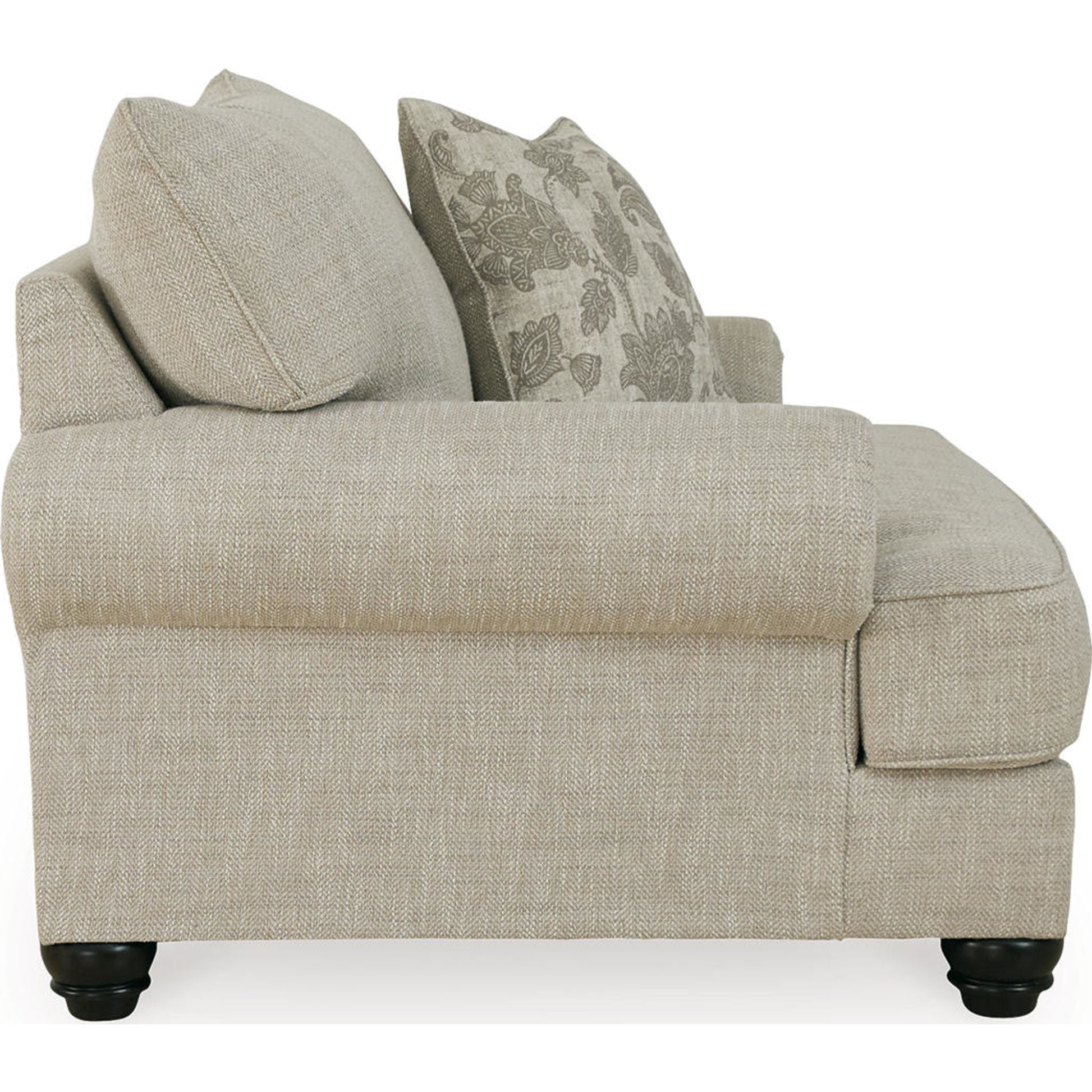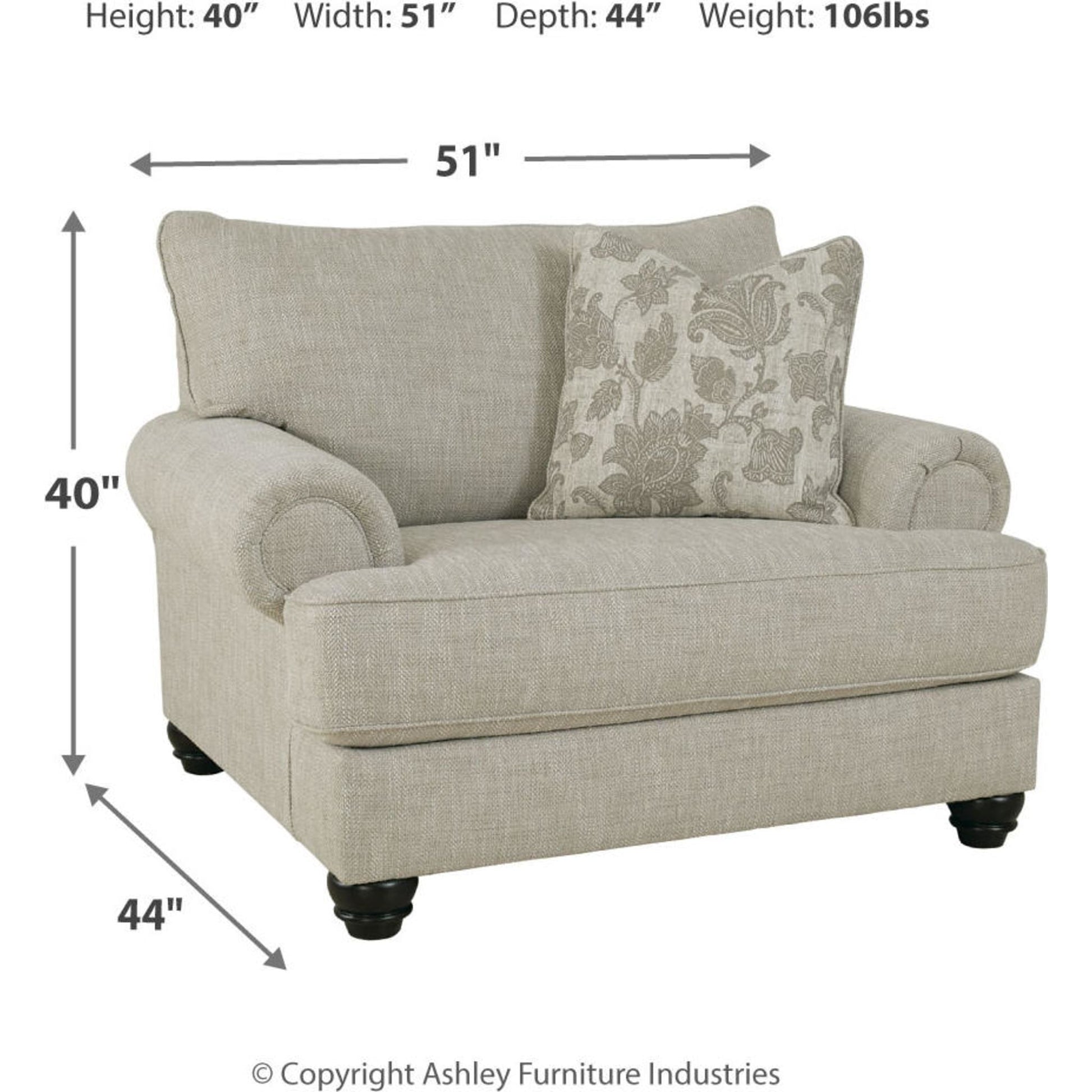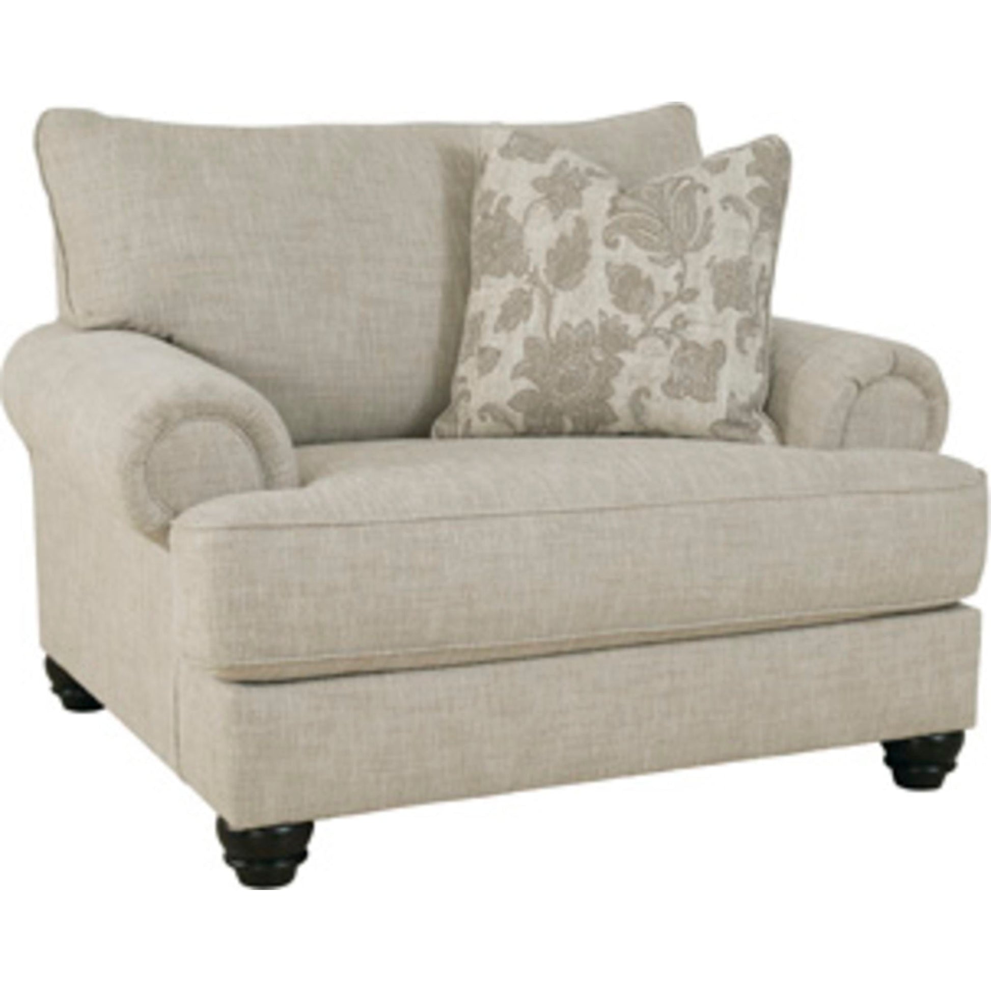 This oversized chair has an alluring look that's guaranteed to turn heads. Richly textured fabric in a light, easygoing hue is enhanced by even lighter flax peeking through. Distinctive roll arms add a dab of debonair, while indulgently plush cushions cradle you softly. Sit back and relax in comfort and style, with plenty of room to stretch out and unwind at the end of a long day.