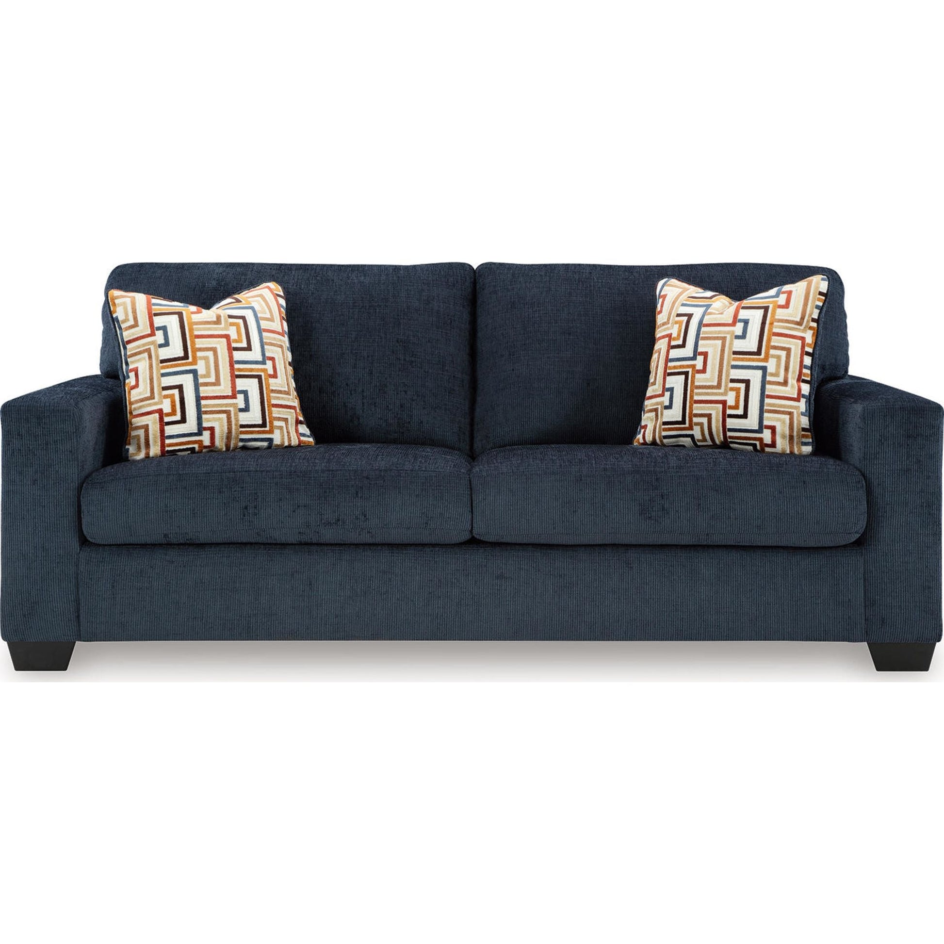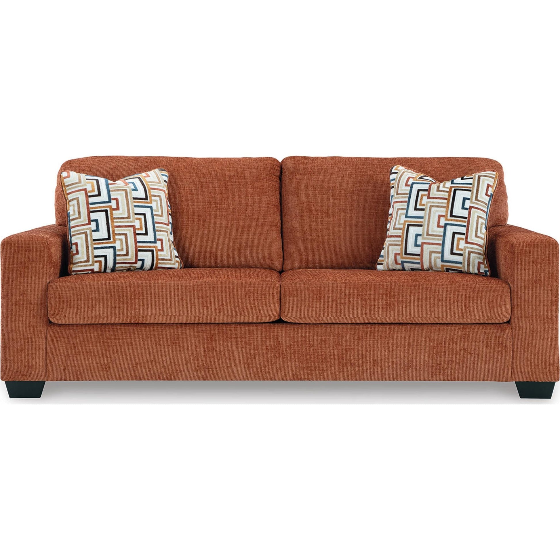 Looking to make a bold statement with color? Liven up your living room with the Aviemore sofa. Its trend-right burnt orange upholstery adds a playful pop of color to your decor. Bold and eclectic accent pillows complete the look. Pairing posh style with everyday comfort, this piece is a welcome addition to contemporary spaces.
