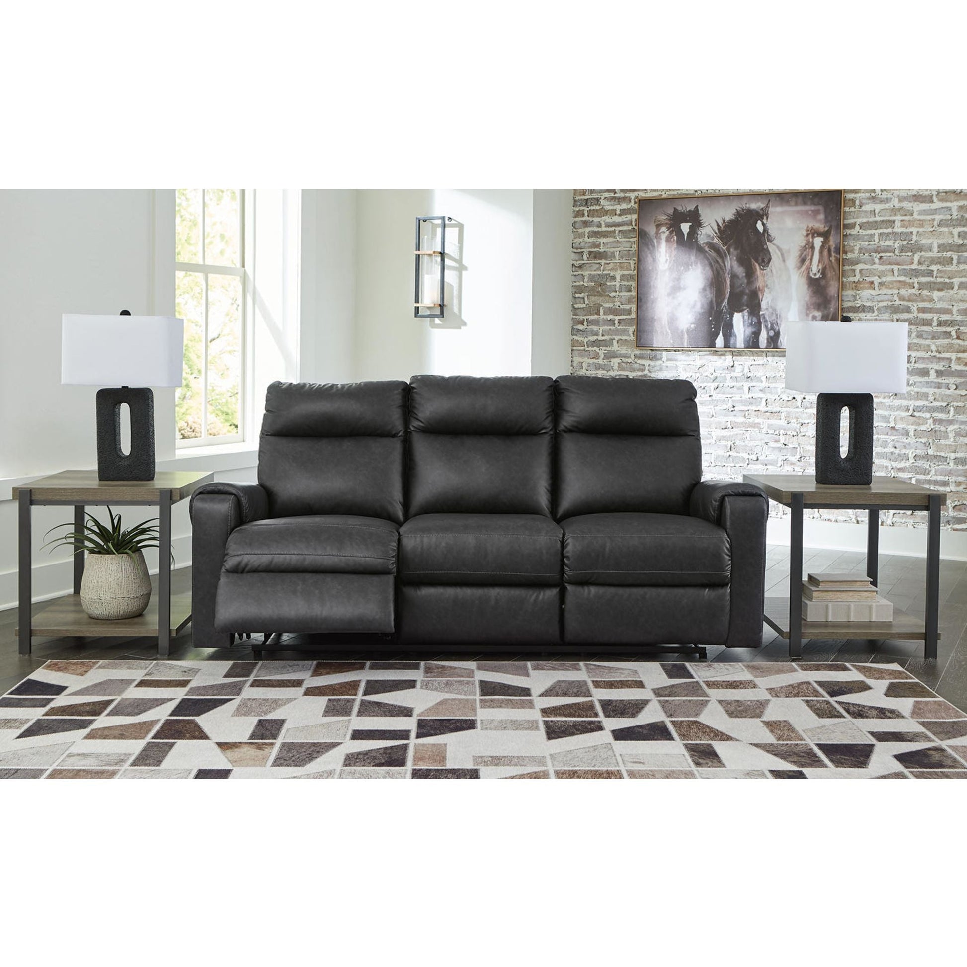 You don’t just want to recline. You want to recline in high design. This power reclining sofa’s clean lines and supple faux leather are out to capture your heart with style and comfort. It gives you the upscale look you want for less—simply take a seat, raise your legs and relax.