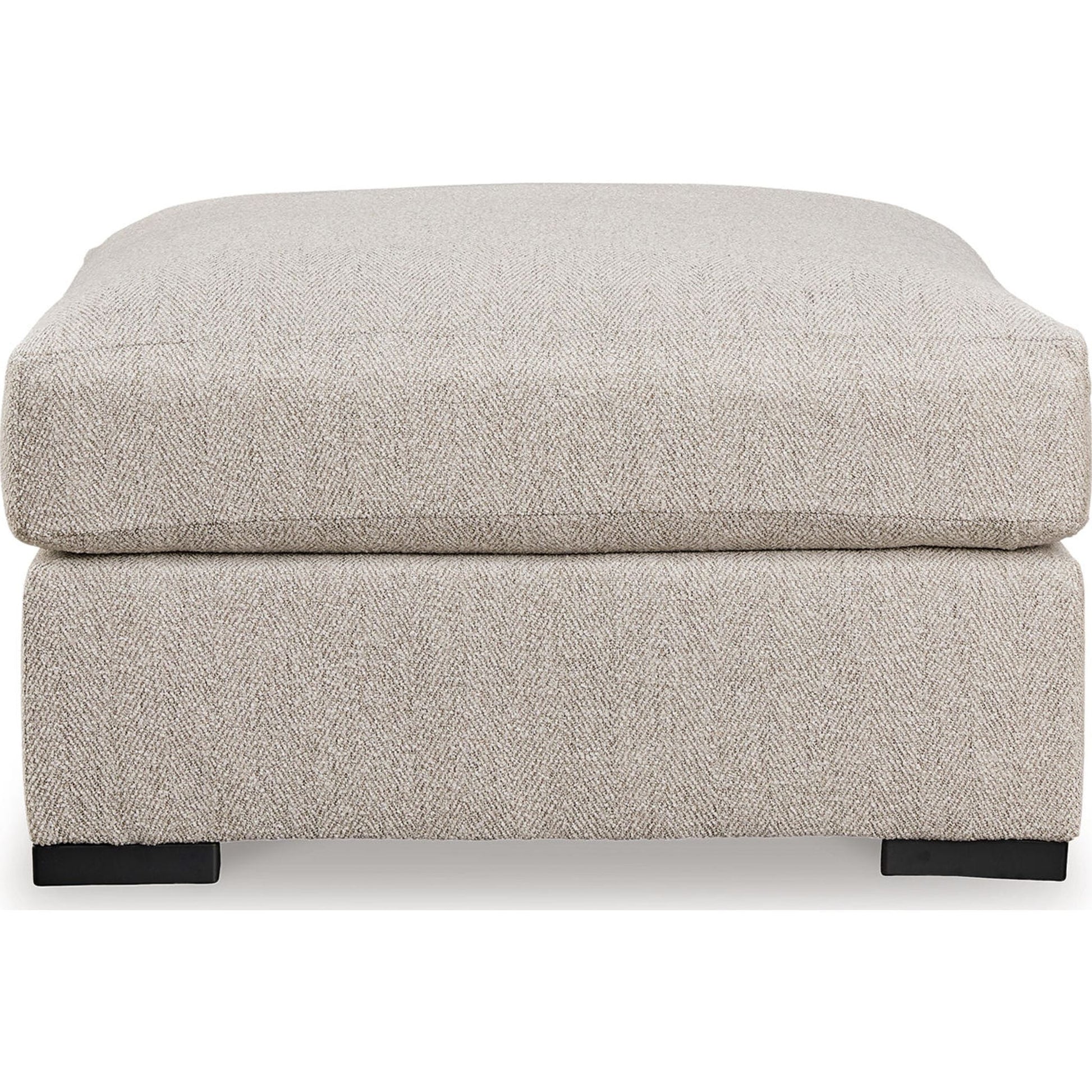 Reminiscent of a fine, subtly patterned herringbone jacket, this casually elegant ottoman offers contemporary style in spades. Its oversized silhouette provides plenty of leg room, while a soft feather-blend top cushion maximizes relaxation. Why skimp on comfort and style? With this ottoman, you have plenty of room to rest your feet and unwind.