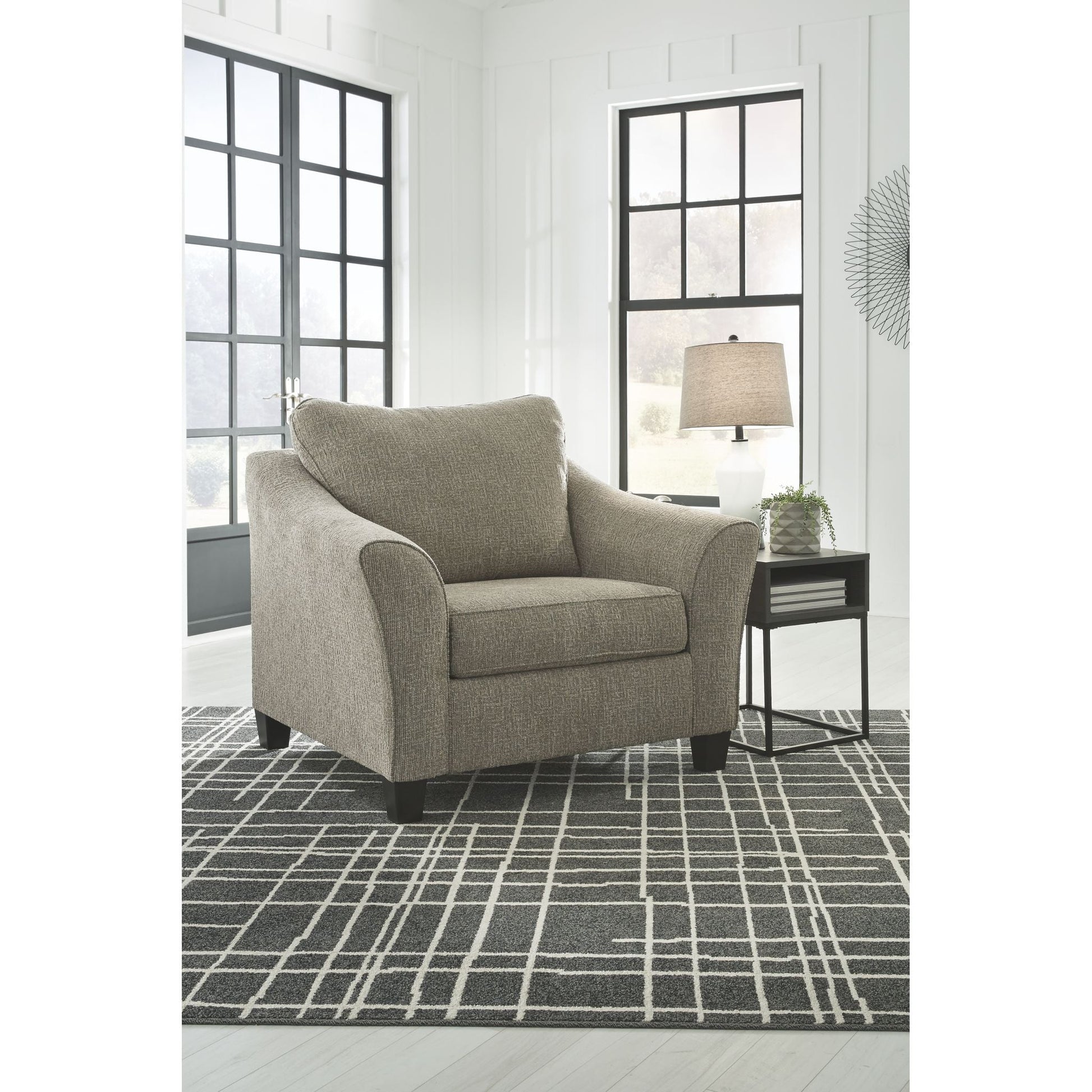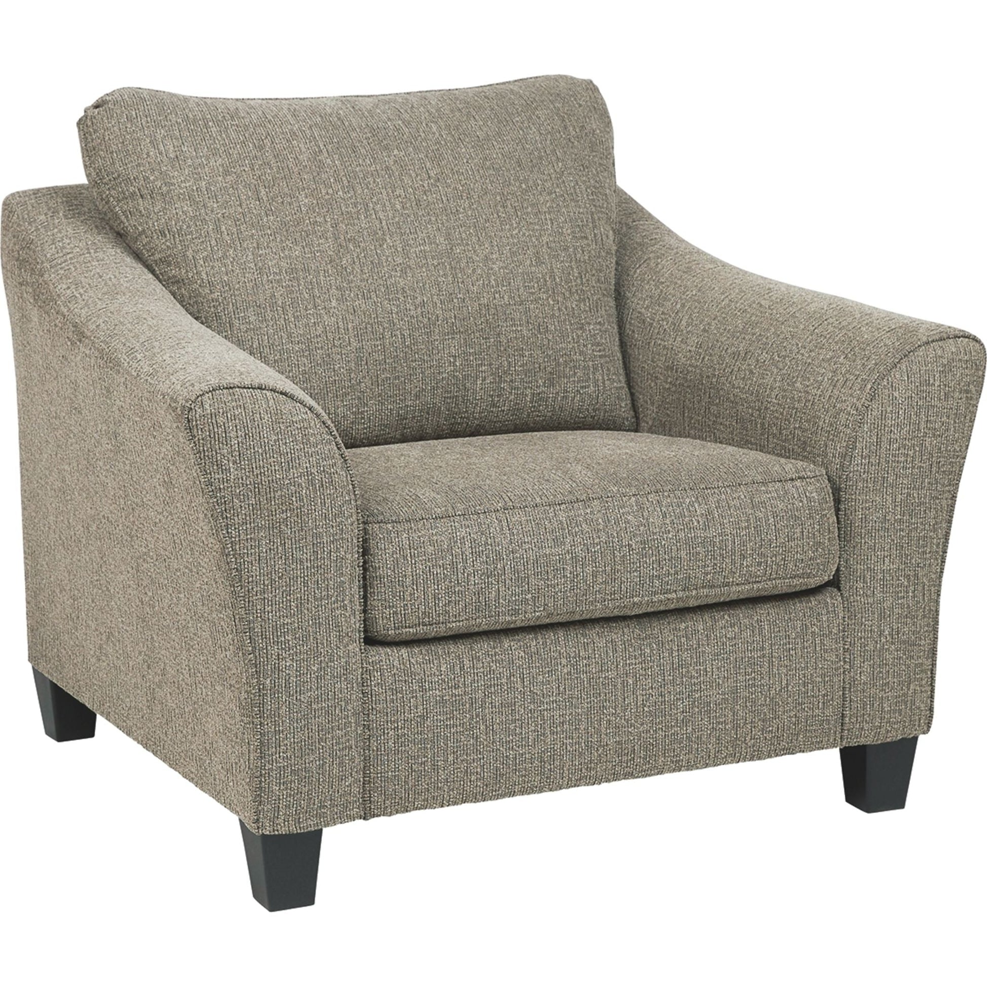 This chair sets the scene for a modern space full of casual flair. Enticing with a textured taupe upholstery with a rich chenille feel, this chic seat masters the art of neutrality. Gently flared arms and plush seat cushions perfect the feel-good experience.
