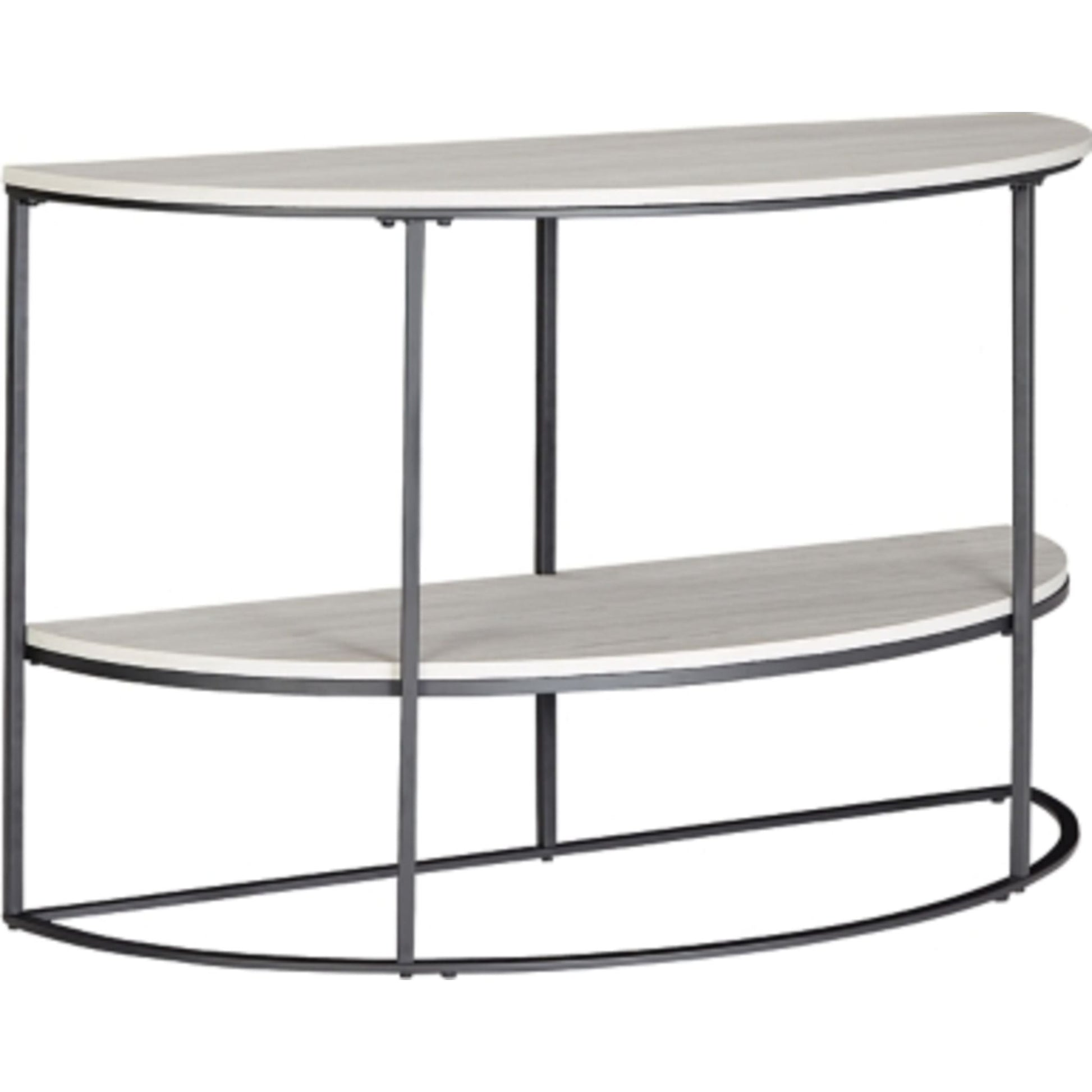 Entertain with ease with this casual, contemporary sofa table. Designed for the modern tastemaker, the minimalist design wows with metal legs and a laminated surface with a whitewashed effect. A lower display shelf provides ample space for books and baskets, or for showcasing your special decor accessories.