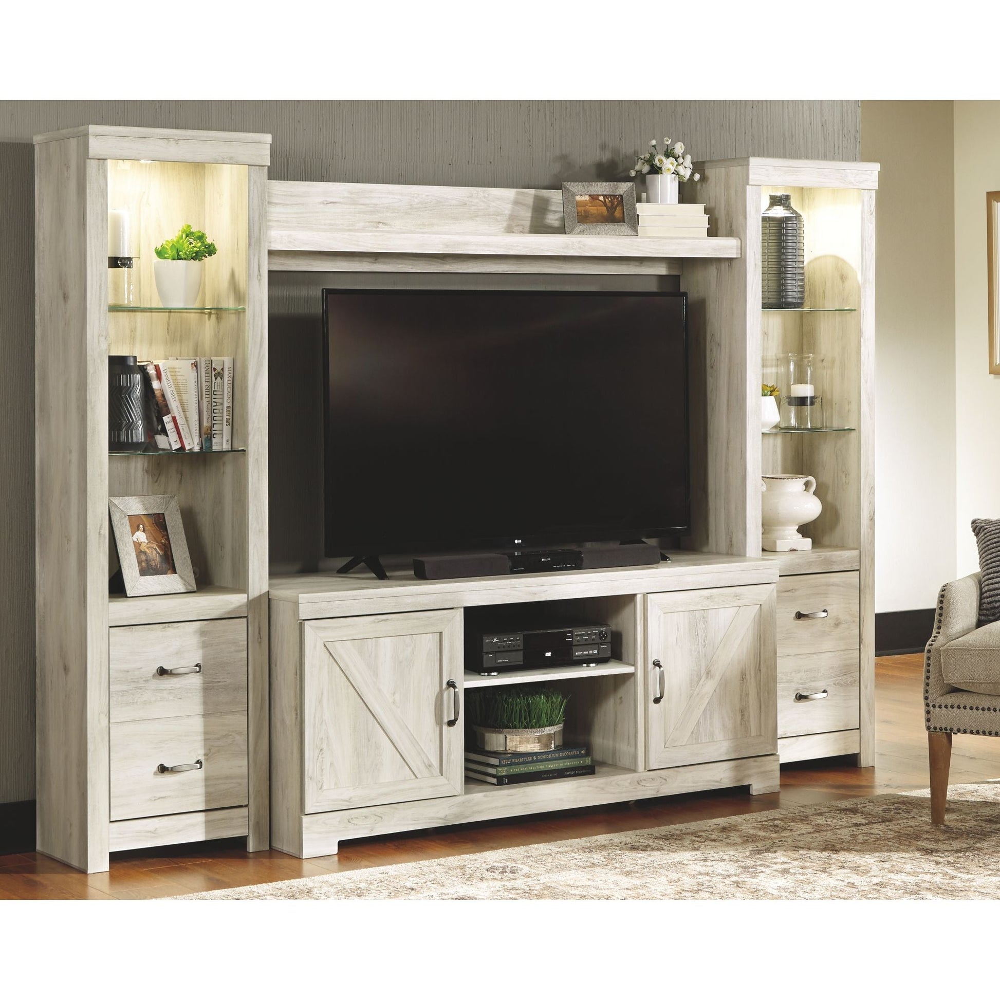 Express your farmhouse style with this entertainment center. Wispy white finish over replicated oak wood grain is a delightful change from the ordinary. Clean-lined, classic styling with barn door inspiration provides a country chic aesthetic that’s a breath of fresh air. Combination of cabinet storage and open display space with LED lighting makes for just the right mix.