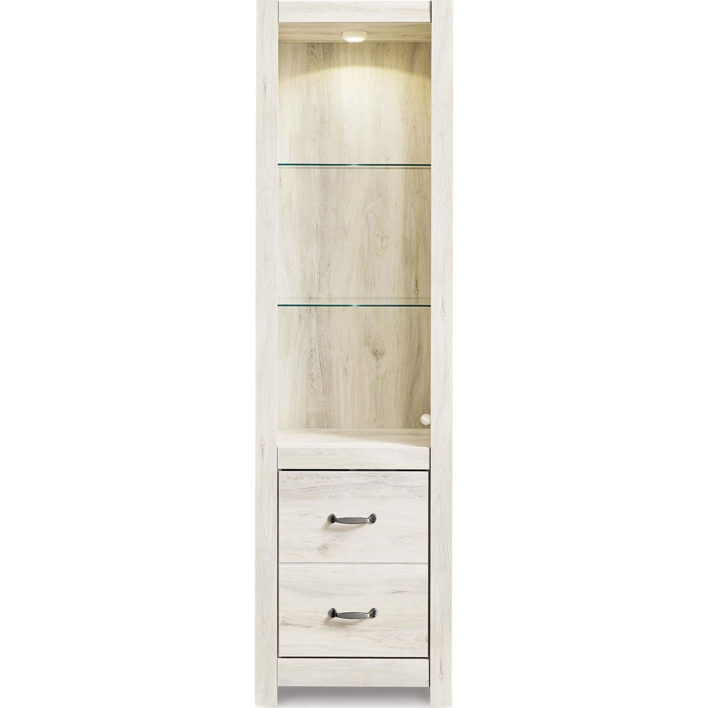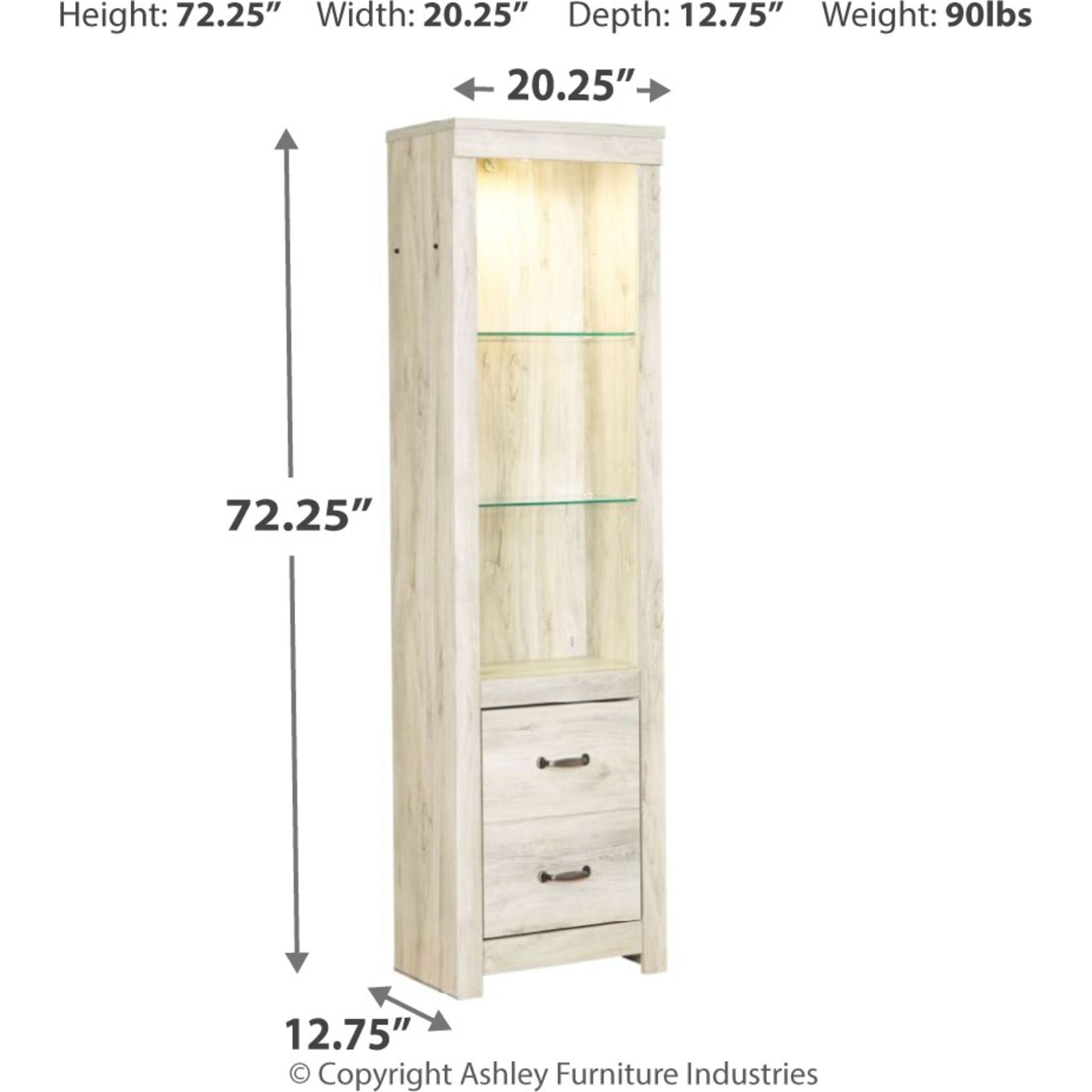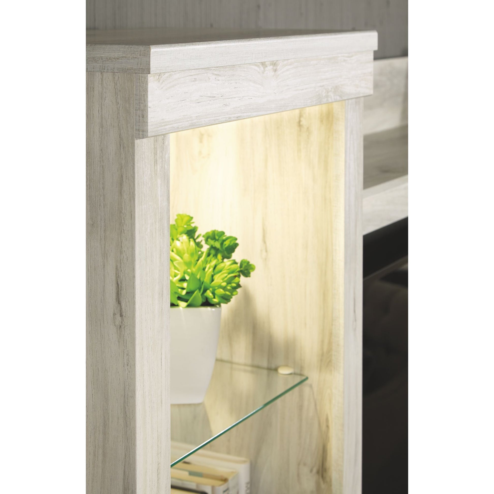 Express your farmhouse style with the Bellaby TV pier. Its wispy white finish over replicated oak wood grain is a delightful change from the ordinary. Clean-lined styling gives the country chic aesthetic a fresh, contemporary appeal. The reversible door can open left or right with consumer assembly modification.