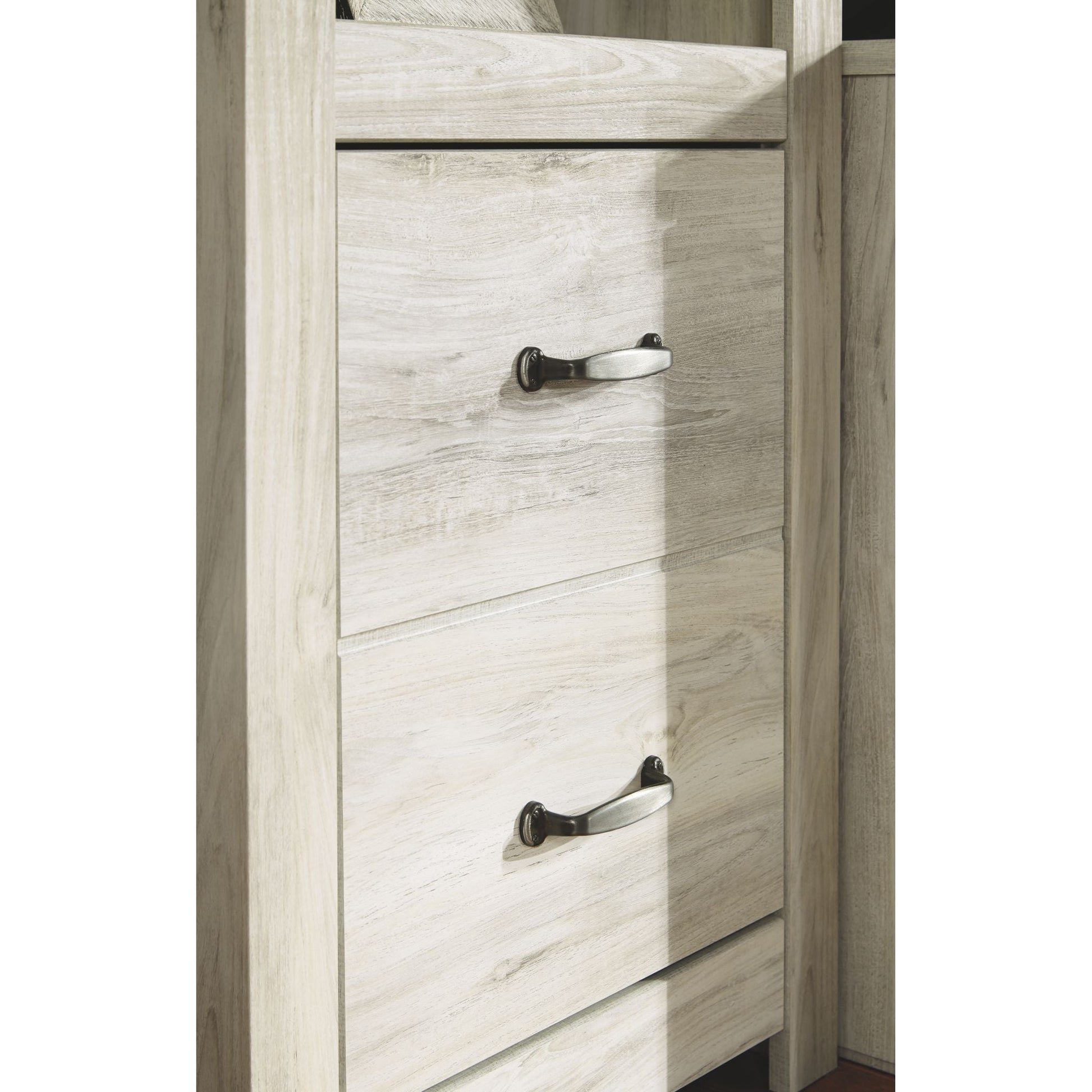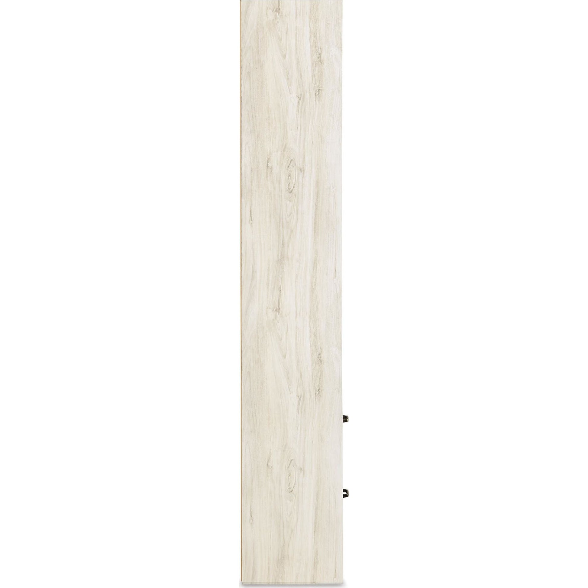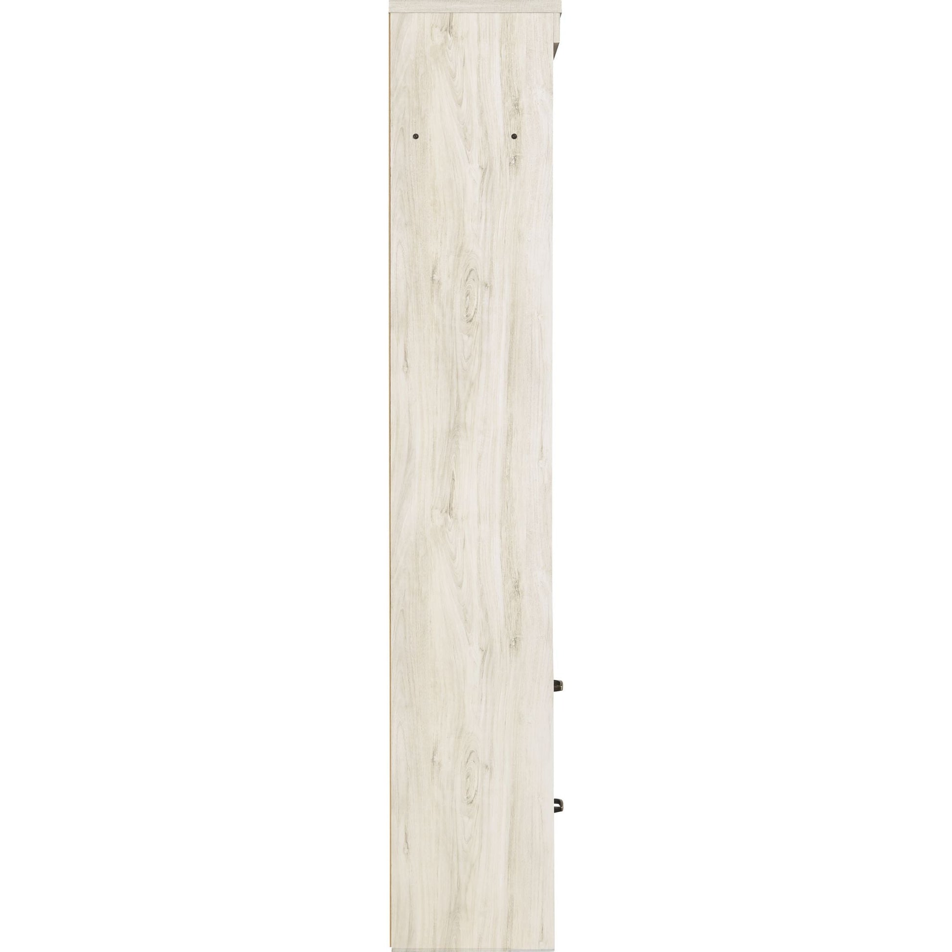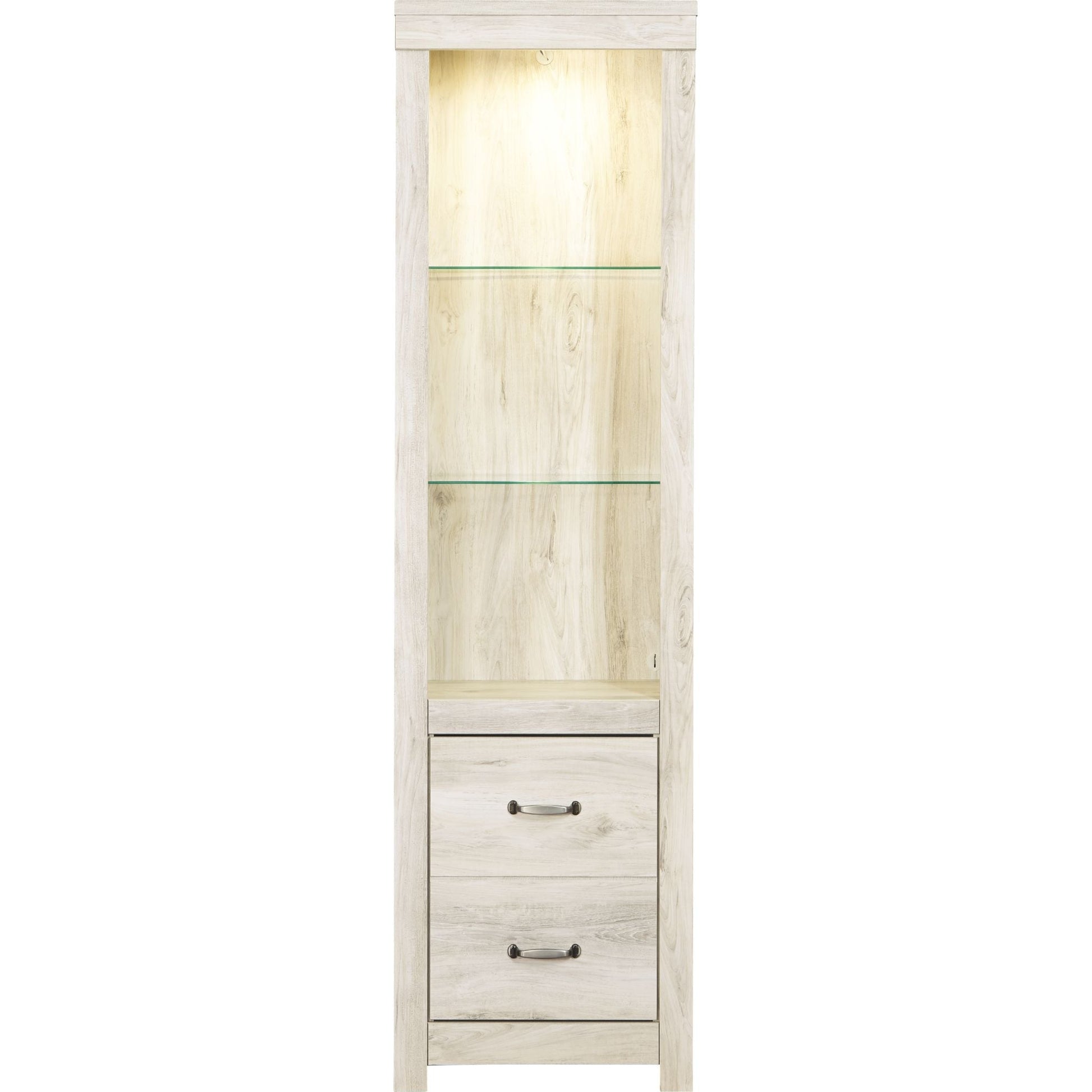 Express your farmhouse style with the Bellaby TV pier. Its wispy white finish over replicated oak wood grain is a delightful change from the ordinary. Clean-lined styling gives the country chic aesthetic a fresh, contemporary appeal. The reversible door can open left or right with consumer assembly modification.