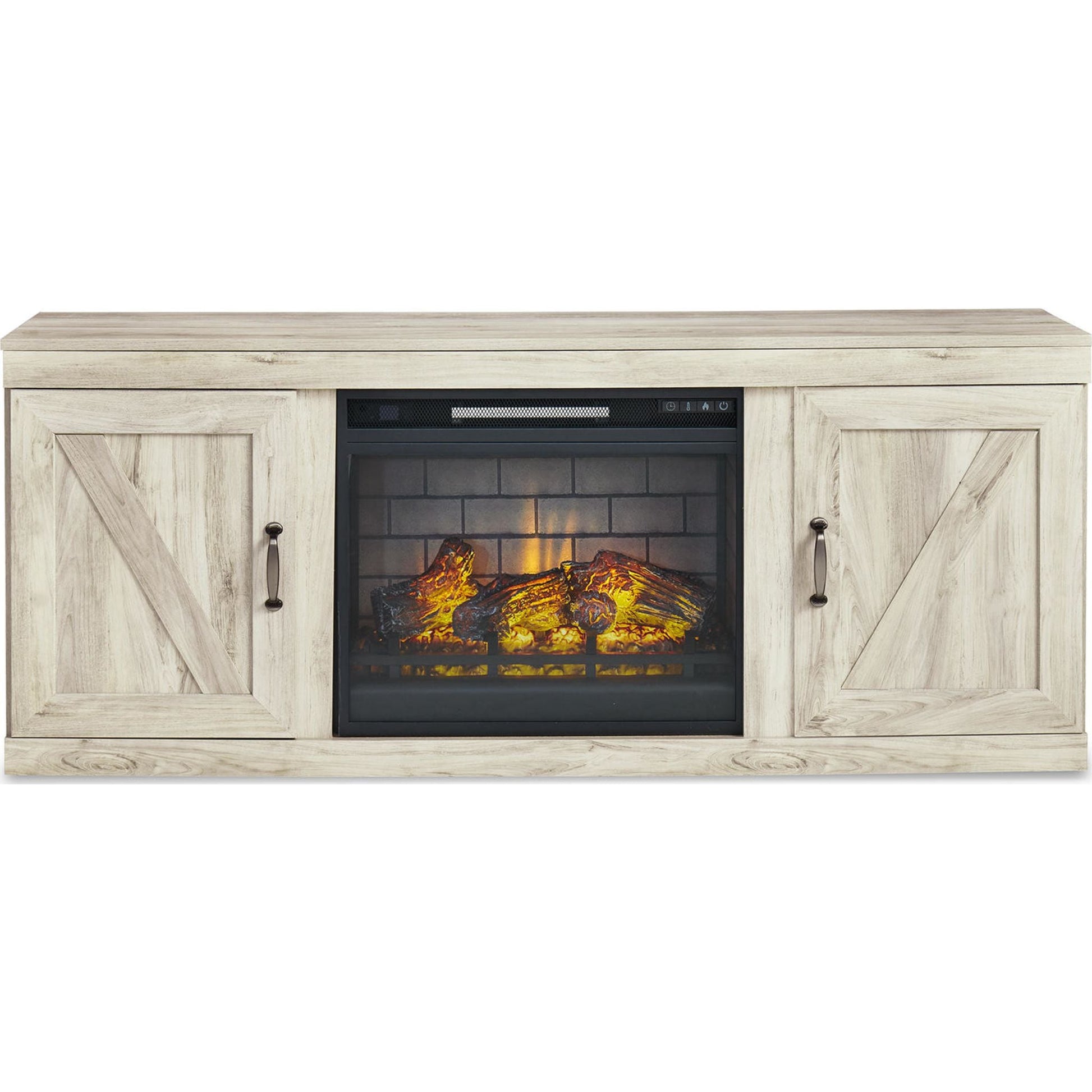 Express your modern farmhouse style with this TV stand with fireplace. Its wispy white finish over replicated oak grain is a delightful change from the ordinary. The clean-lined, classic styling with barn door inspiration provides a country-chic aesthetic that’s a breath of fresh air. What really turns up the heat: an electric infrared fireplace insert with faux firebrick surround that operates with or without infrared heat. With the touch of a button, adjust the temperature and the flame brightness, and set the timer for long-lasting enjoyment.