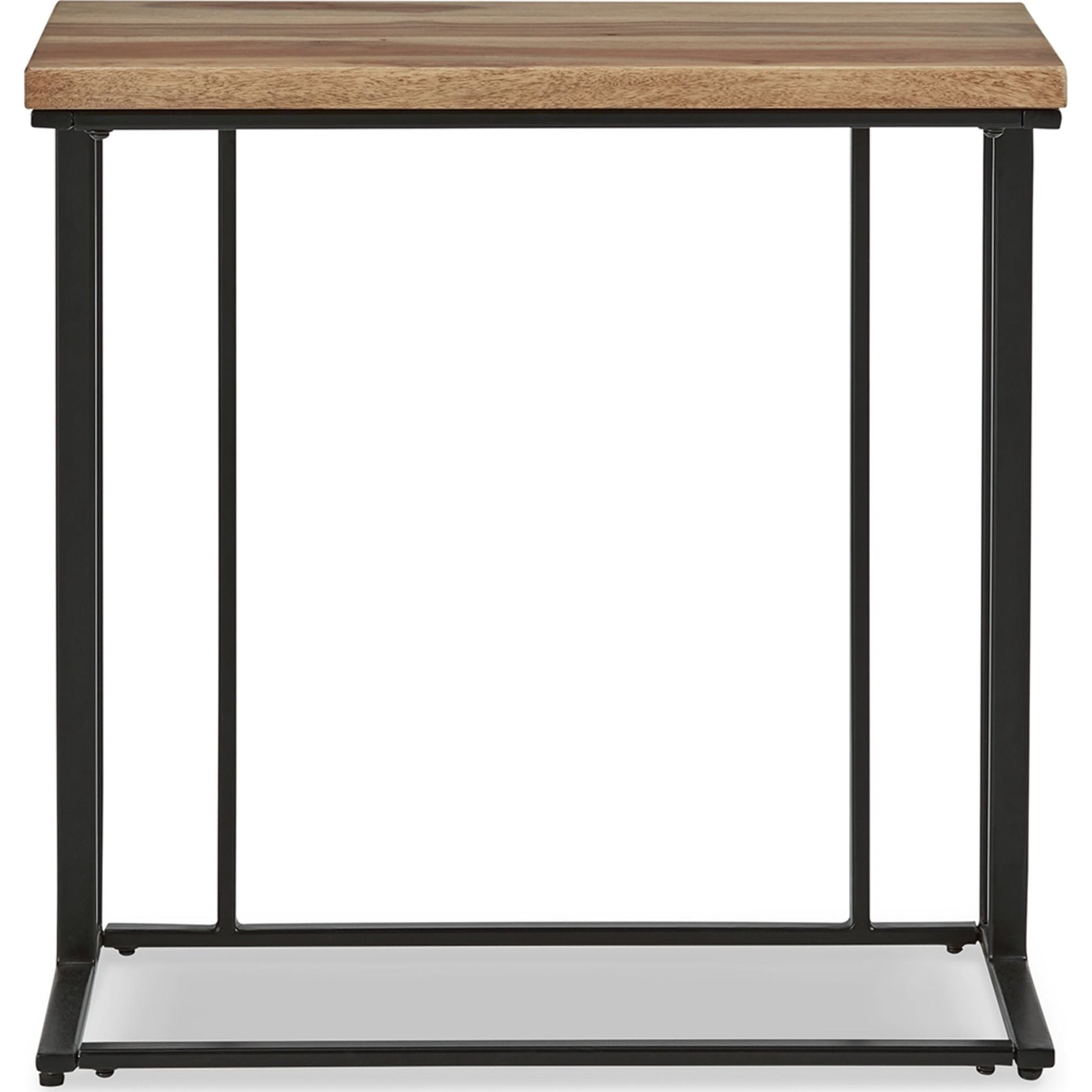 In a beautiful blend of solid woods with unique color variations, this chairside end table is a refreshing nod to nature. Its teak wood top in a light, fresh natural finish exudes a relaxed sensibility and organic feel, contrasting with the sleek black metal frame. The clever C-shape design turns the table on form and function for an instant workspace or entertaining solution. Equally at home in casually cool and urban chic settings, this table is a natural fit.