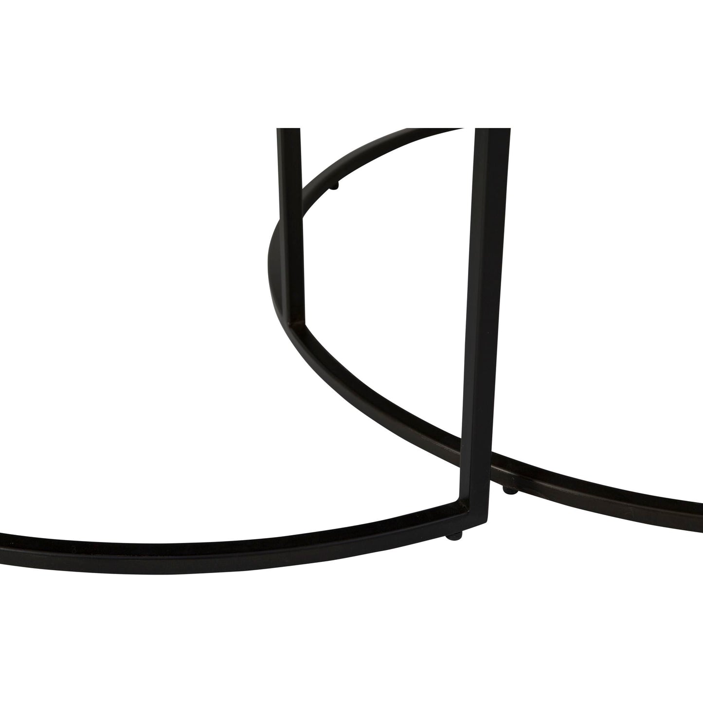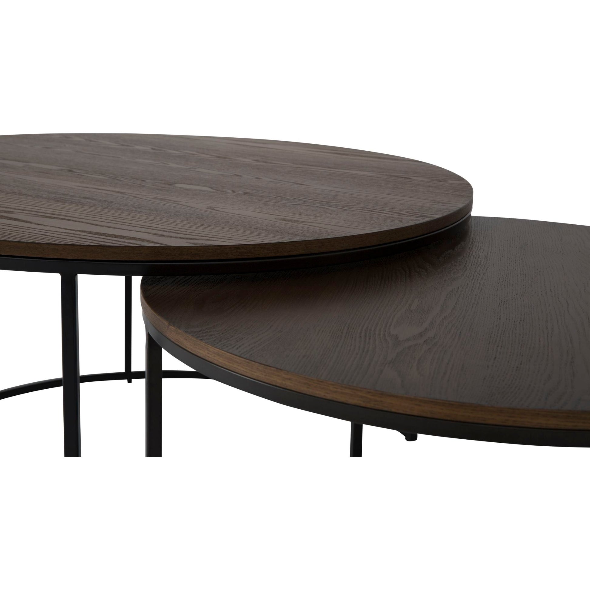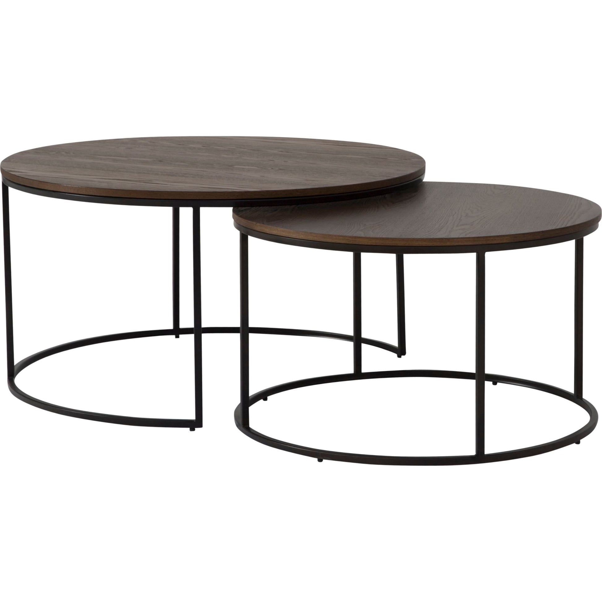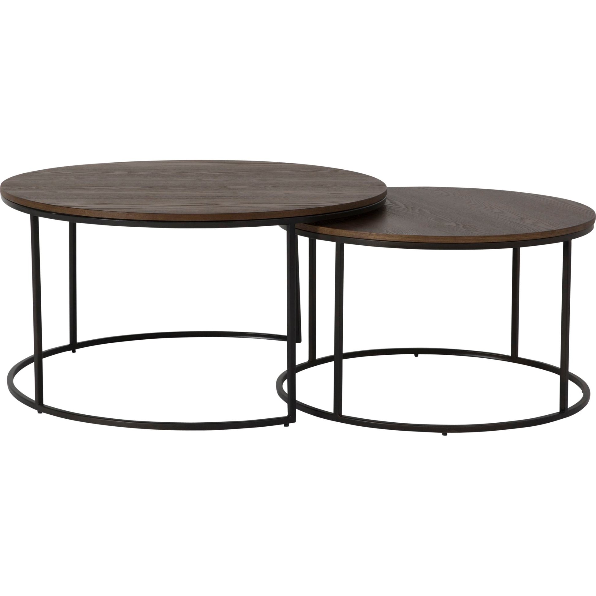 Round wood and metal nesting tablesAsh veneer top in rustique natural finishMetal base in black finish