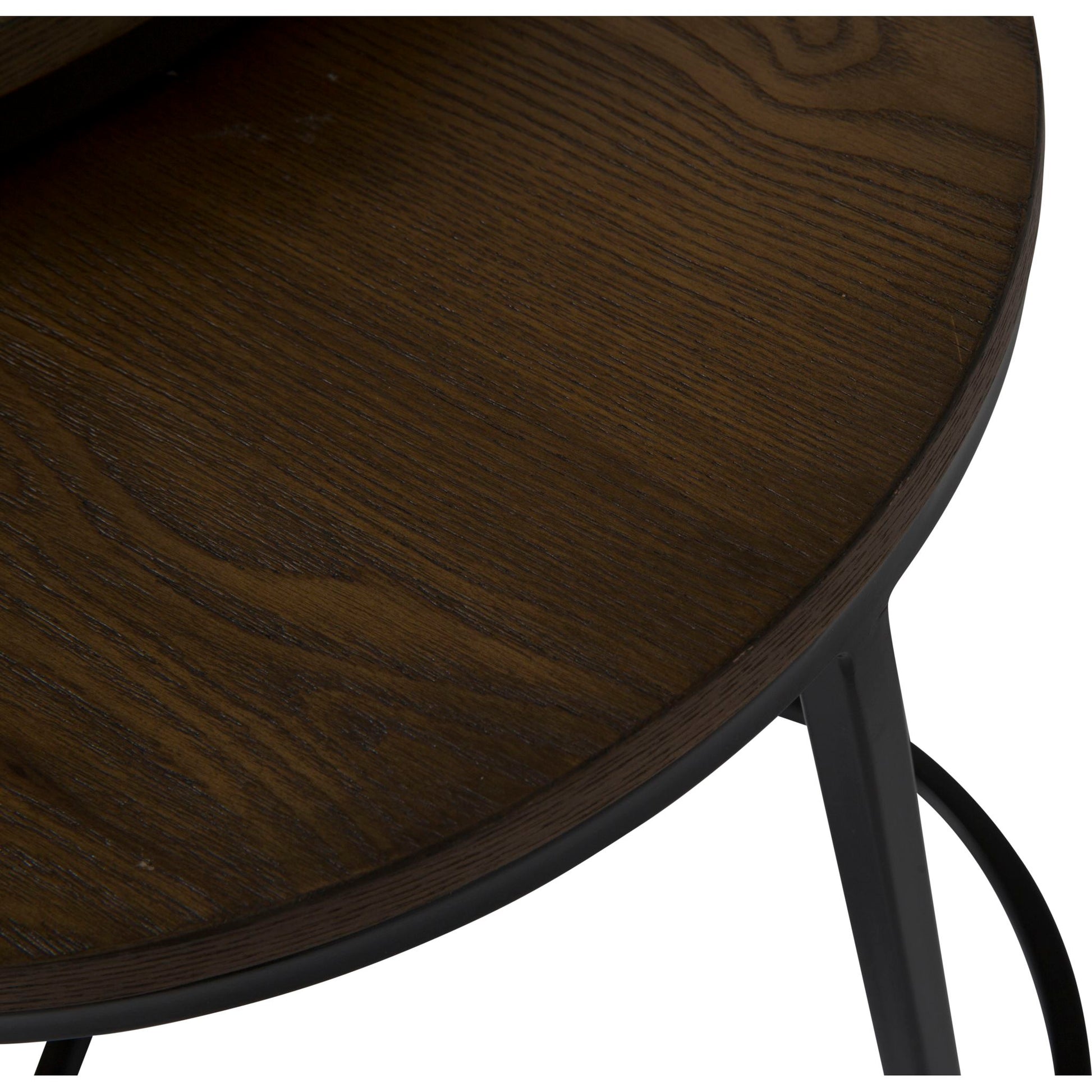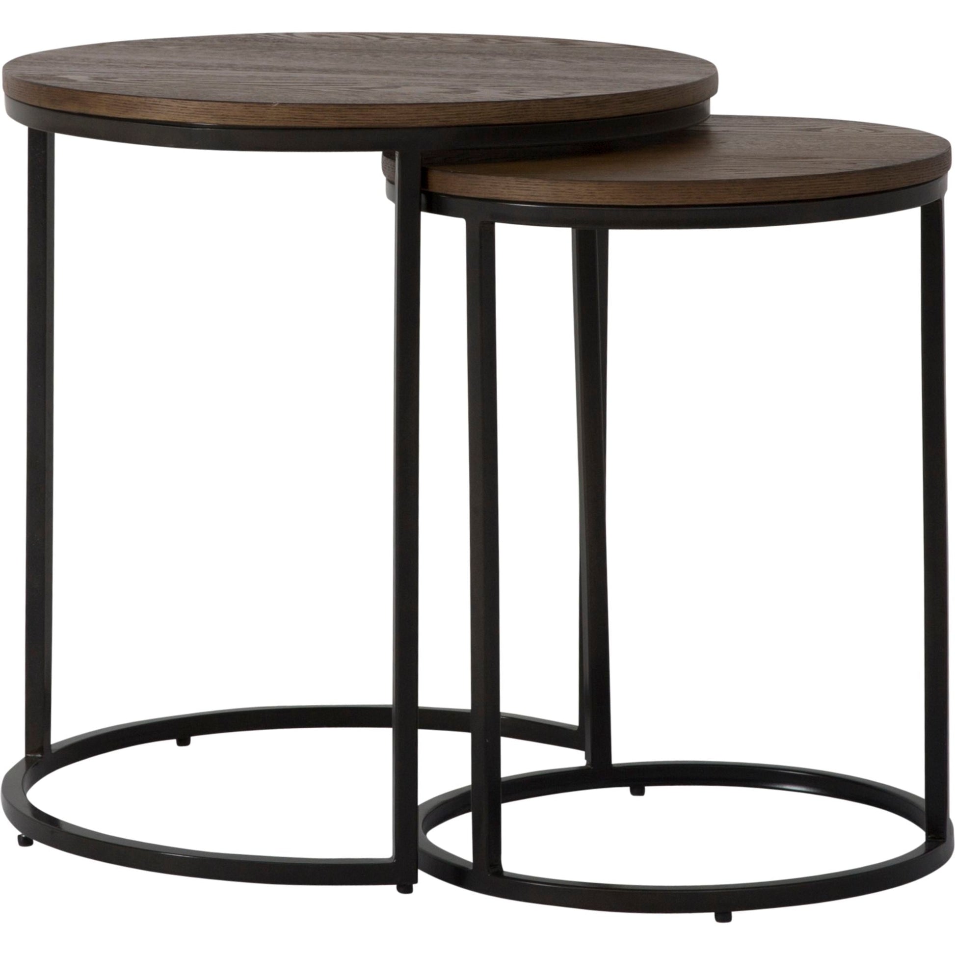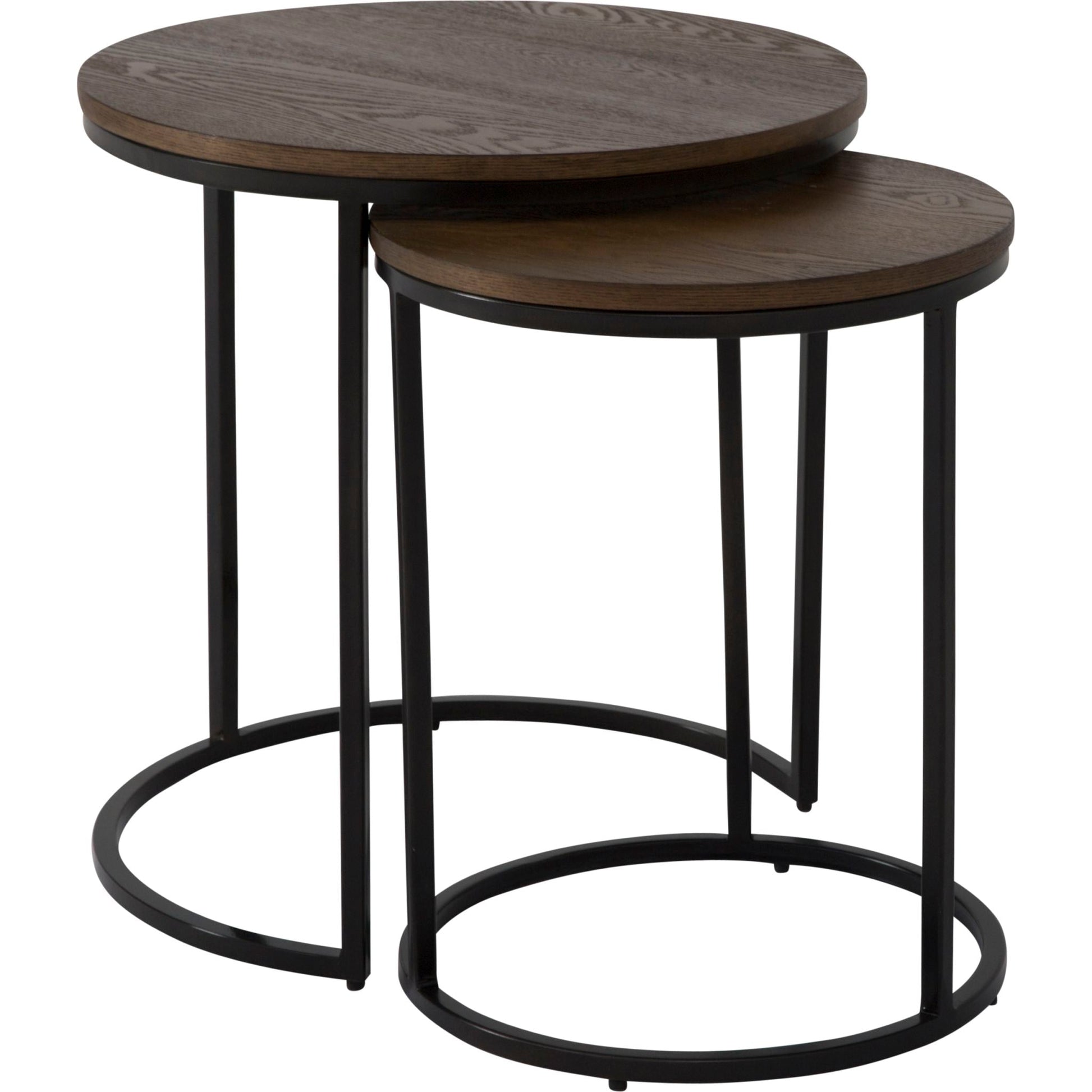 Round wood and metal nesting tablesAsh veneer top in rustique natural finishMetal base in black finish