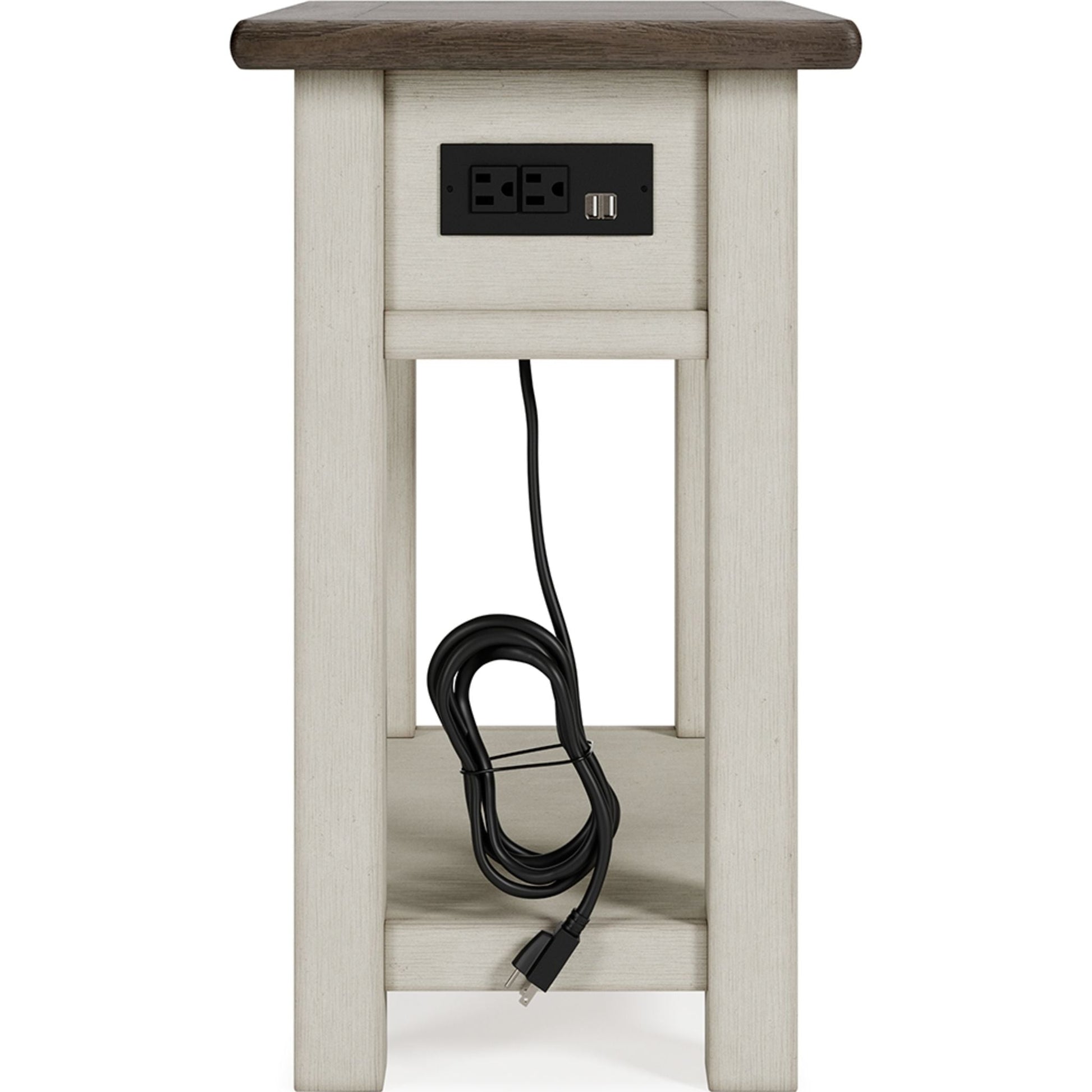 Whether your style is farmhouse fresh, shabby chic or country cottage, you’ll find this chairside end table dressed to impress. Its two-tone finish pairs weathered oak with antique white for that much more quaint character. Charming elements include a plank-and-frame style top, black faceted hardware and a smooth-gliding drawer for remote controls and more. Integrated power supply with dual USB charging ports is ideal for keeping your personal devices at the ready.