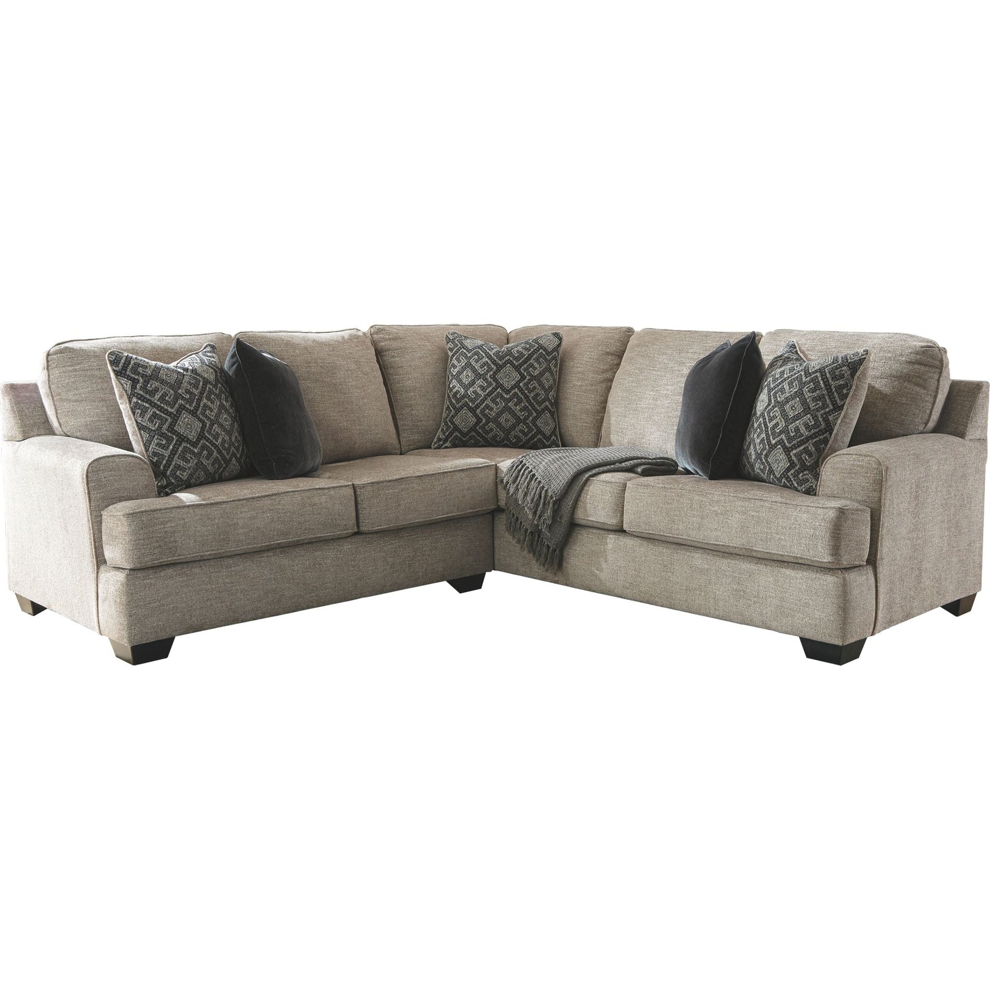 Whether your vision is clean and contemporary or cozy modern farmhouse, this sectional in a stone-tone neutral upholstery has the corner on style. Merging ultimate comfort with striking good looks, this chic sectional includes five coordinating accent pillows for that much more feel-good allure.
