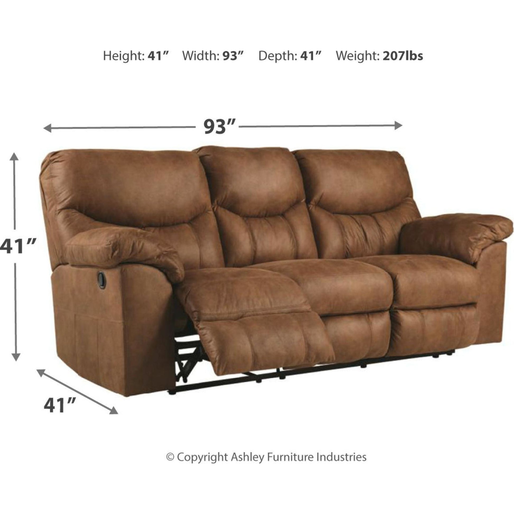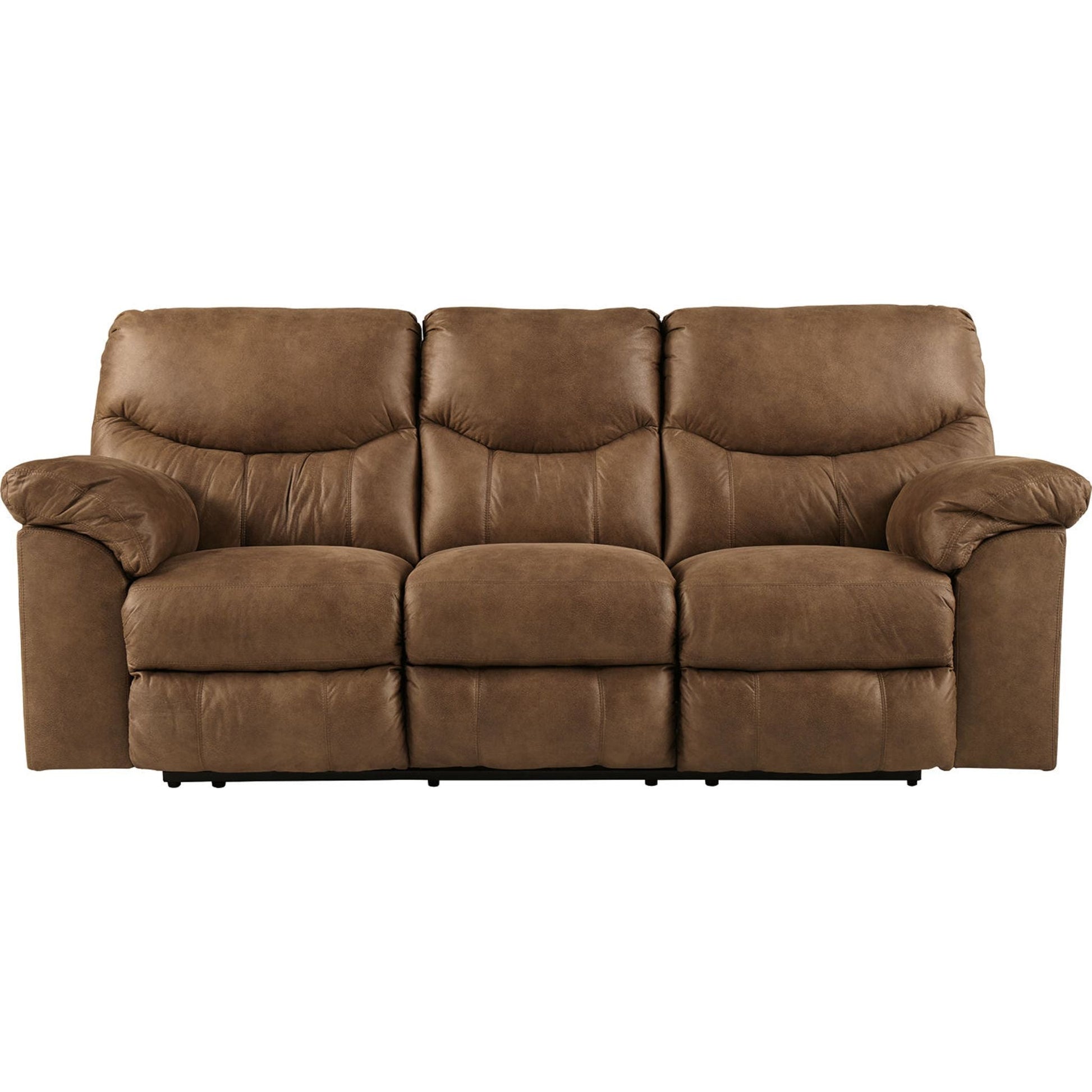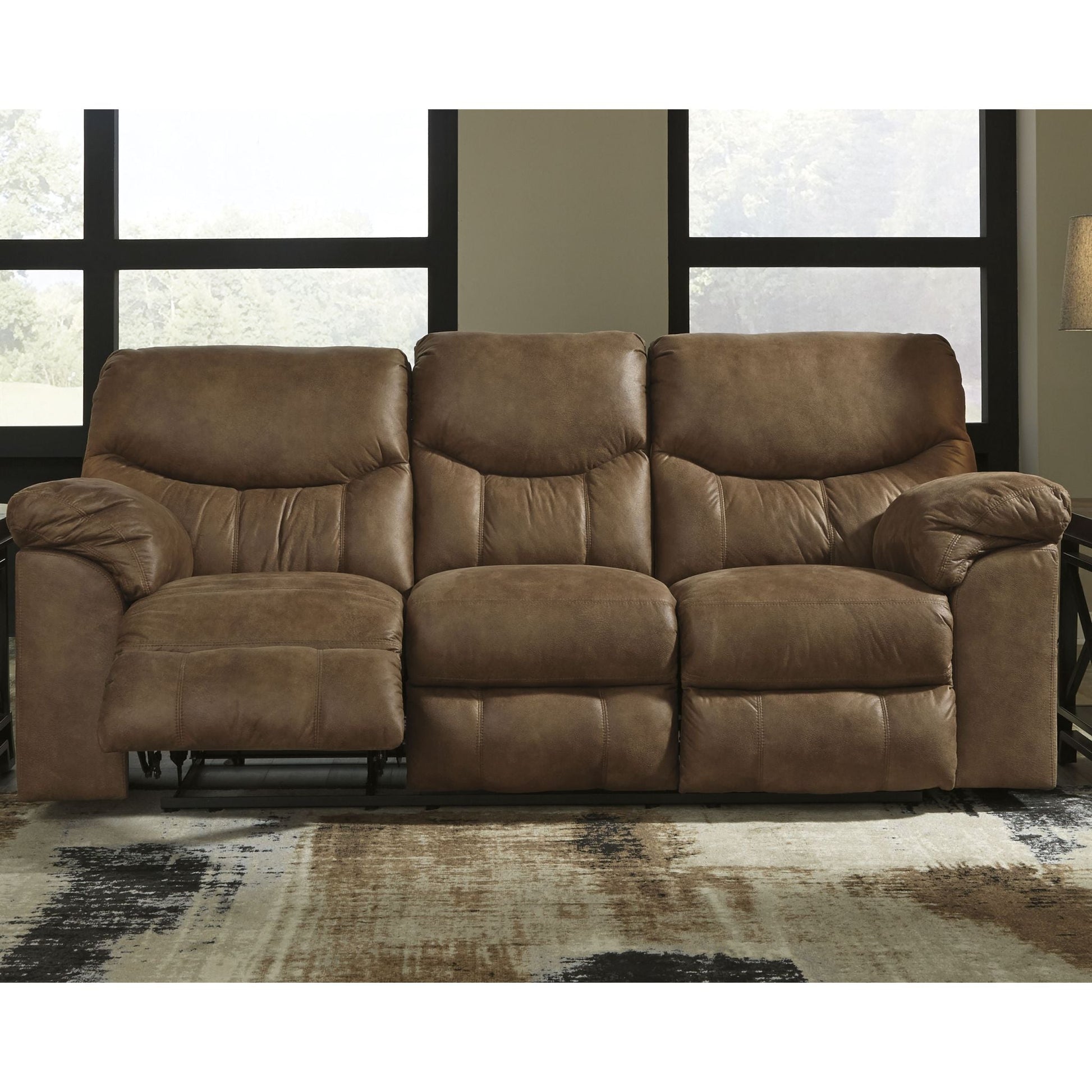Rock the cool look of leather minus the hefty price tag with this reclining sofa. Rich with tonal variation, the indulgently soft upholstery sure looks like the real thing. And talk about indulgent comfort. Double stuffed armrests and sumptuous cushions cradle and support in all the right places. Distinctive scooped stitching enhances this reclining sofa’s contemporary flair.