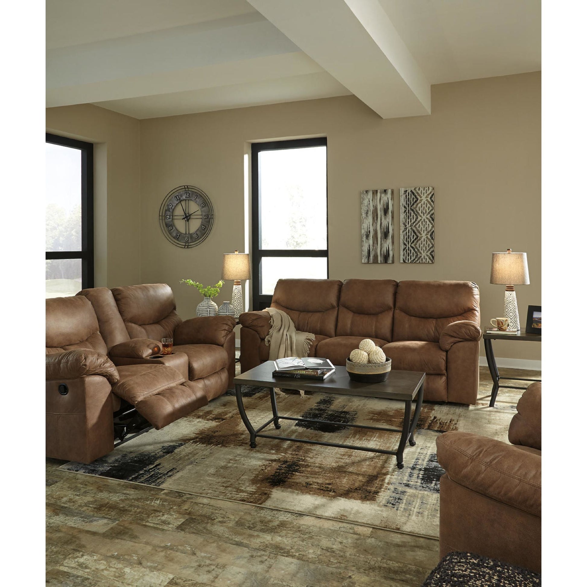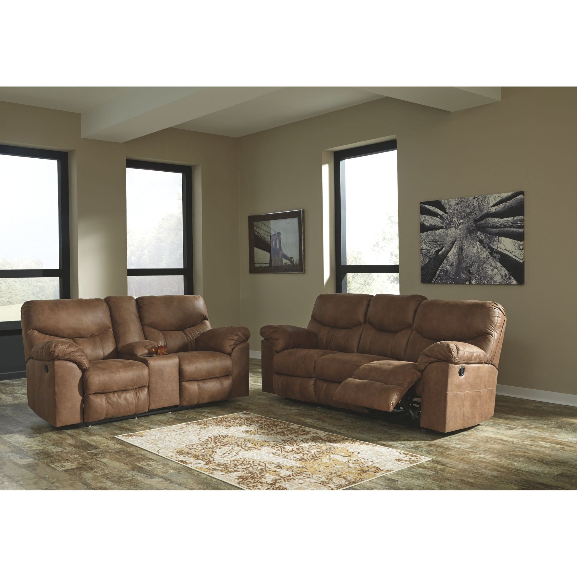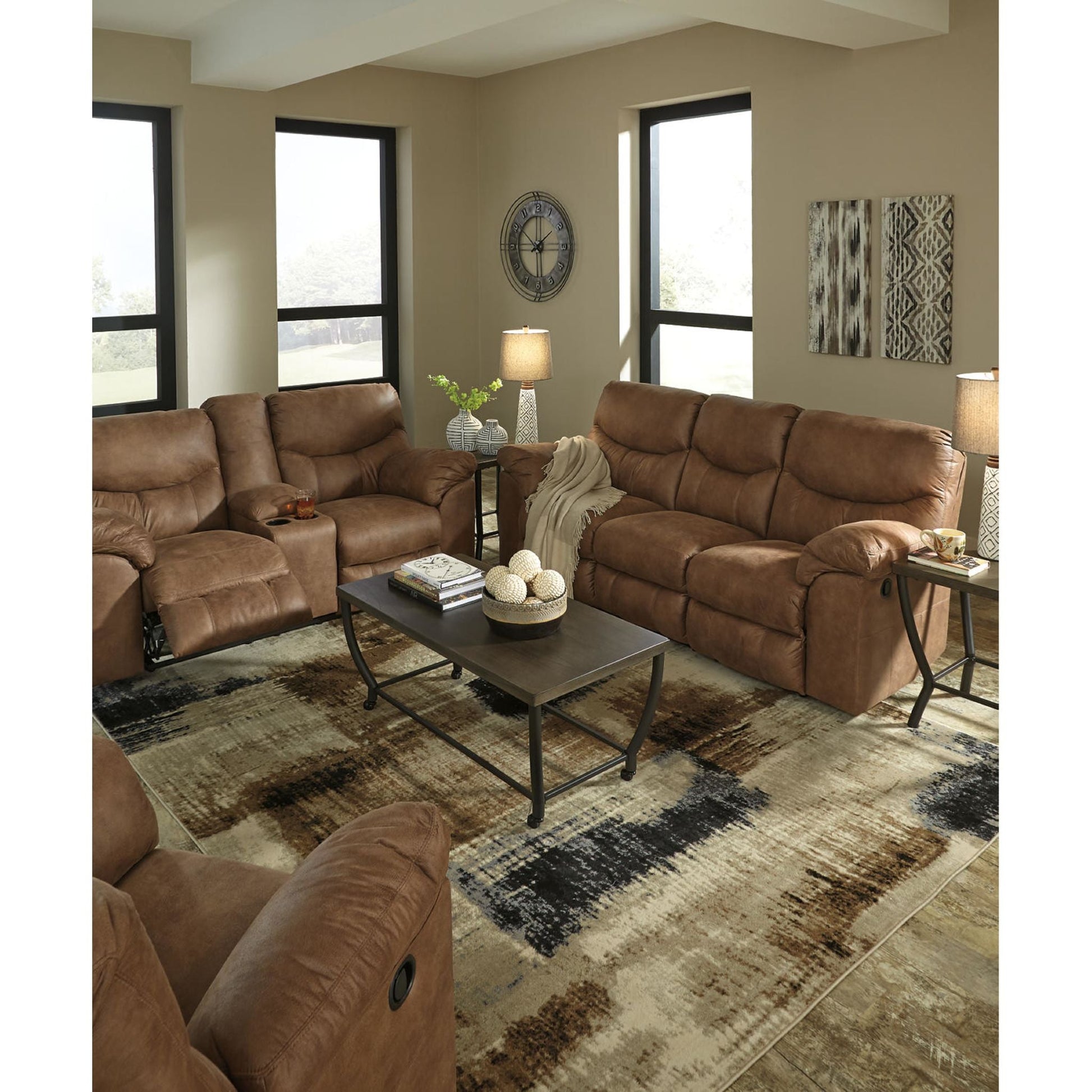 Rock the cool look of leather minus the hefty price tag with this reclining sofa. Rich with tonal variation, the indulgently soft upholstery sure looks like the real thing. And talk about indulgent comfort. Double stuffed armrests and sumptuous cushions cradle and support in all the right places. Distinctive scooped stitching enhances this reclining sofa’s contemporary flair.